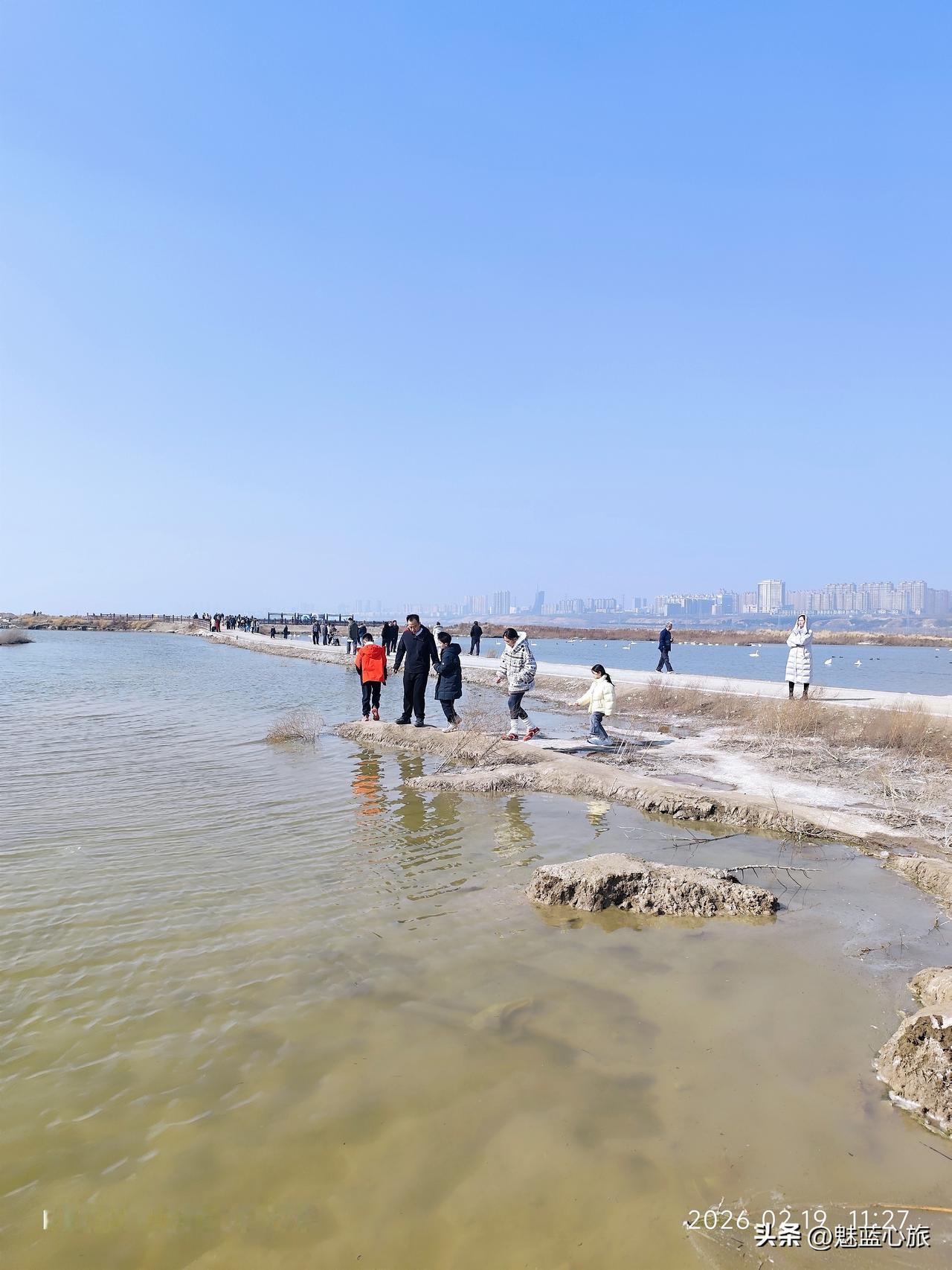 盐湖在阳光下闪着莹白微光,把千年古盐池妆点成冰清玉洁的秘境。这是盐湖独有的冬日景色,与翩跹天鹅相映,成了春节里大家纷至沓来欣赏的动人画卷。