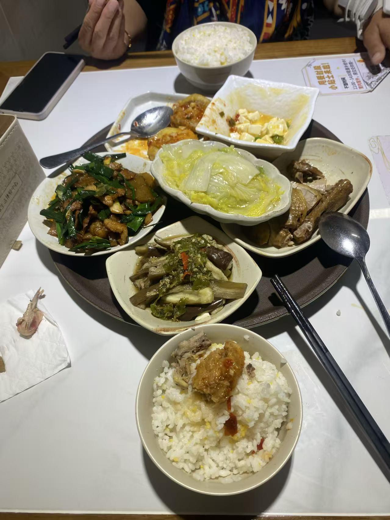 饭菜都是小份的,价格公道,适合工薪阶层,就餐的人也不少,我们点了六样,三荤三素,才47元(吃了一会想起拍个照)。菜标价放在选择区自选,选好电脑一扫,价格就出来了,收银员看我们点六份还善意提醒不少,怕我们吃不完。主食二米饭免费。