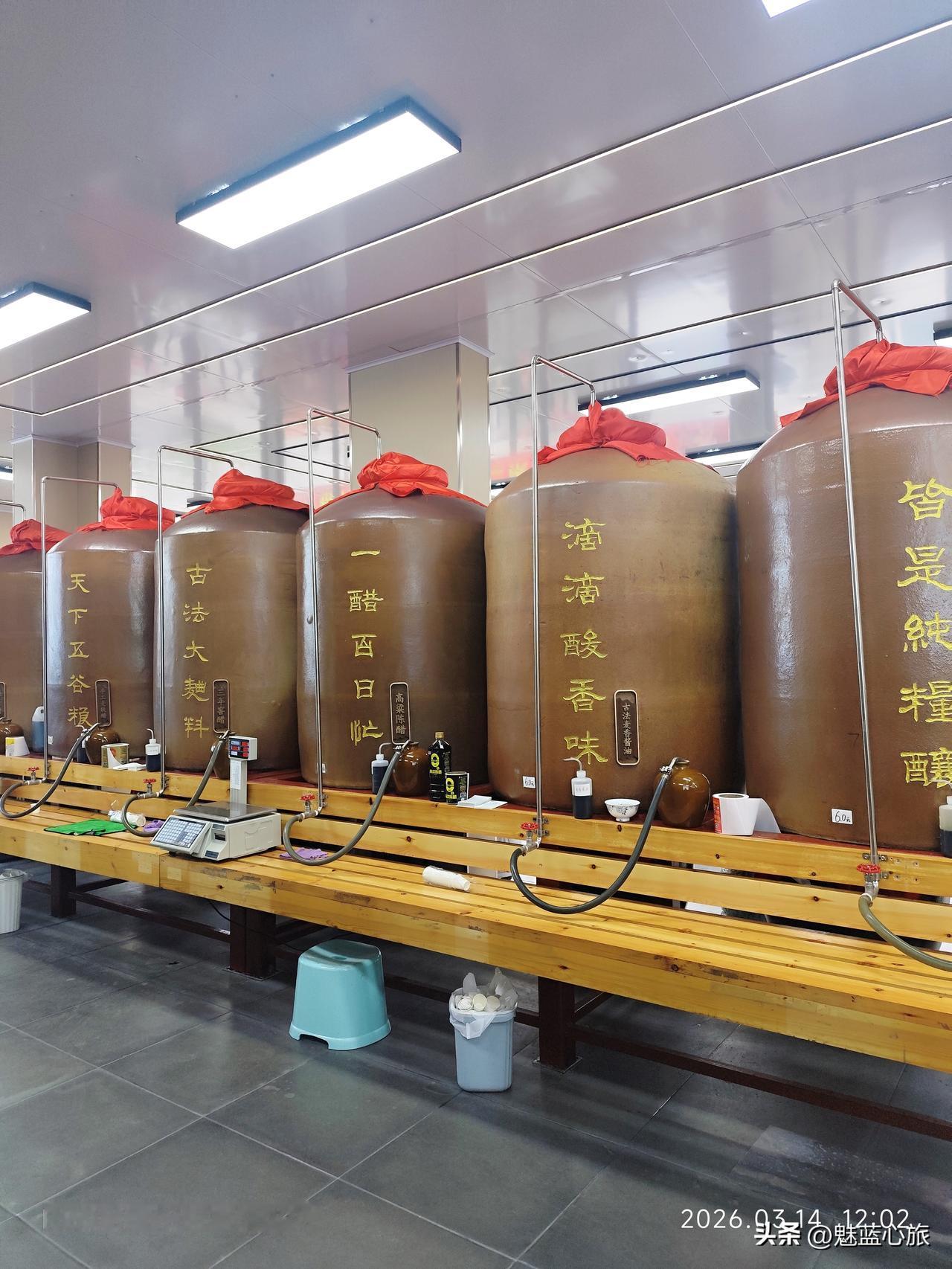 对面还有6个大罐,前面2个是酱油,分别是特级黄豆酿造的和古法麦香酱油;其余的是醋,有高粱陈醋、三年窖醋...