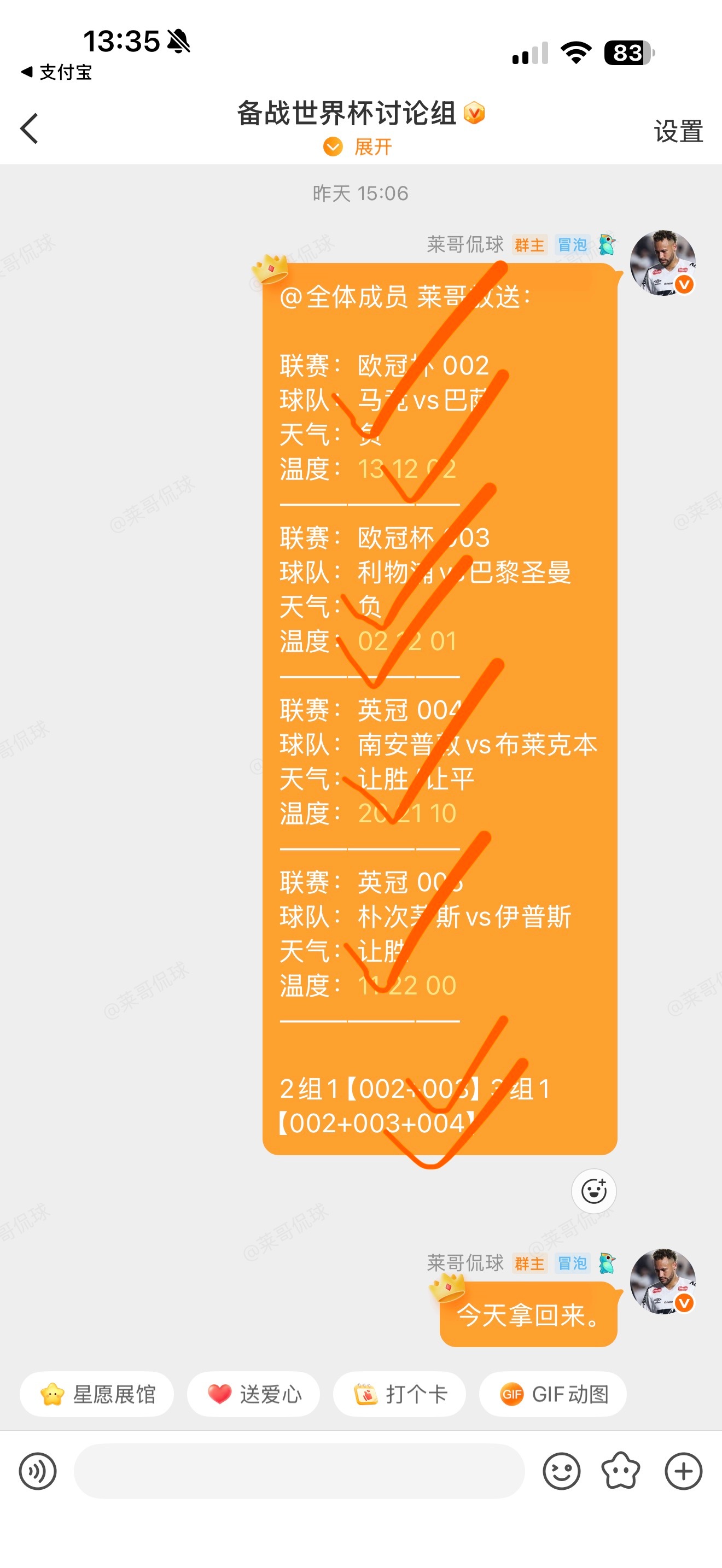 莱哥放送:欧冠 联赛:挪超 003球队:特罗姆瑟vs利勒斯特天气:胜温度:10 21 20————————联赛:挪超 004球队:萨普斯堡vs博德闪耀天气:让负温度:02 13 03————————联赛:欧冠杯 005球队:阿森纳vs里斯本天气:让胜温度:20 31 30————————联赛:欧冠杯 006球队:拜仁vs皇马天气:让胜/让平 温度:21 20 32————————