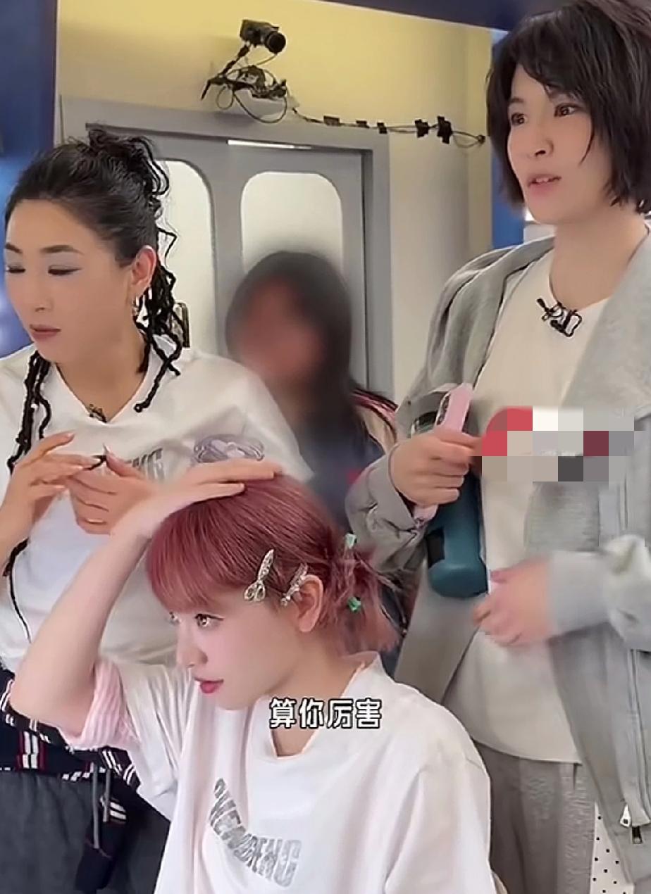 黄灿灿开玩笑说现在头皮屑估计都是粉色的,旁边站着的工作人员本来是在吃奥利奥饼干的,听黄灿灿这么说,也开玩笑说帮她加点黑色头皮屑,然后就把手上的饼干屑撒在黄灿灿头发上。