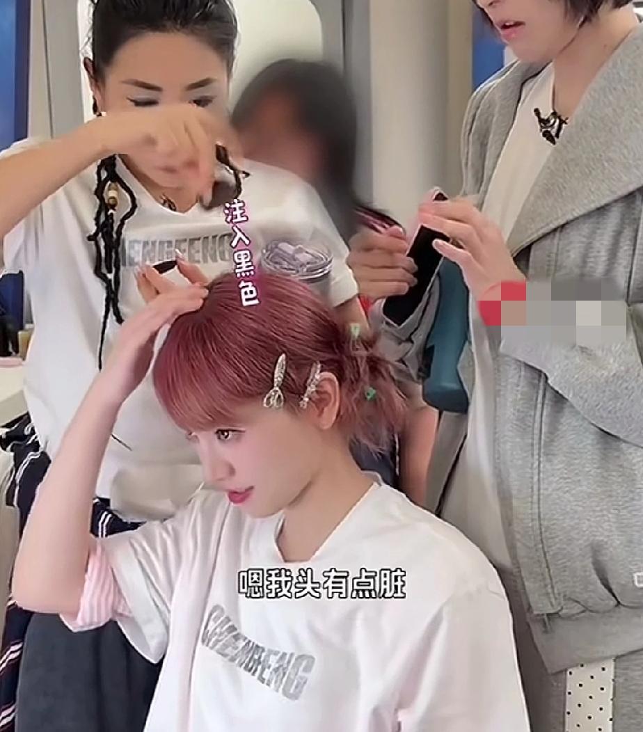 黄灿灿在后台化妆时说自己已经三天没洗头了,现在头上都有头皮屑了,造型师问她为什么不洗头,她说为了防止头发掉色。