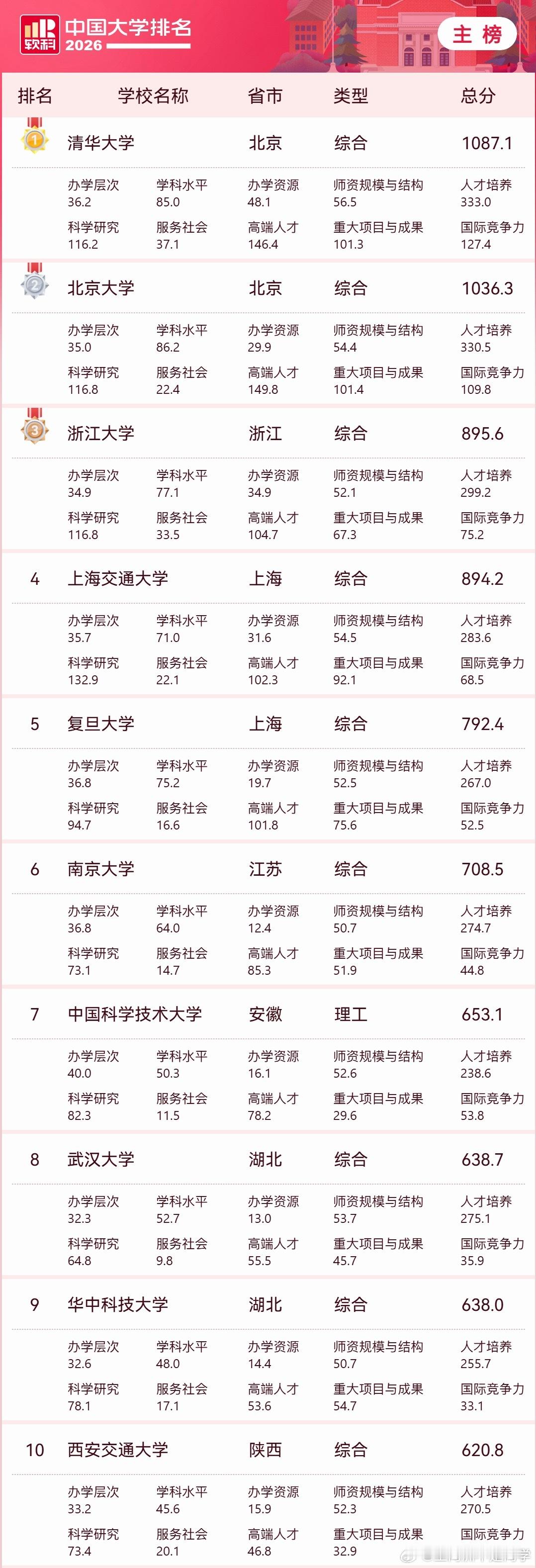 2026软科中国大学排名:第10名:西安交通大学第9名:华中科技大学第8名