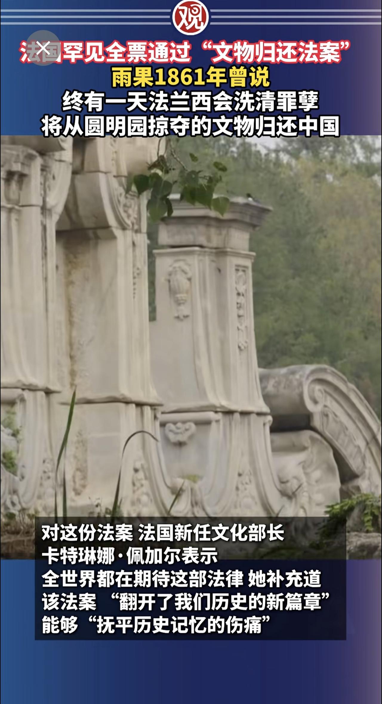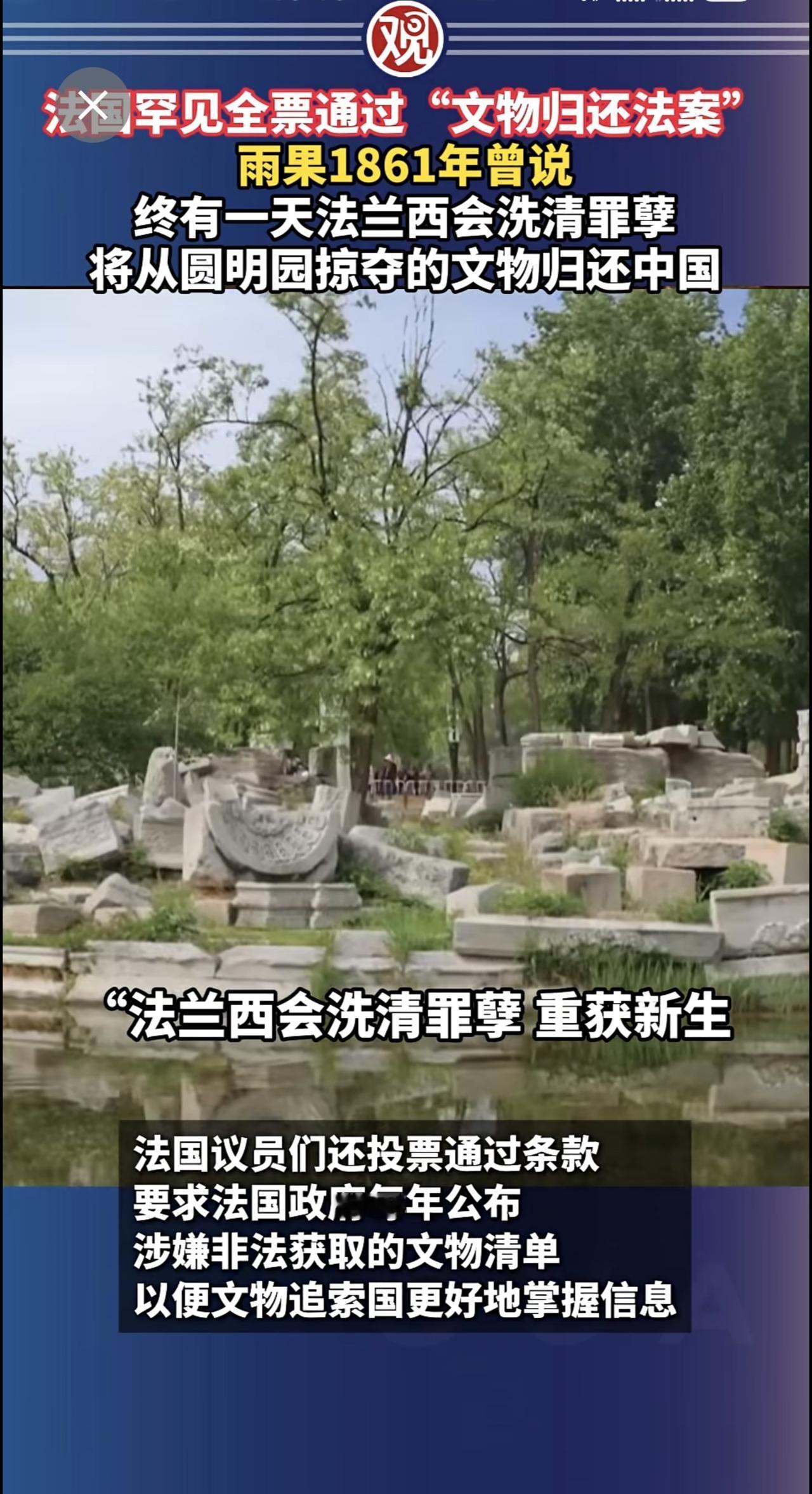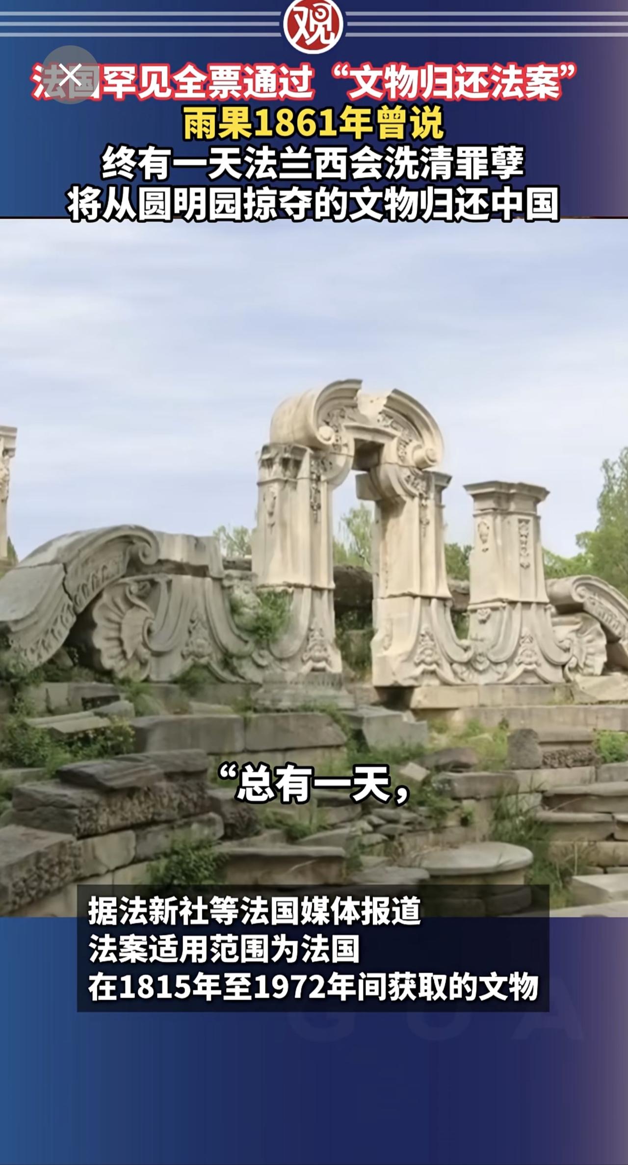 法国罕见全票通过“文物归还法案”,雨果1861年曾说,终有一天法兰西会洗清罪孽,将从圆明园掠夺的文物归还中国。