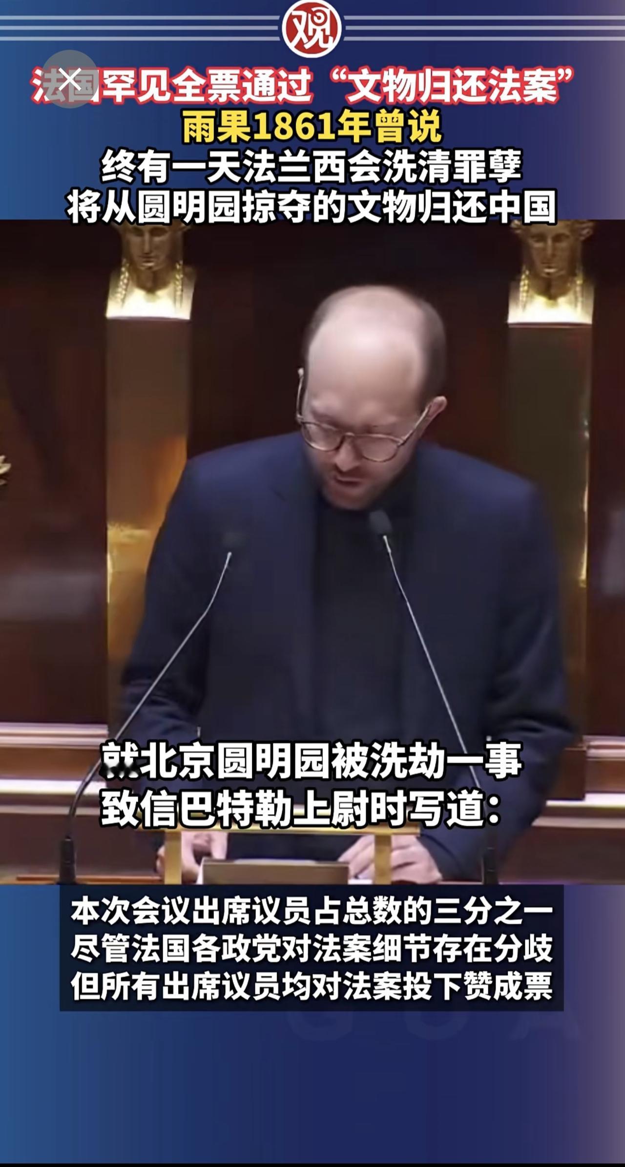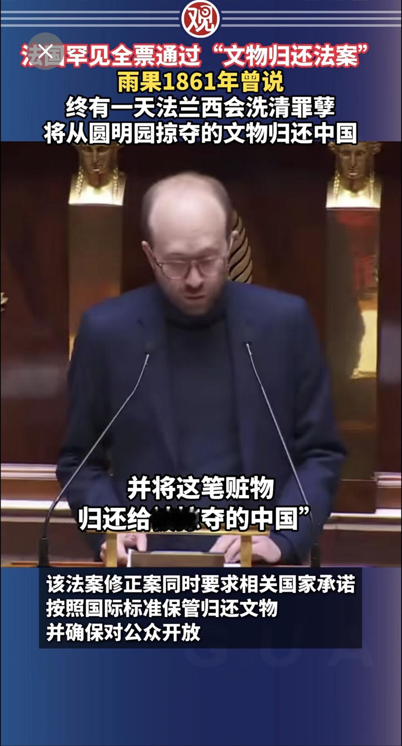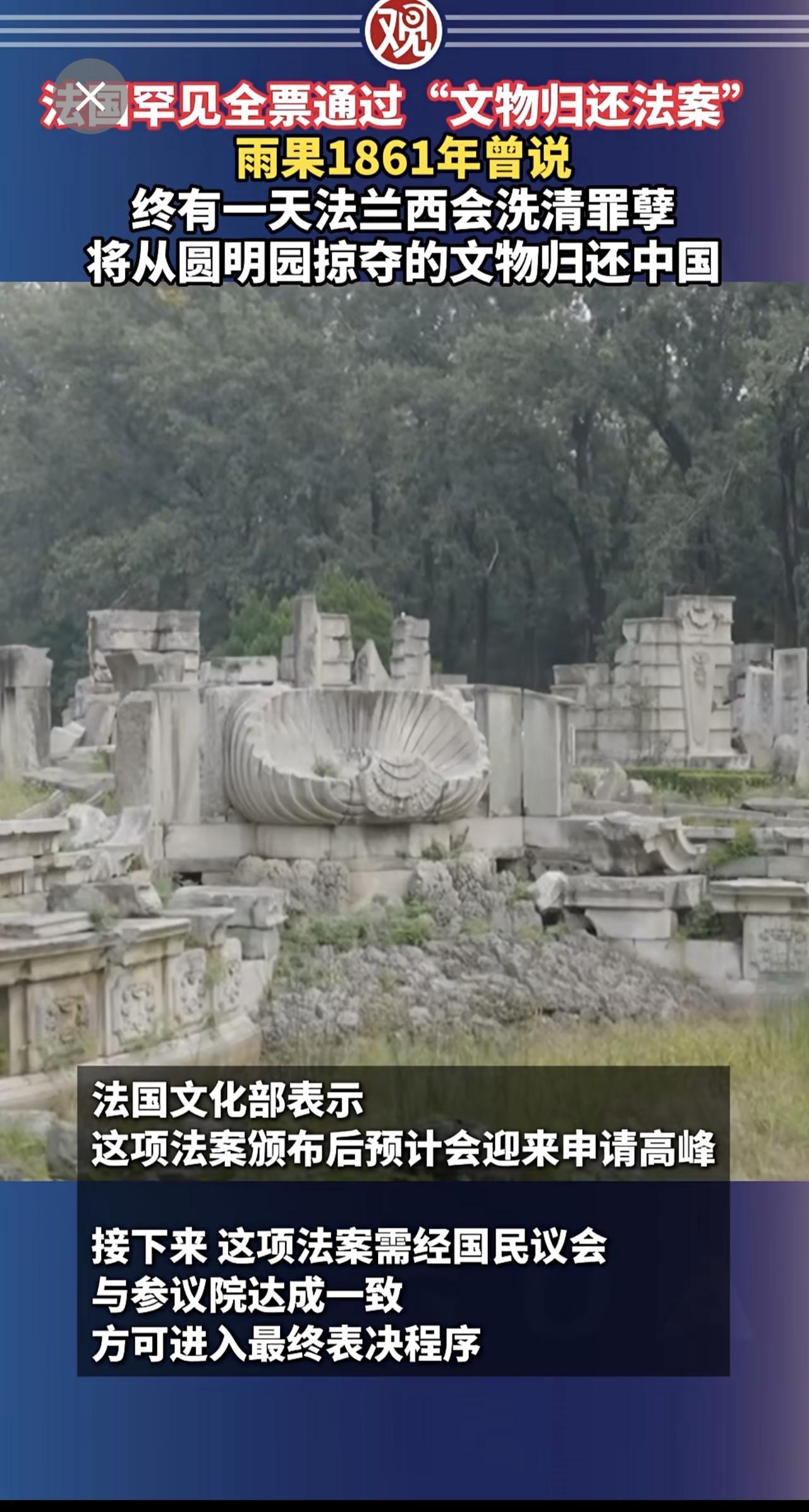 法国罕见全票通过“文物归还法案”,雨果1861年曾说,终有一天法兰西会洗清罪孽,将从圆明园掠夺的文物归还中国。