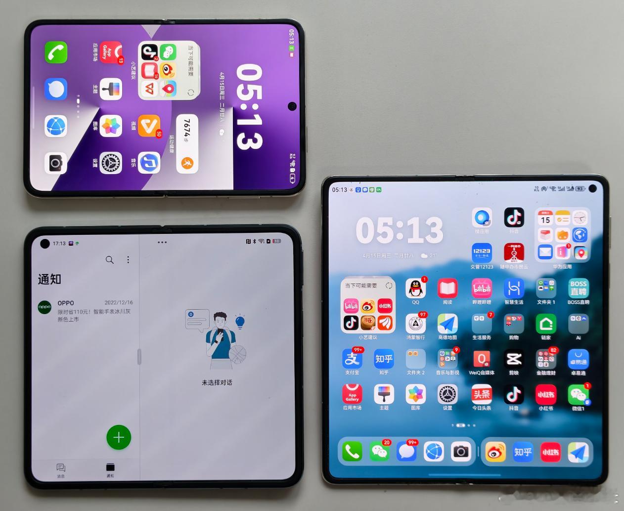 懂王每天YY习惯了,每天纯靠脑补过日子了。但凡他正儿八经用过几天折叠屏,就不会说出这堆神论,而恰好,OPPO Find N2、Mate X7和Pura X我都有,拍个对照图。
