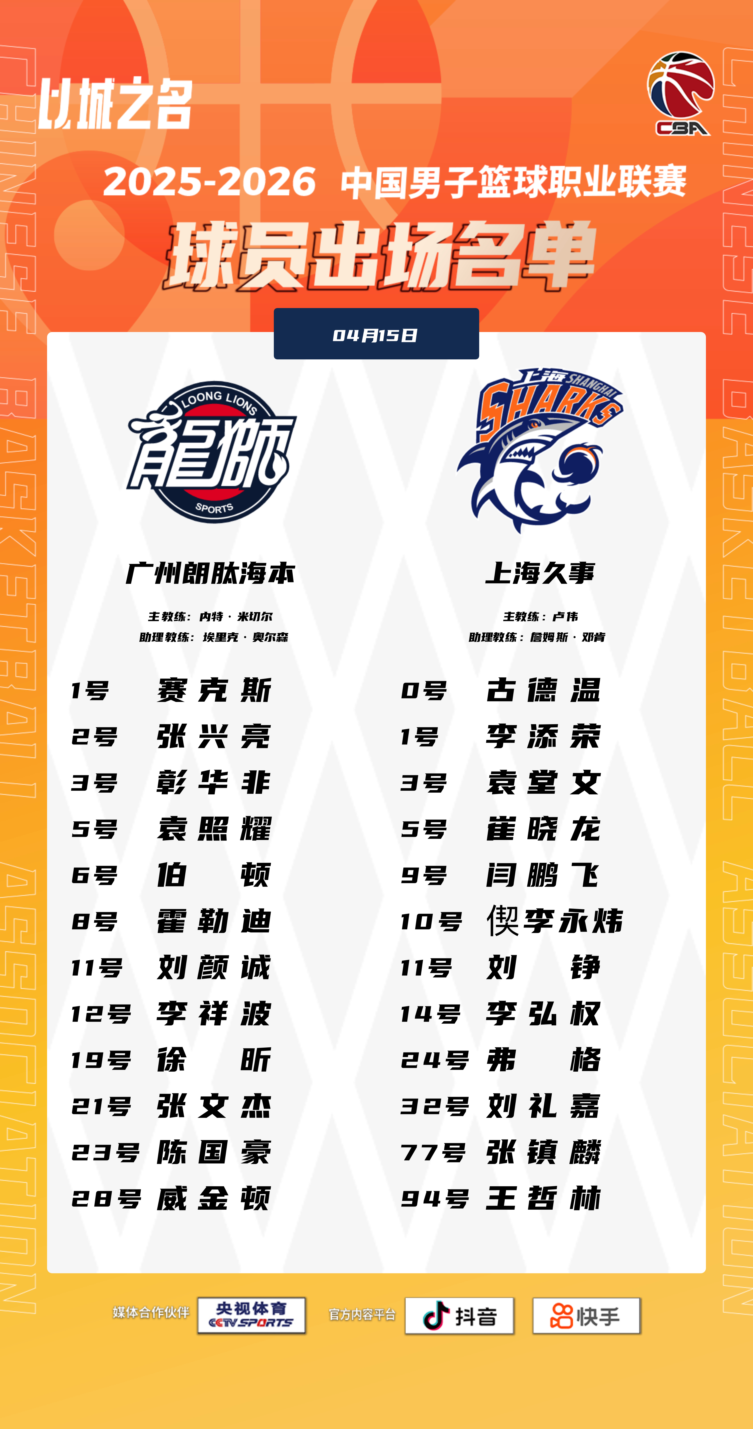12人名单不变,继续双外援出战。上海久事大鲨鱼