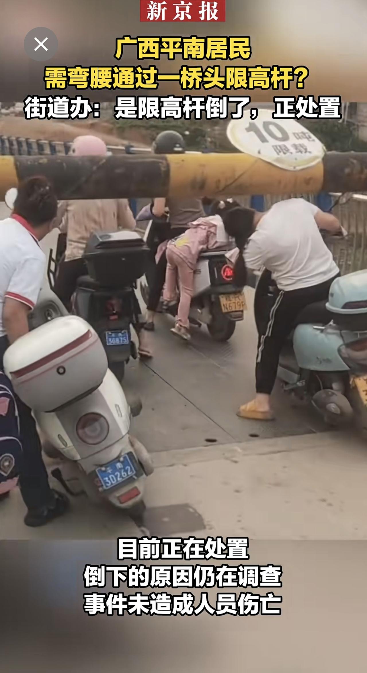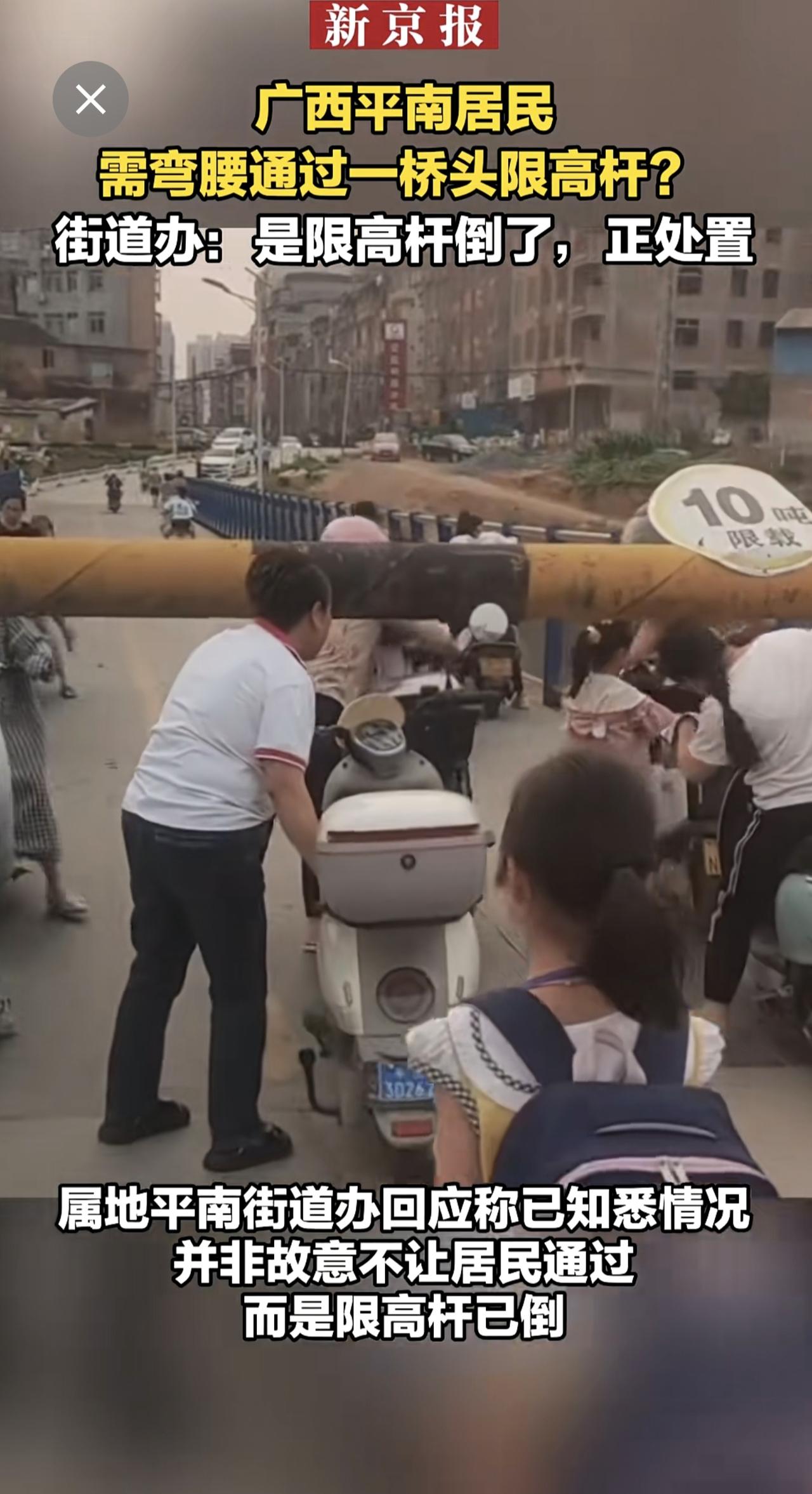 广西平南居民需弯腰通过一桥头限高杆? 街道办:是限高杆倒了,正处置