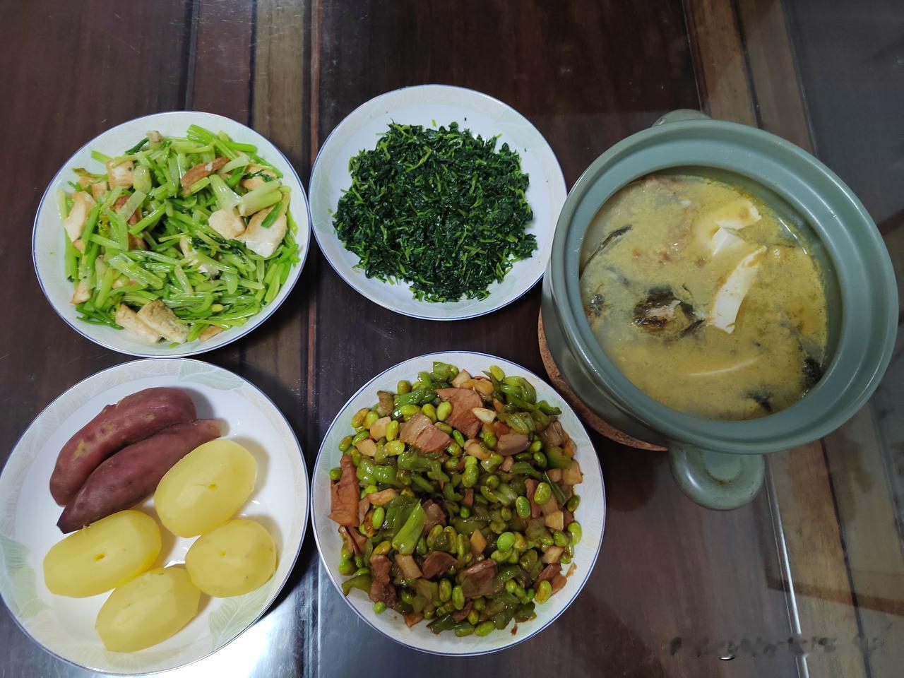 晚上电饭锅烧饭时蒸了小土豆和小红薯,用砂锅炖个昂刺鱼豆腐汤。今天三个人的晚餐:青椒咸肉炒毛豆、煎豆腐炒芹菜、清炒马兰头、昂刺鱼豆腐、蒸小土豆和小红薯。