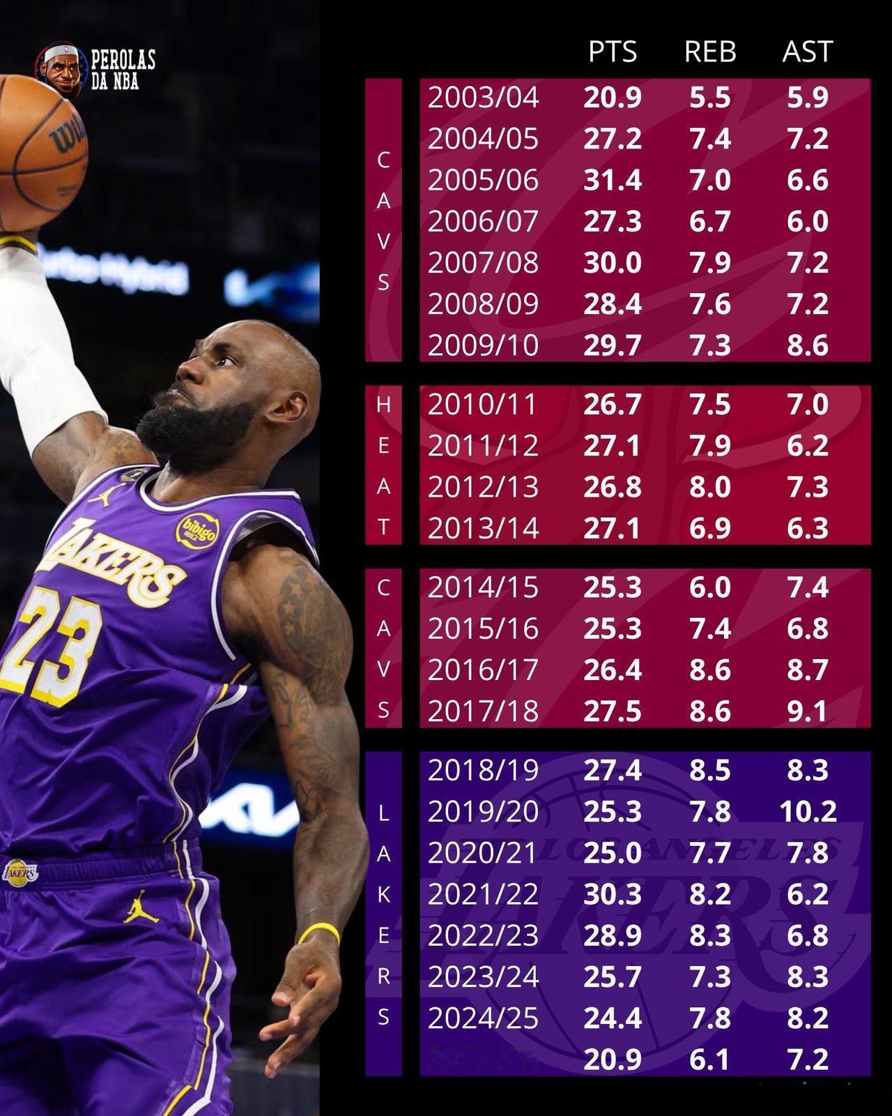 詹姆斯23个赛季场均数据,从巅峰开始到巅峰结束,没有一个赛季场均低于20分,这可