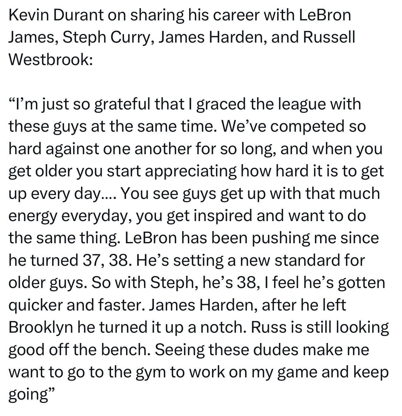 杜兰特谈及与詹姆斯、库里、哈登和威少同处一个时代的感受: