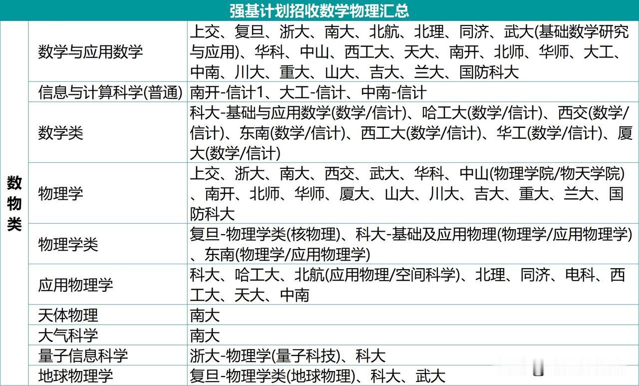 2026年强基计划物理类招生专业及对应院校汇总:新工科类、数物类、生化类。