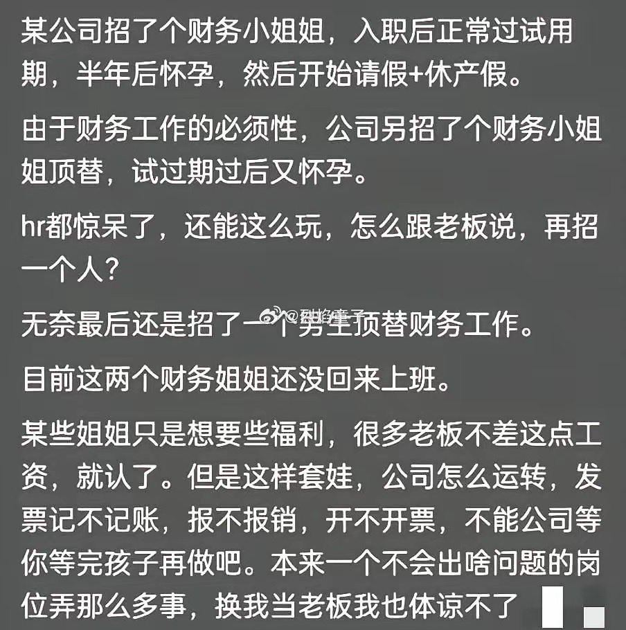 我以前上班的单位就这样。人力经理招了个助理,怀孕,再招一个吧,这次谈好不生孩子,进来俩月又怀了。最牛逼的是,产假休完,前后脚回来,回来就辞职。现实里真都把段子活成了人生,爽了自己,却堵了职场后来人的路。公司以后再就没招过刚毕业的小姑娘。