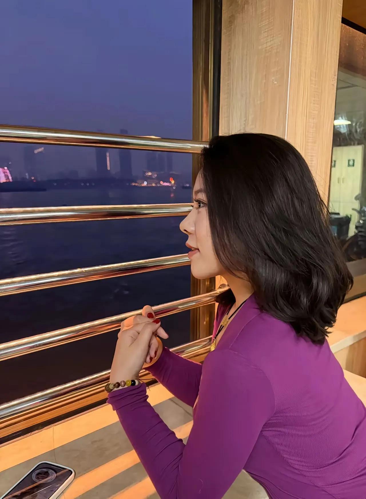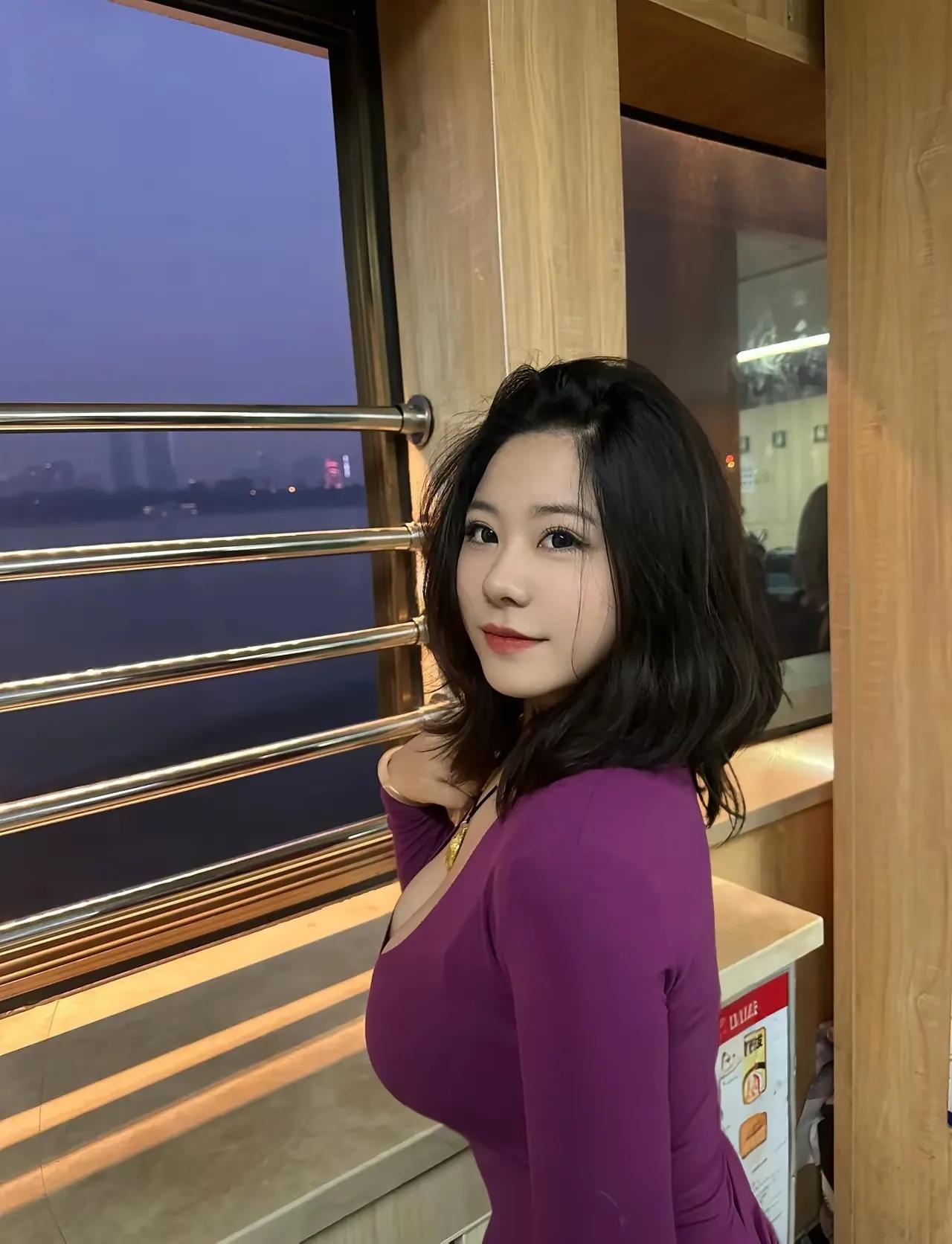 紫衣美人倚栏杆,江上风光入画来。