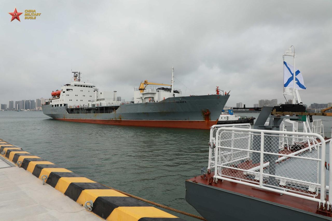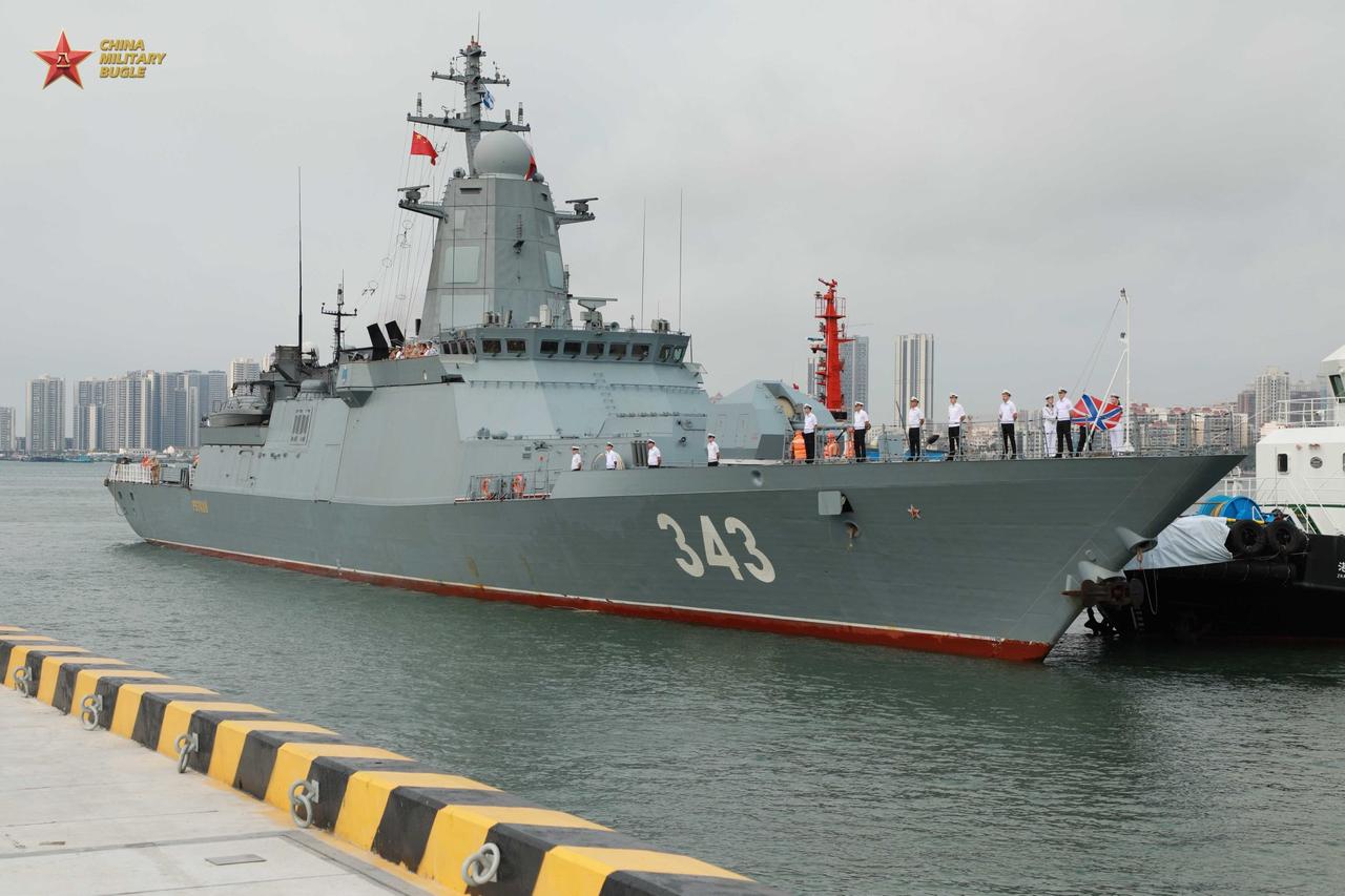 由两艘护卫舰和一艘中型补给舰组成的俄罗斯海军舰队于周三抵达湛江某军港,对我国进行