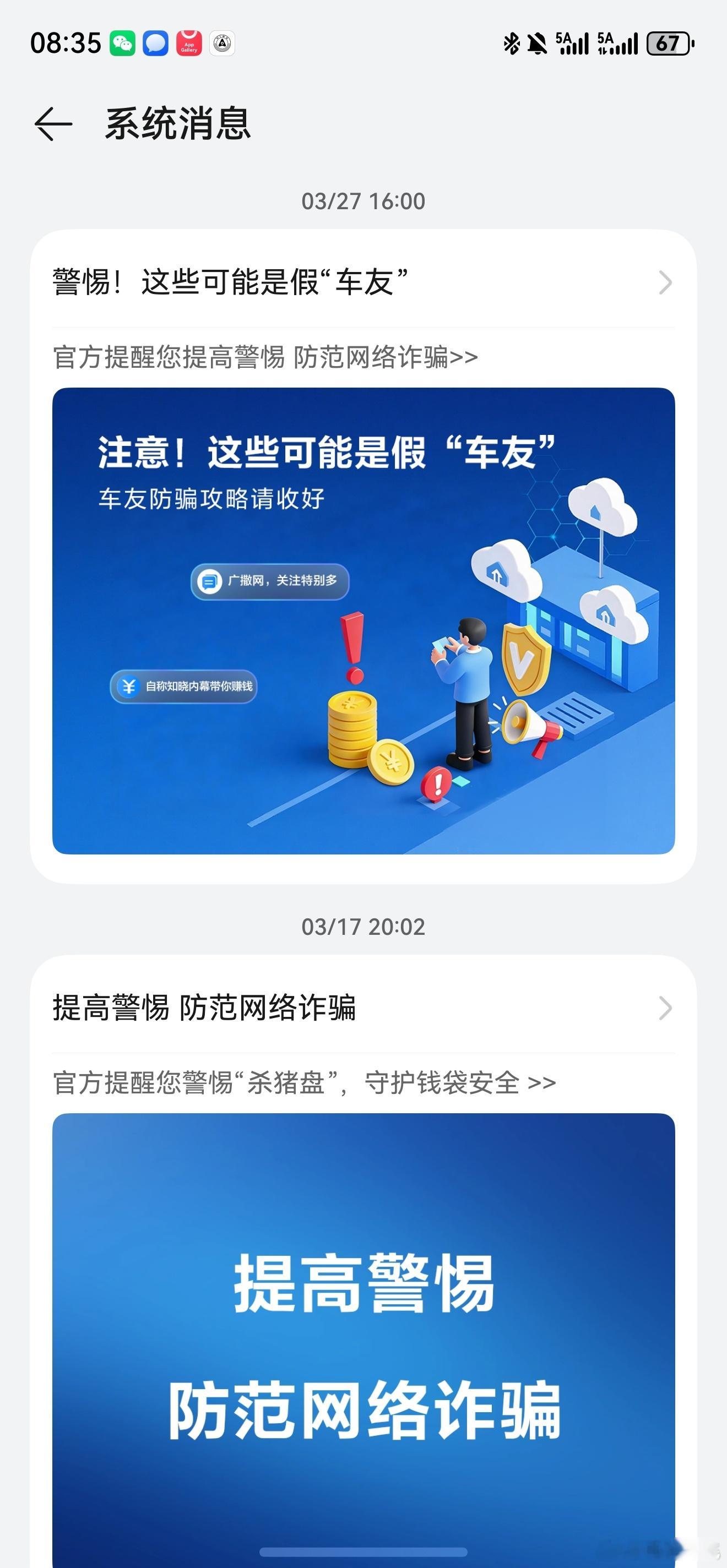 鸿蒙智行App首页头版就是防诈宣传,之前也多次通过系统消息提醒防诈。我也提醒下车