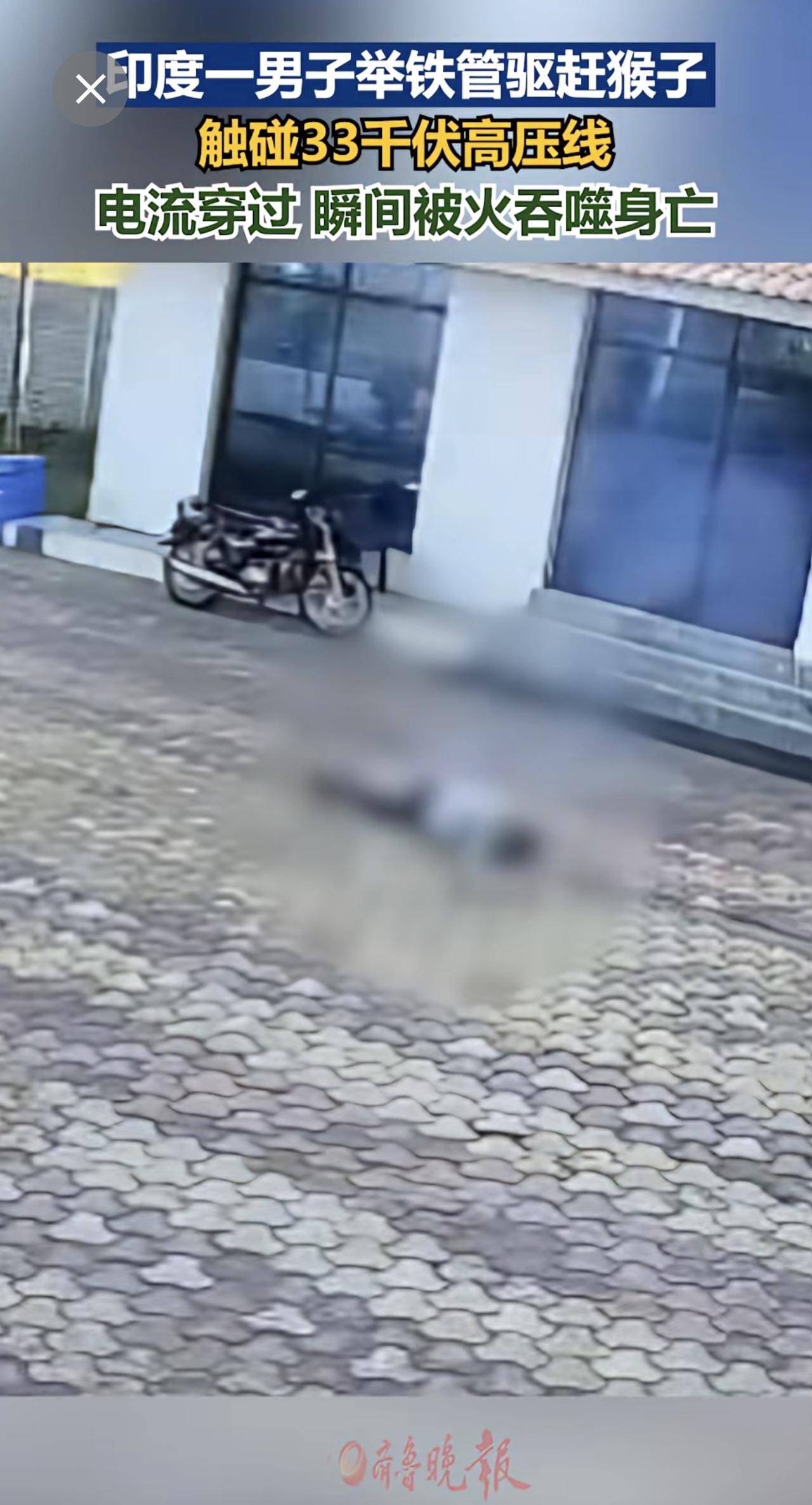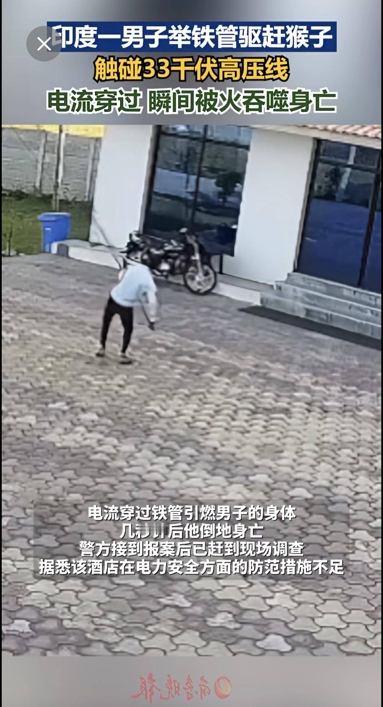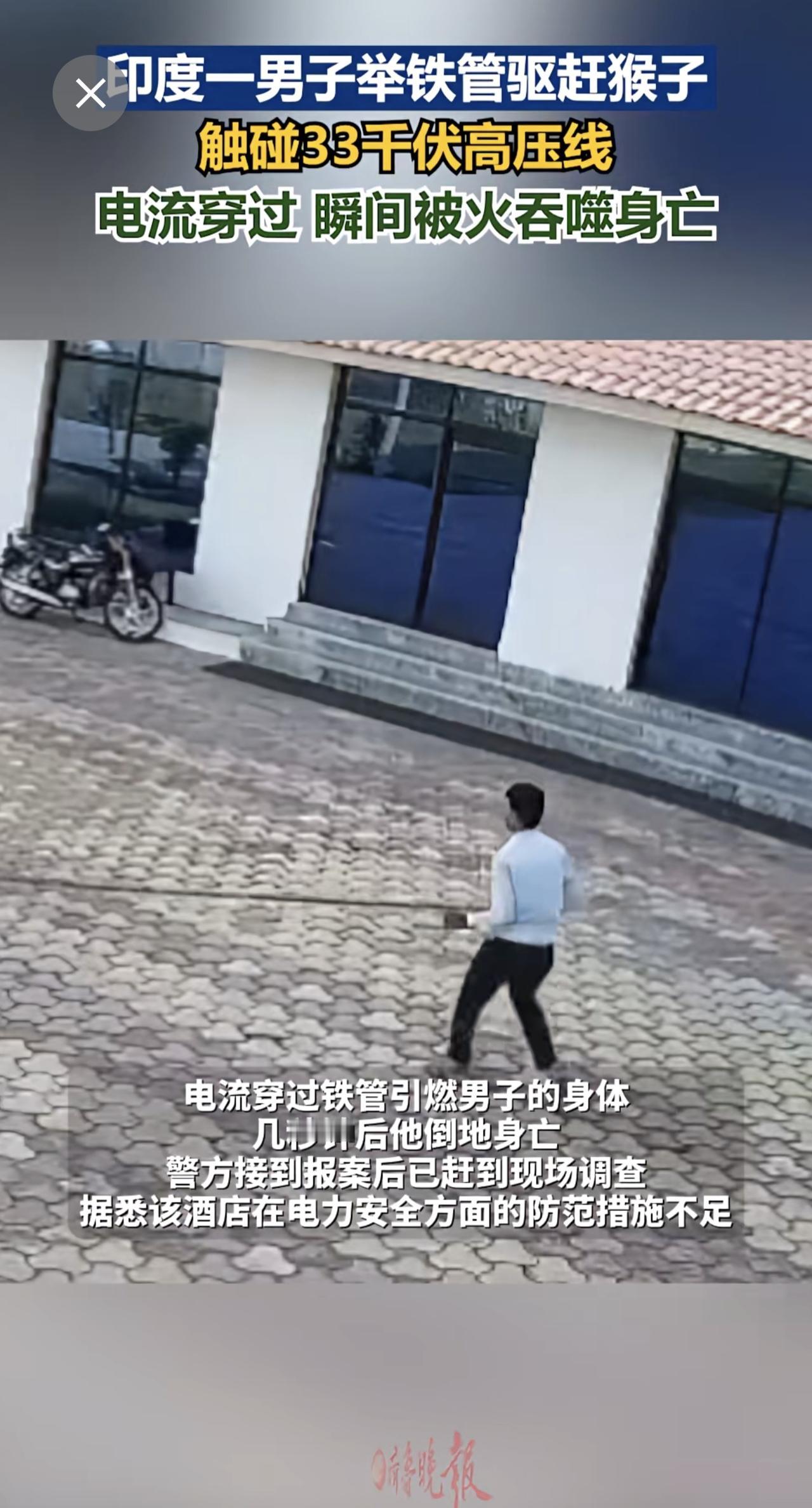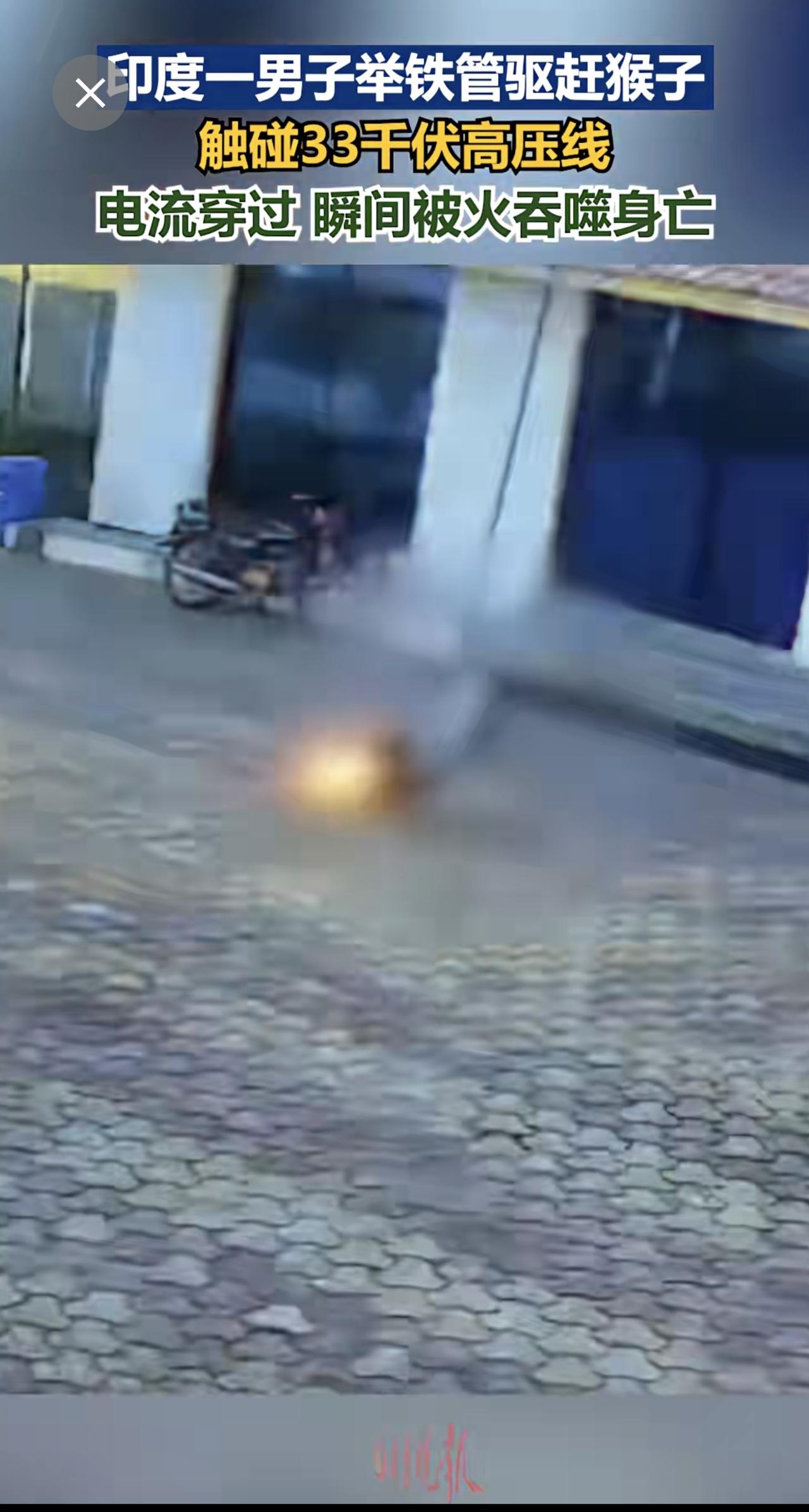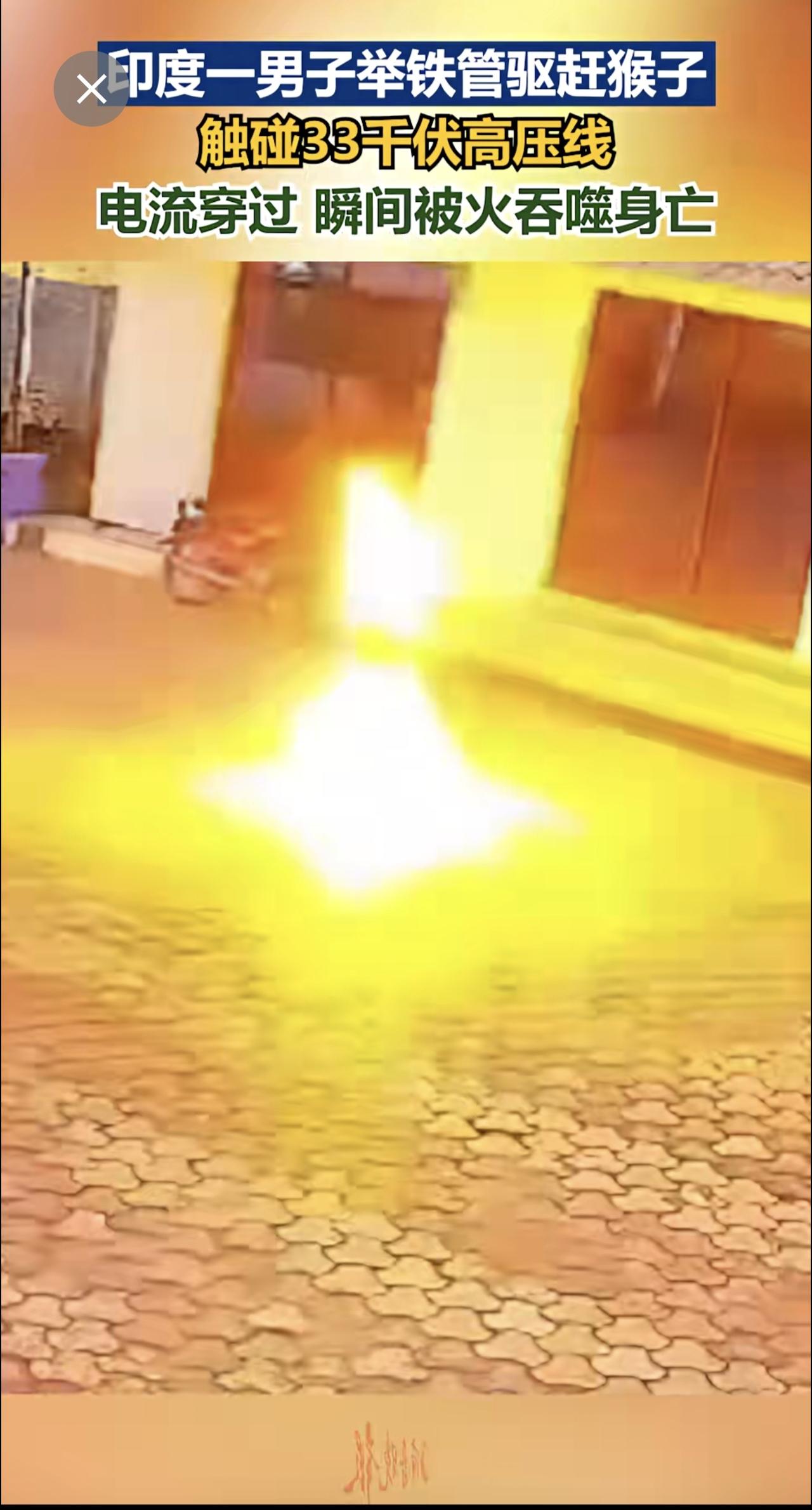 印度一男子举铁管驱赶猴子,触碰33千伏高压线,电流穿过 瞬间被火吞噬身亡.