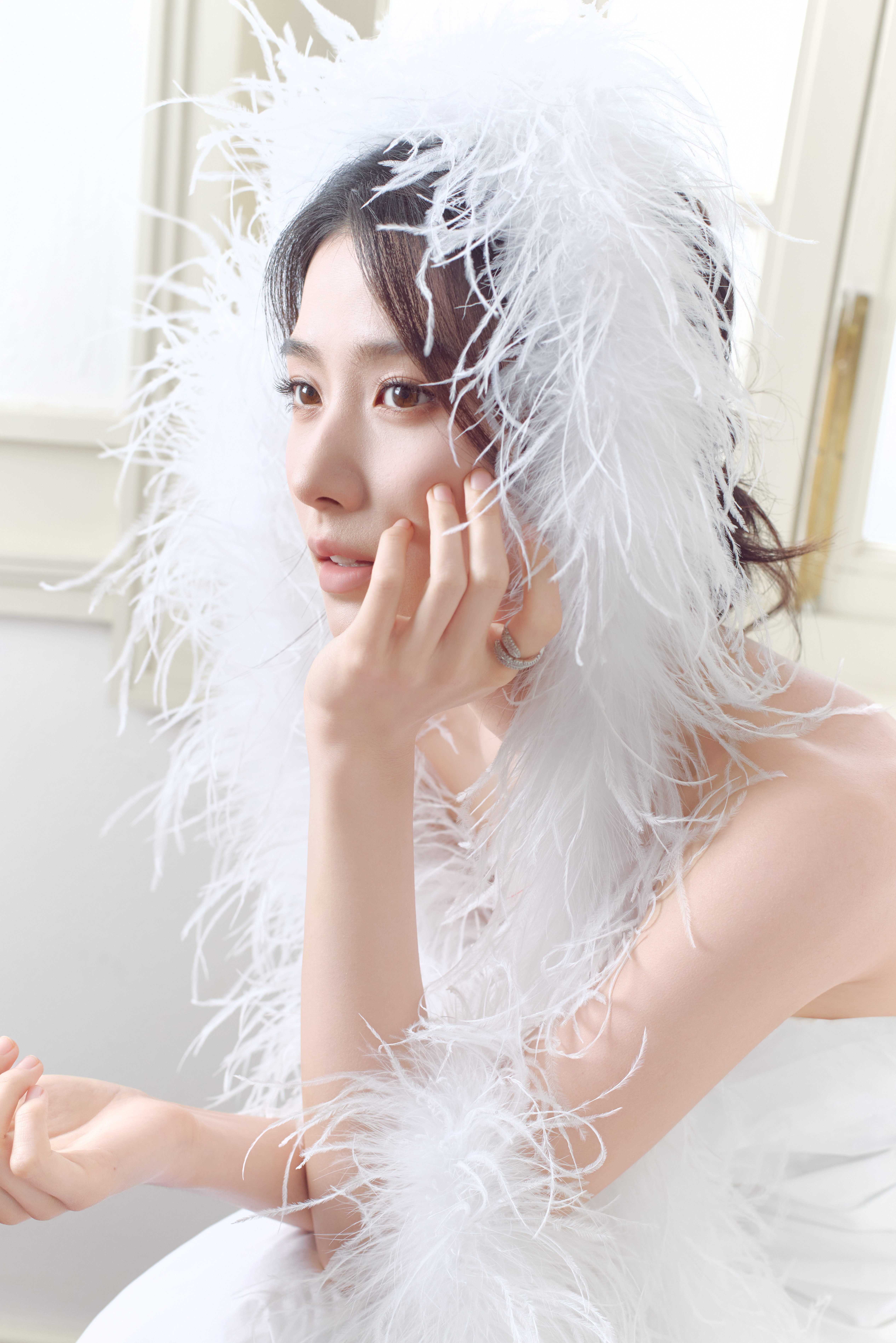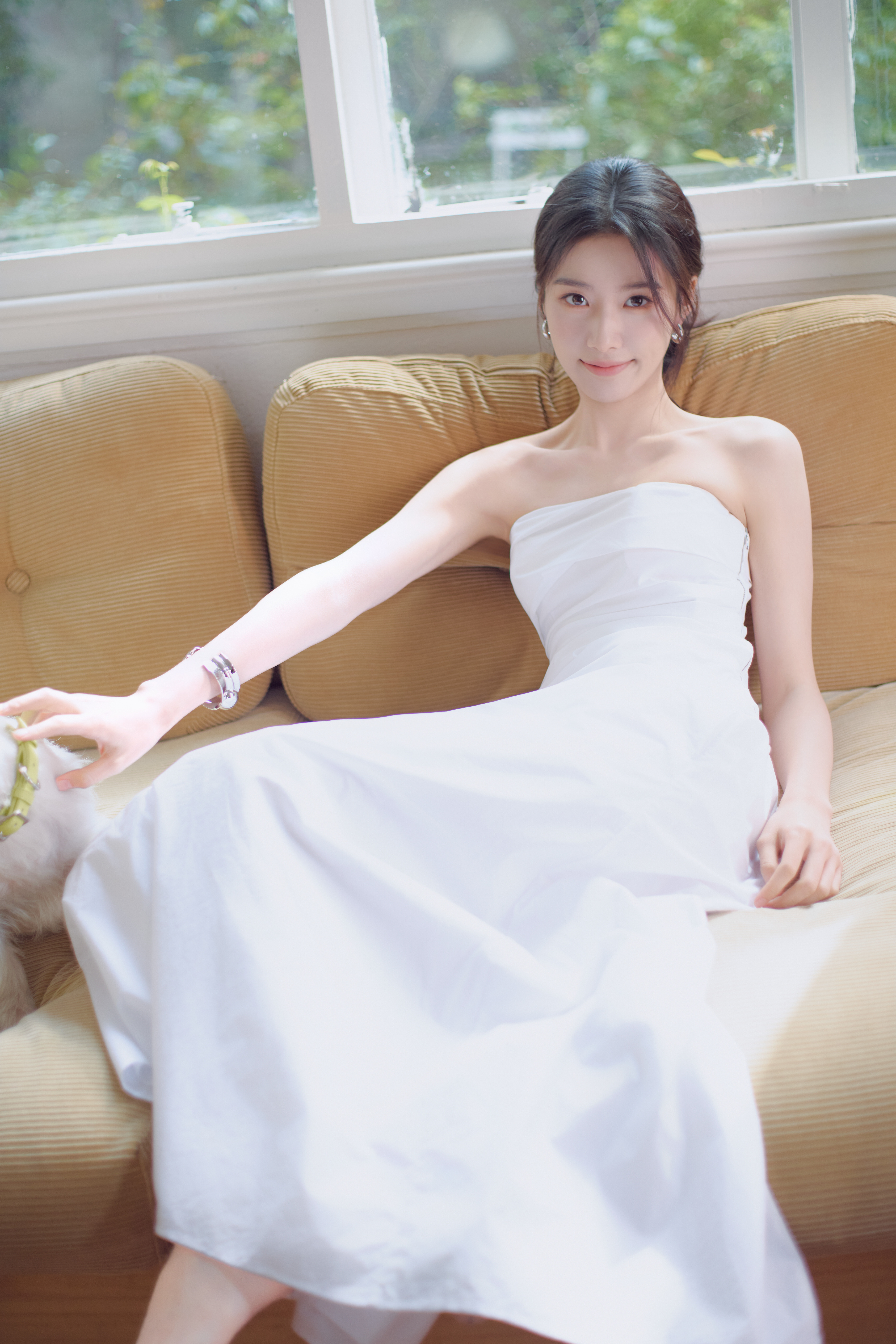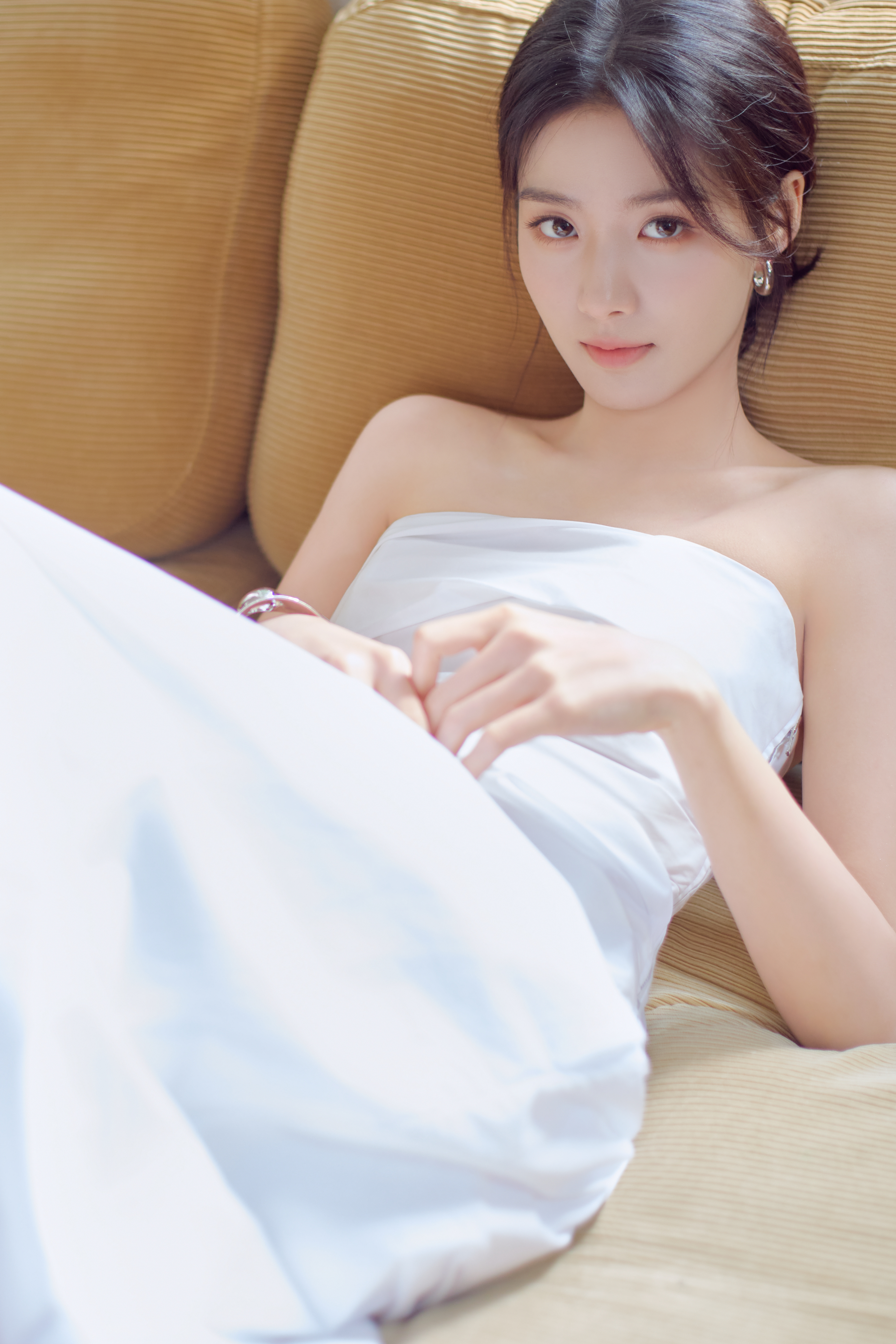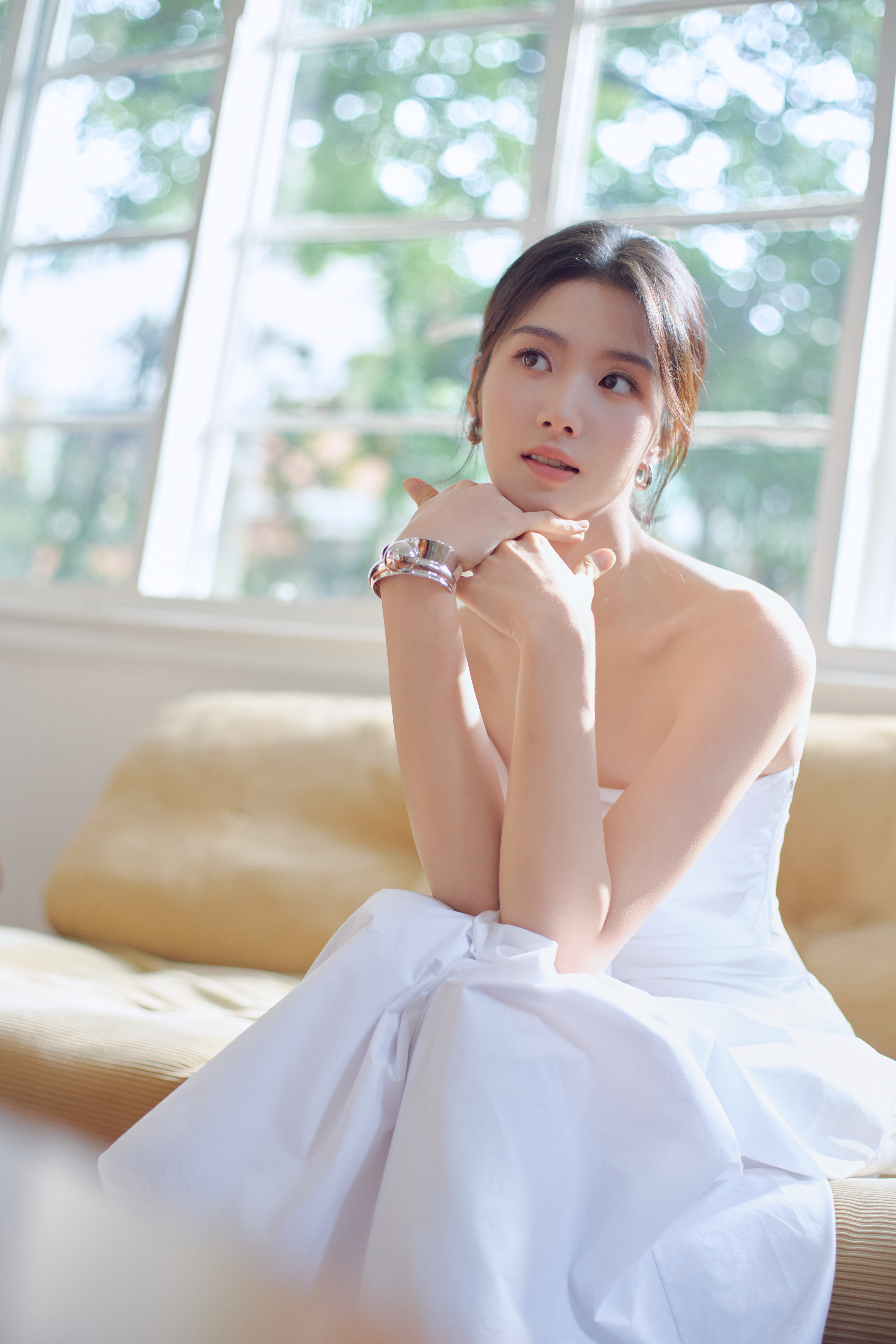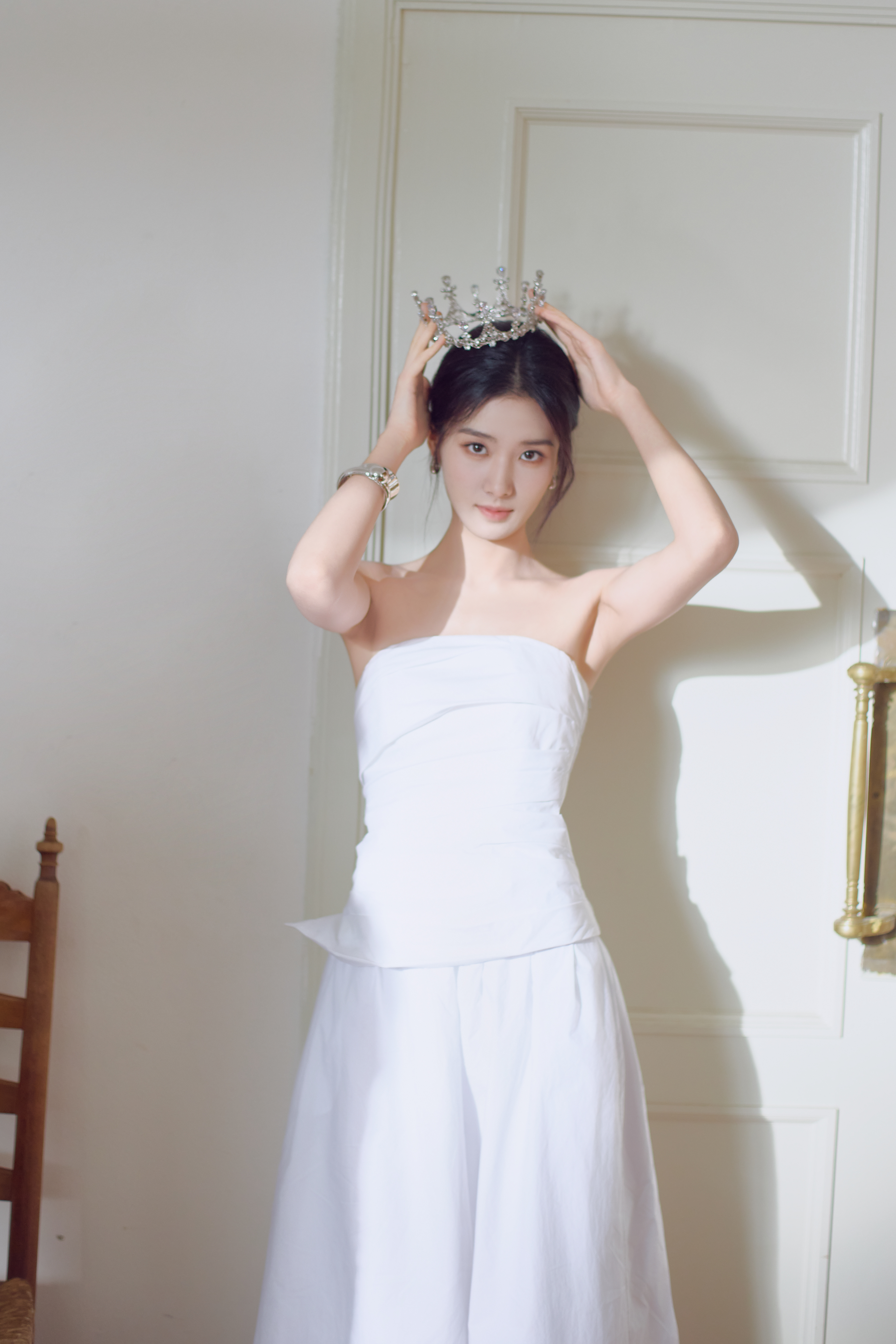 卢昱晓今日份直播活动造型大片,身着白色褶皱抹胸搭配廓形半裙,佩戴抢眼金属感配饰,