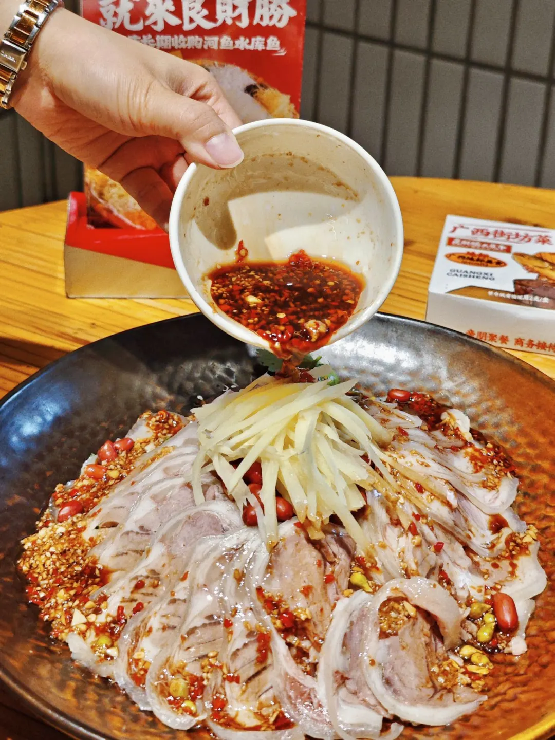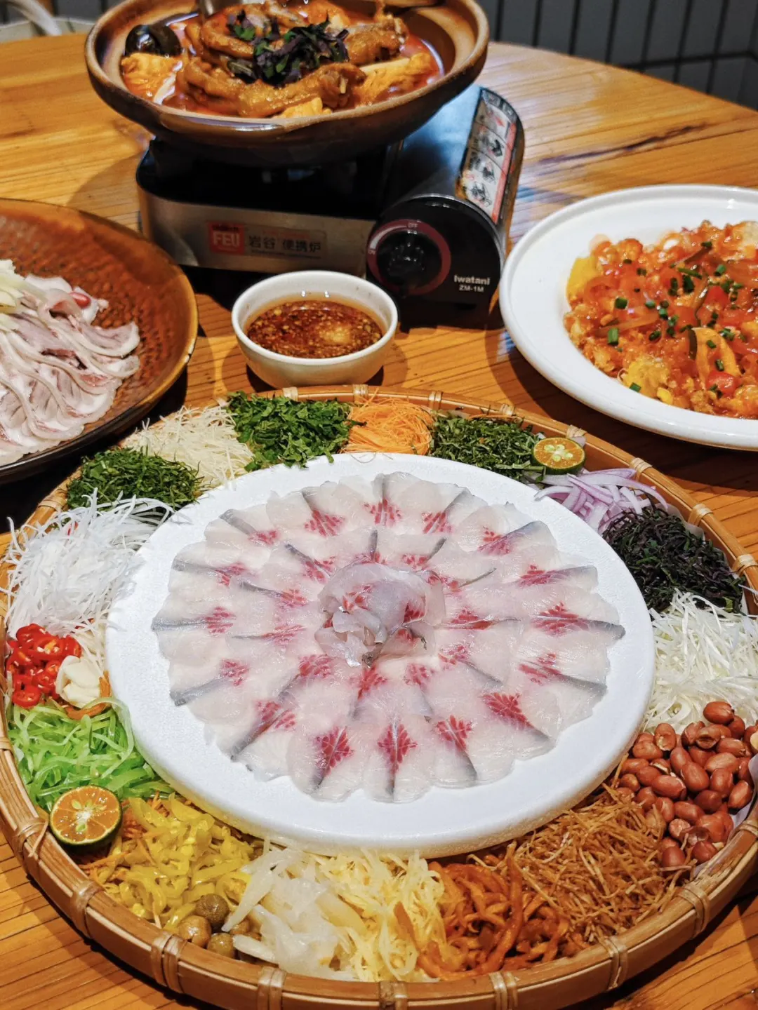 捞鱼片的吃法有点像我们广东顺德鱼生的吃法