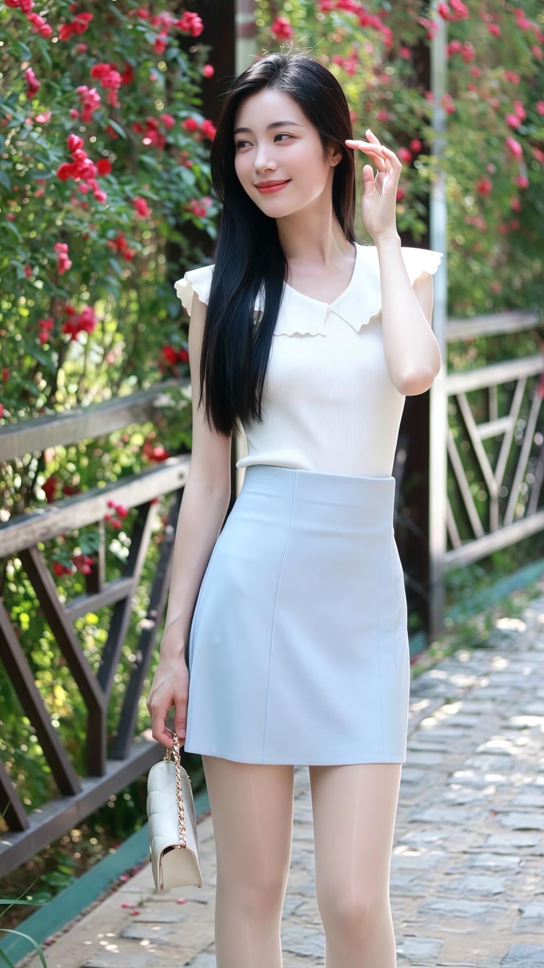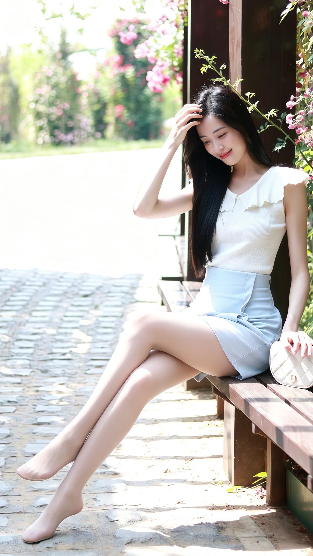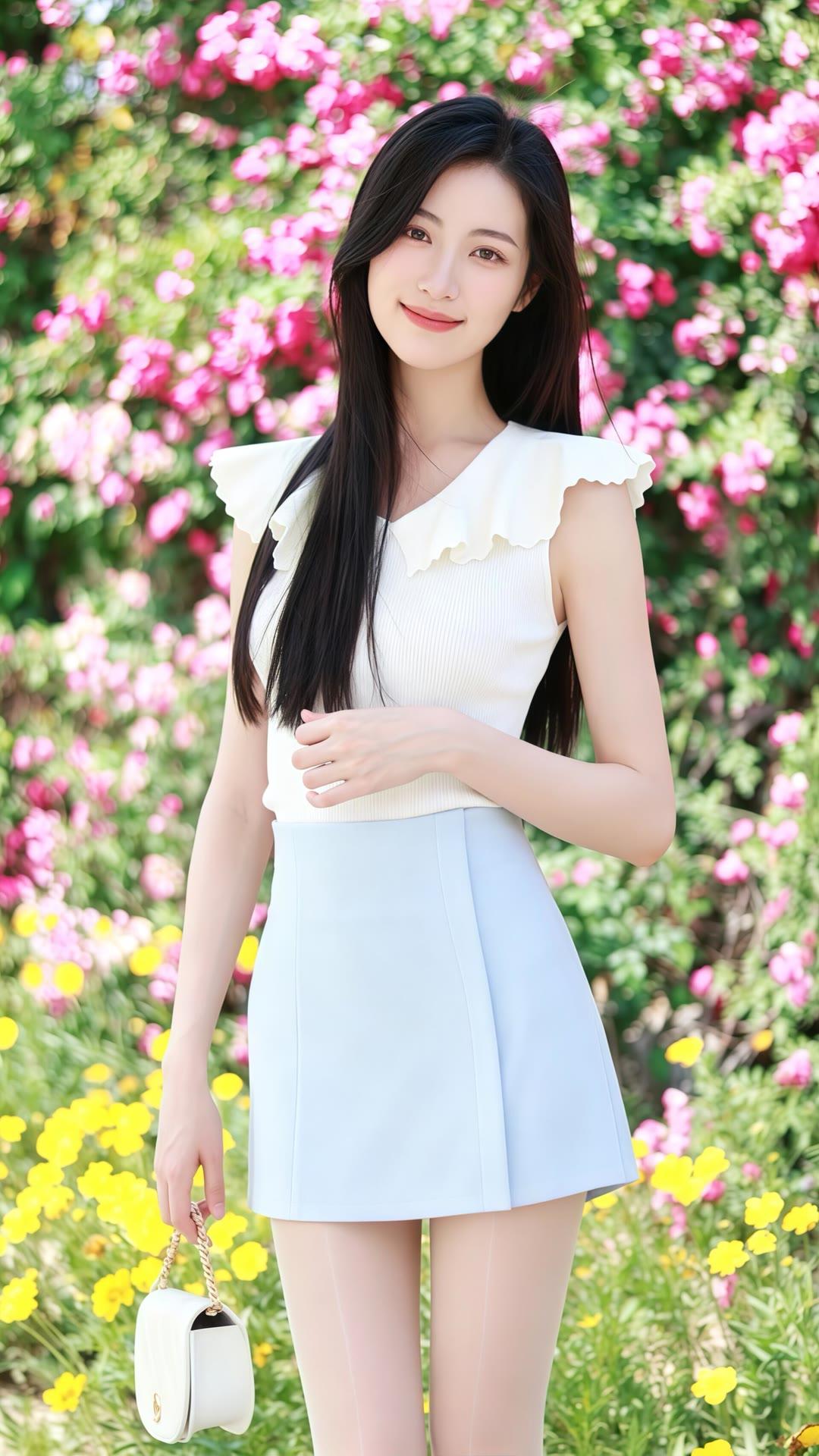 优雅漫步在花丛中,浅蓝色裙摆随风飘动,尽显清新甜美。