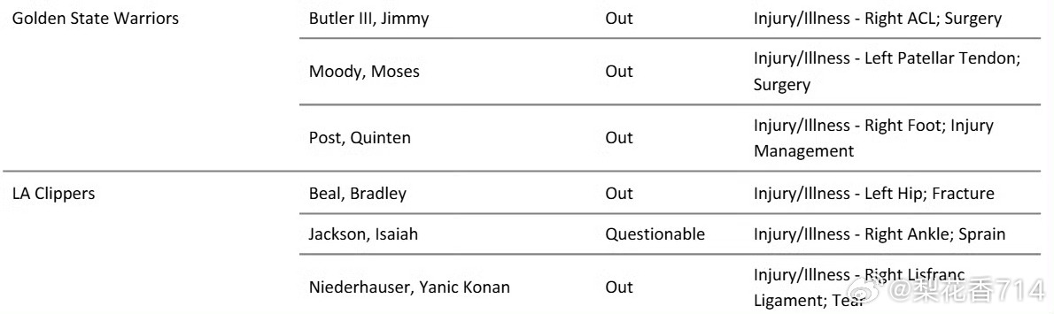 勇士快船明日伤病名单!