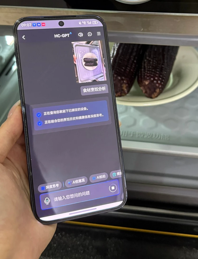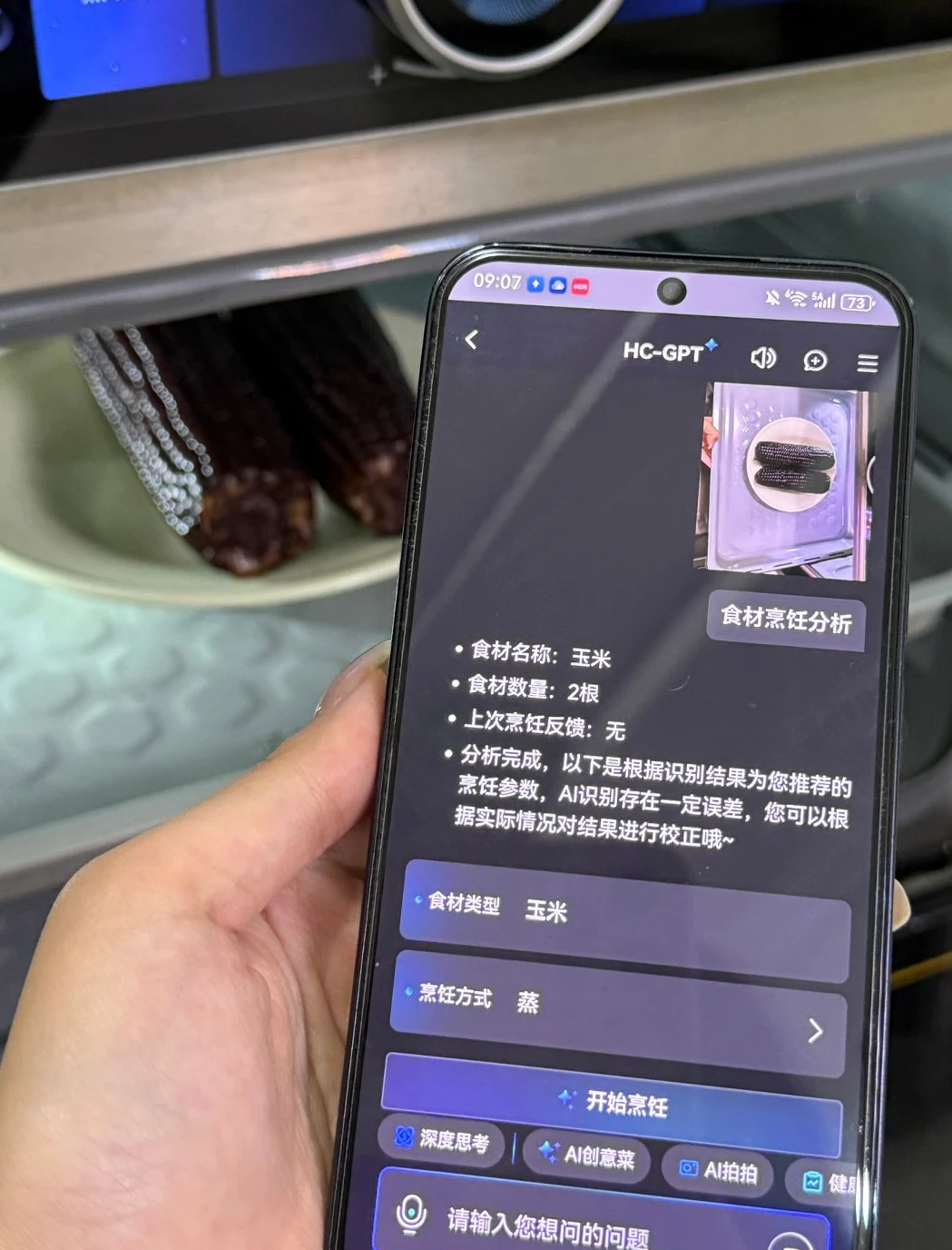前几天我还看到app上了个新功能“AI拍拍”,我就试着拍了一下玉米,两根玉米给我推荐了10分钟120℃蒸,直接就会同步在机器上,也不用我再设置时间温度,蒸出来的玉米也刚刚好糯糯的。