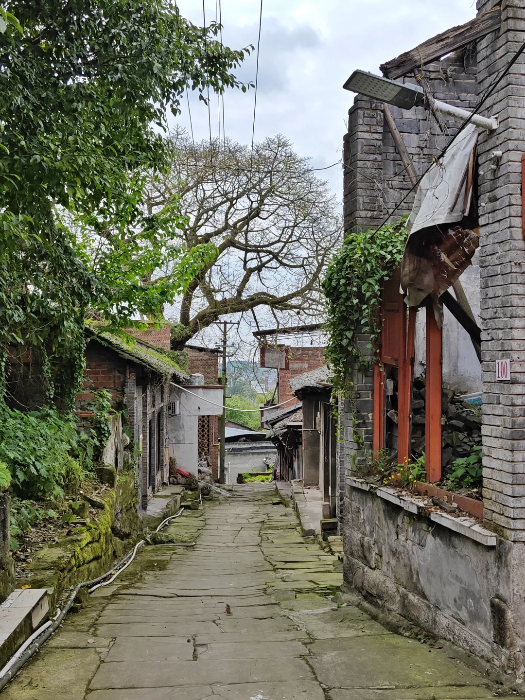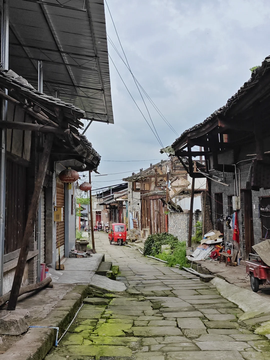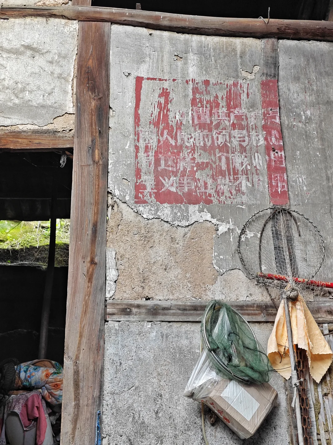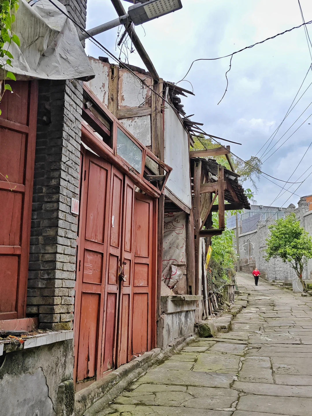 这次我去的是邮亭镇的老街。老街离高铁站很近,公交车五分钟就开到了。这条老街大概长六七百米,两边房屋非常破旧,有一半是解放前典型的四川民居风格,竹木夹壁夯土房,一楼一底,大多成了危房,有的甚至塌了一半,在等待着彻底的毁灭。其他房屋也很破旧,有的经过维修,外墙贴了砖石,加固了,还住着人。但这里居民已经搬走了80%,还住着少数老年人。这里面有几栋房屋挂了文物牌,其中一栋是当年邮亭的乡政府办公楼,后来搬走了。这里还有一个春晖学校,好像是小学,还在正常运行。这些破旧房屋里,有人喂了鸡鸭,还有好多只猫,主要是橘猫和狸花猫。有的旧房屋的土墙上还刷了不少当年的标语,依稀可辨,透出计划经济年代中国西南农村的影子。