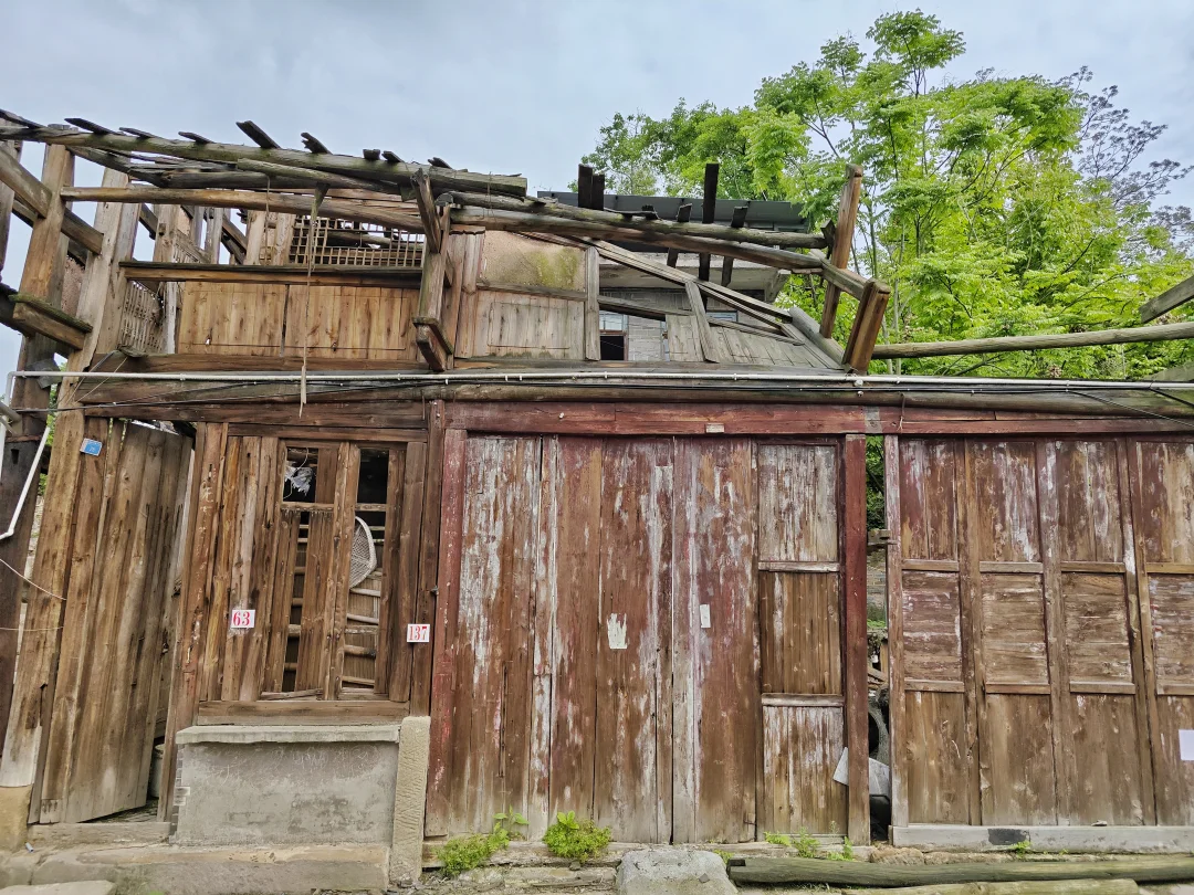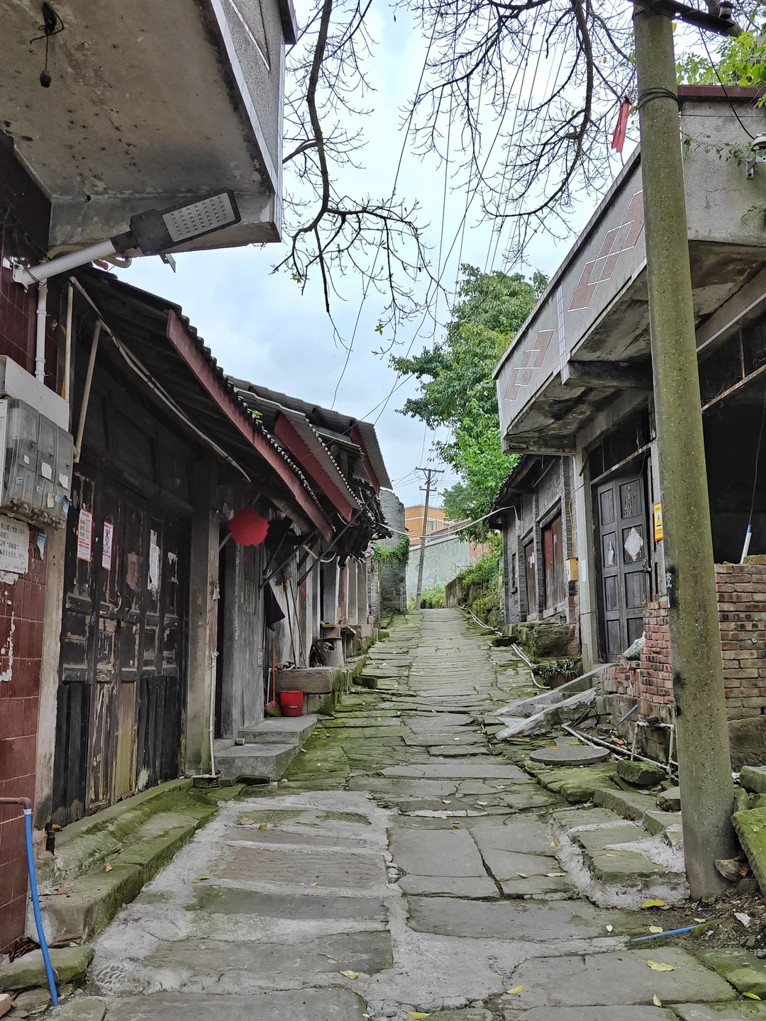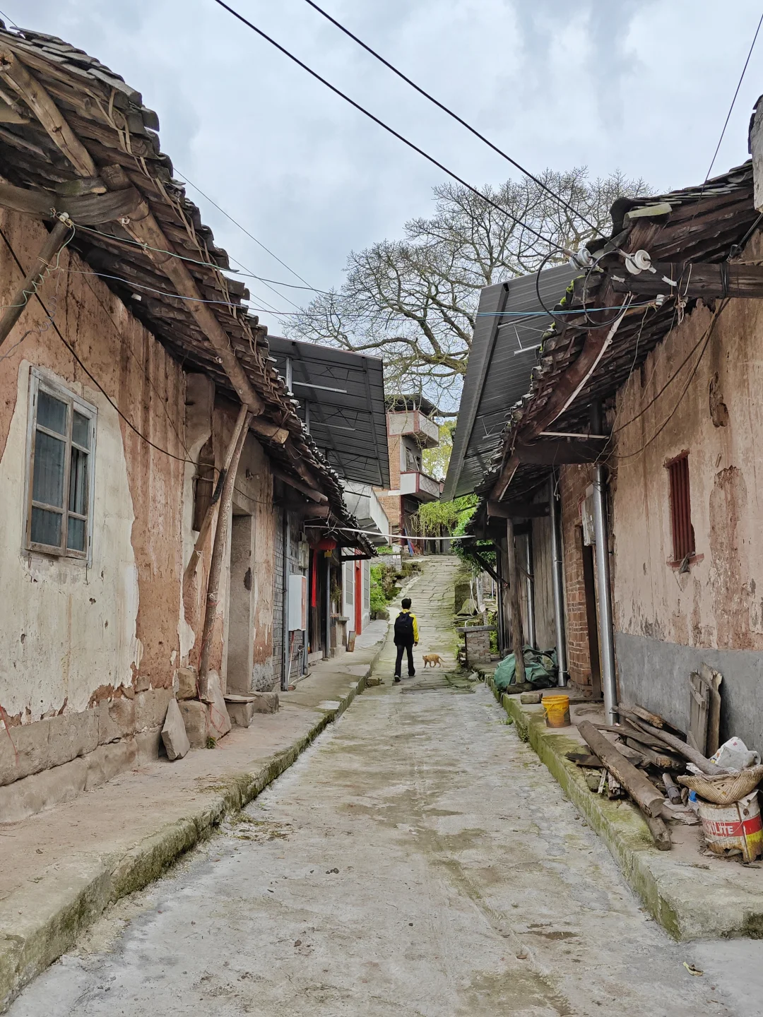 这次我去的是邮亭镇的老街。老街离高铁站很近,公交车五分钟就开到了。这条老街大概长六七百米,两边房屋非常破旧,有一半是解放前典型的四川民居风格,竹木夹壁夯土房,一楼一底,大多成了危房,有的甚至塌了一半,在等待着彻底的毁灭。其他房屋也很破旧,有的经过维修,外墙贴了砖石,加固了,还住着人。但这里居民已经搬走了80%,还住着少数老年人。这里面有几栋房屋挂了文物牌,其中一栋是当年邮亭的乡政府办公楼,后来搬走了。这里还有一个春晖学校,好像是小学,还在正常运行。这些破旧房屋里,有人喂了鸡鸭,还有好多只猫,主要是橘猫和狸花猫。有的旧房屋的土墙上还刷了不少当年的标语,依稀可辨,透出计划经济年代中国西南农村的影子。