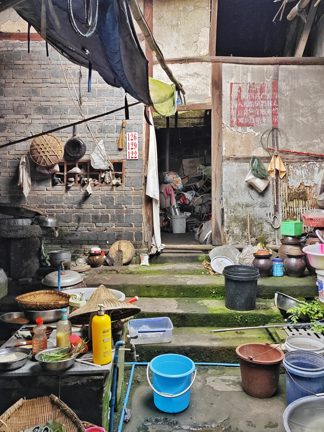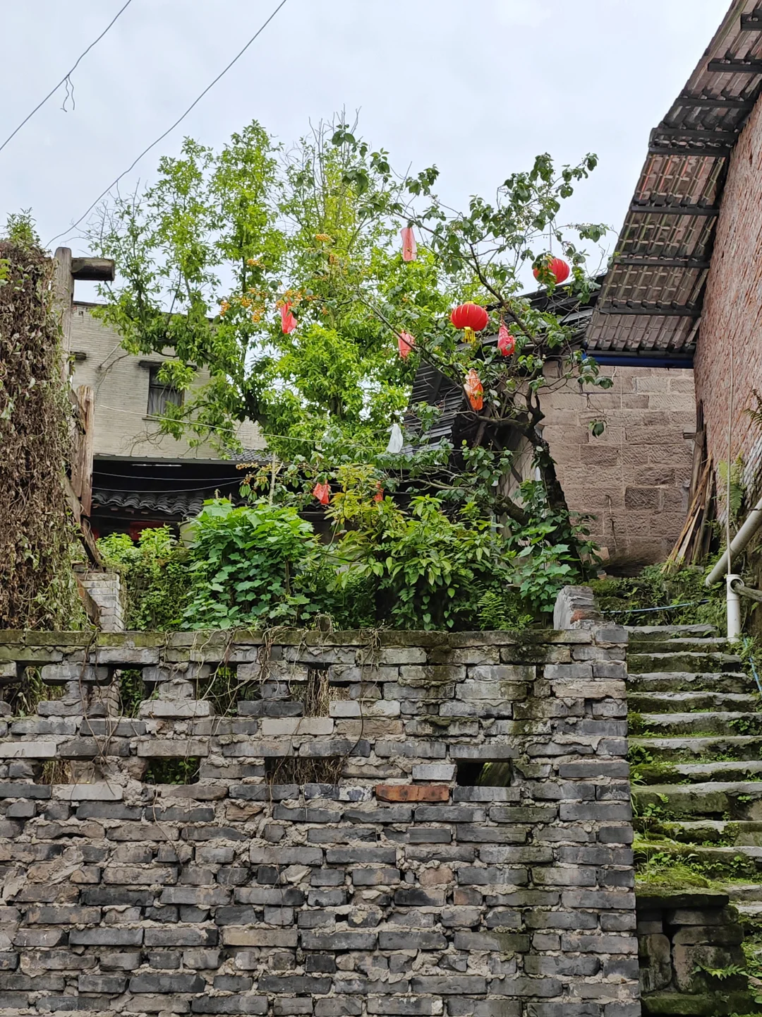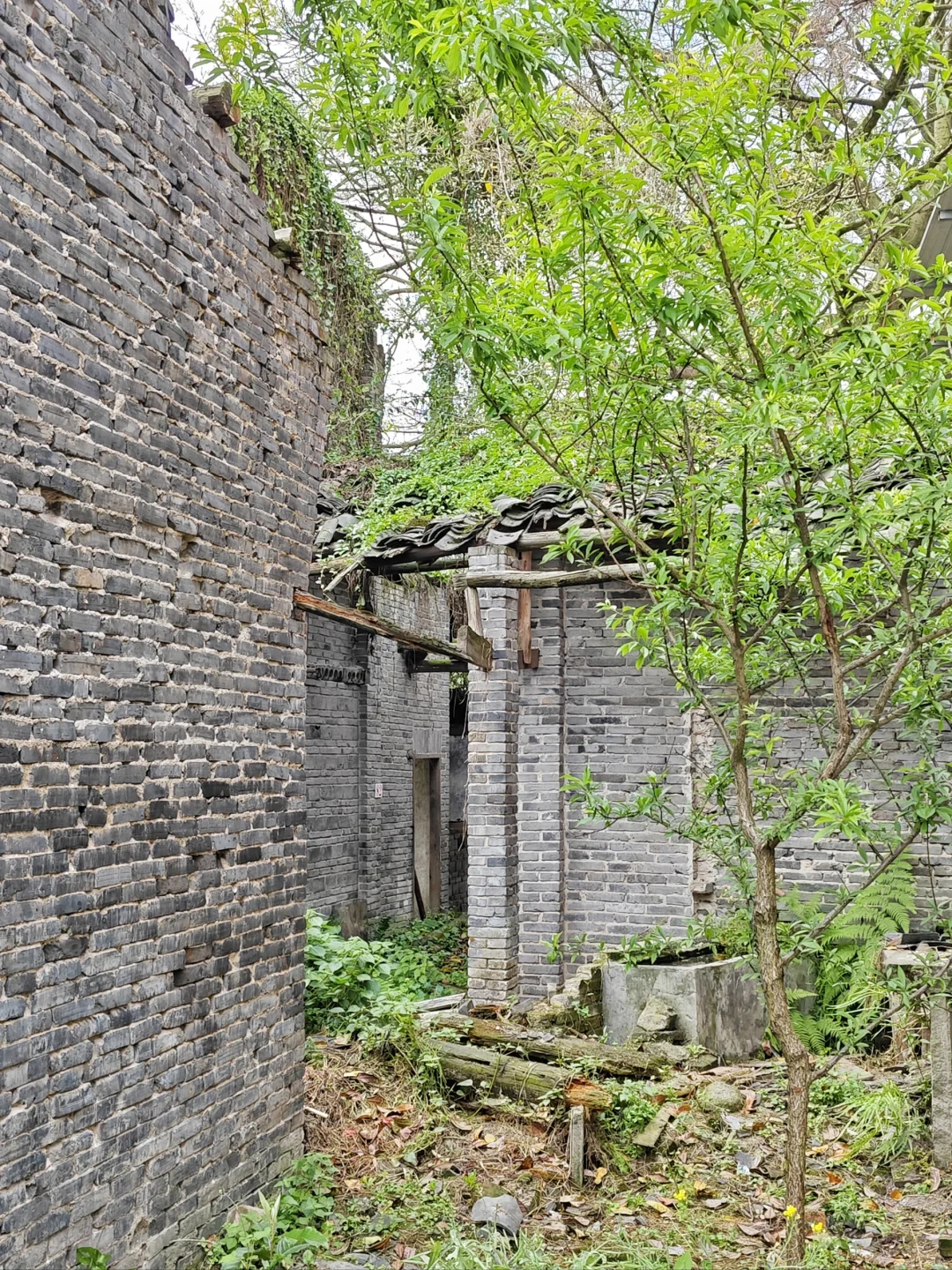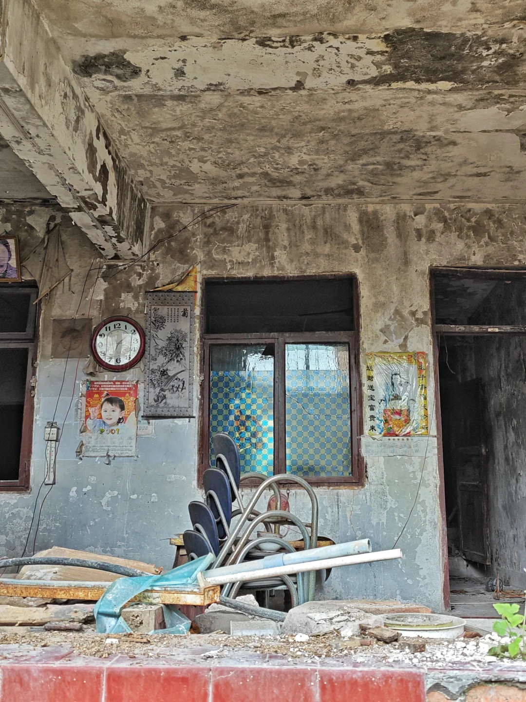 这次我去的是邮亭镇的老街。老街离高铁站很近,公交车五分钟就开到了。这条老街大概长六七百米,两边房屋非常破旧,有一半是解放前典型的四川民居风格,竹木夹壁夯土房,一楼一底,大多成了危房,有的甚至塌了一半,在等待着彻底的毁灭。其他房屋也很破旧,有的经过维修,外墙贴了砖石,加固了,还住着人。但这里居民已经搬走了80%,还住着少数老年人。这里面有几栋房屋挂了文物牌,其中一栋是当年邮亭的乡政府办公楼,后来搬走了。这里还有一个春晖学校,好像是小学,还在正常运行。这些破旧房屋里,有人喂了鸡鸭,还有好多只猫,主要是橘猫和狸花猫。有的旧房屋的土墙上还刷了不少当年的标语,依稀可辨,透出计划经济年代中国西南农村的影子。