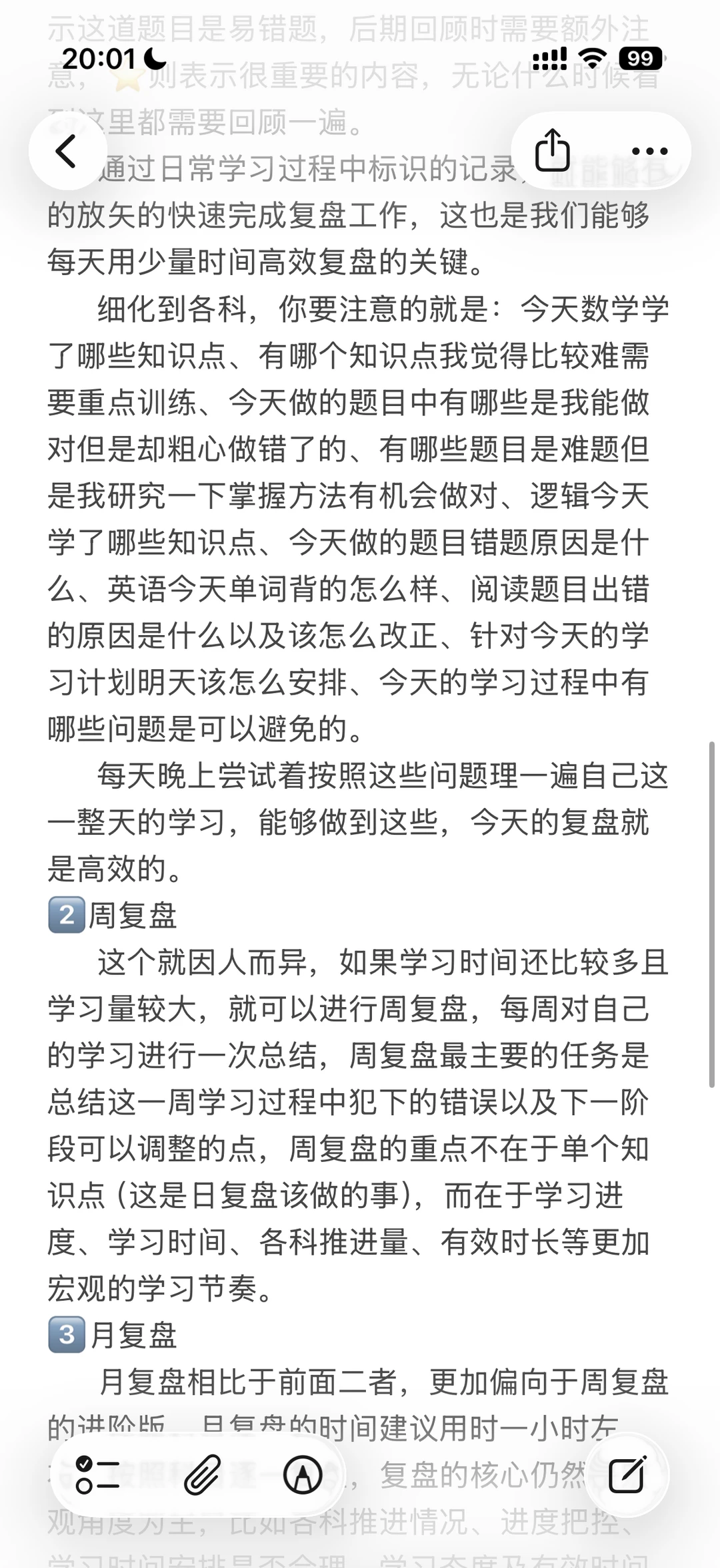 周复盘:侧重宏观节奏,总结本周错误、调整学习进度、时间分配、任务量。