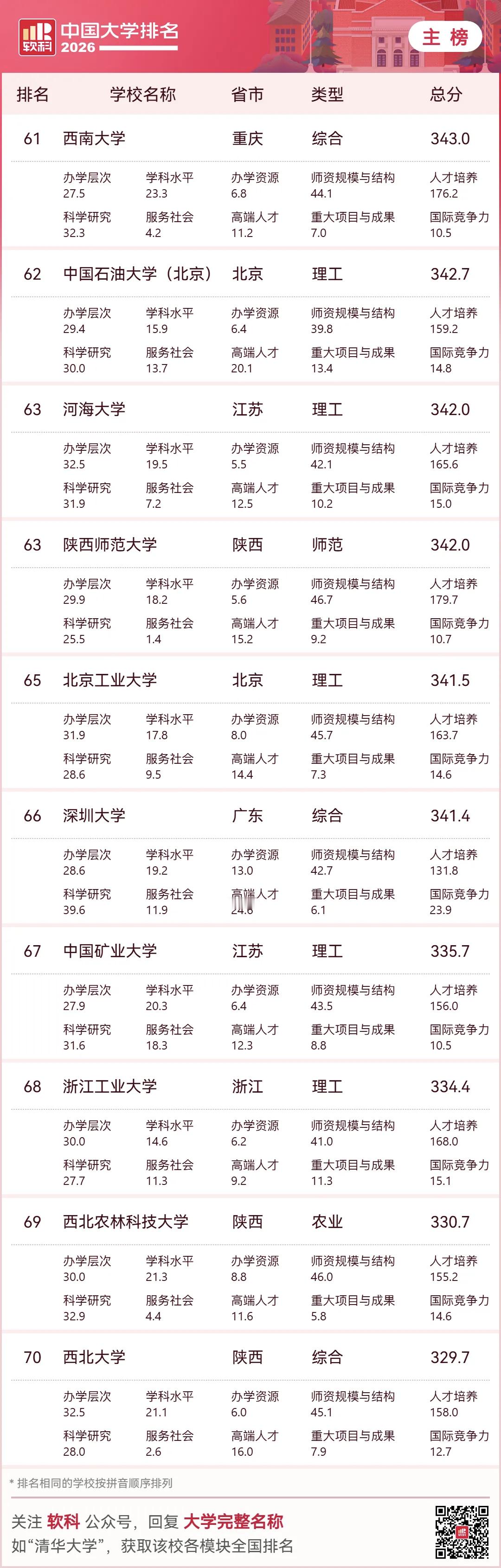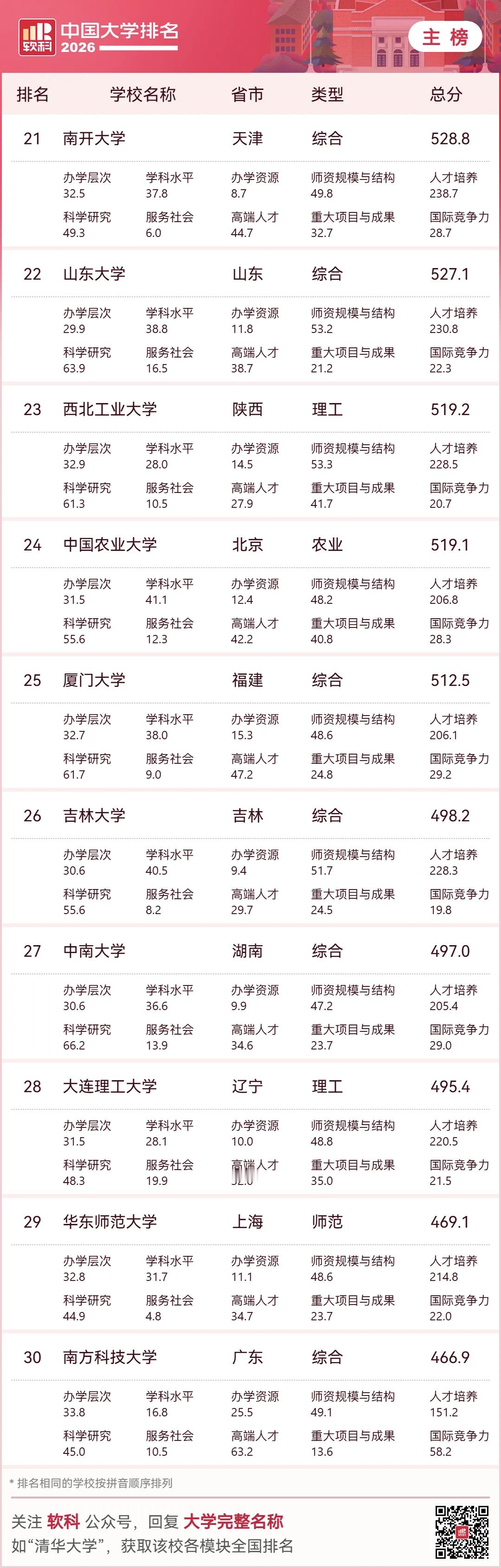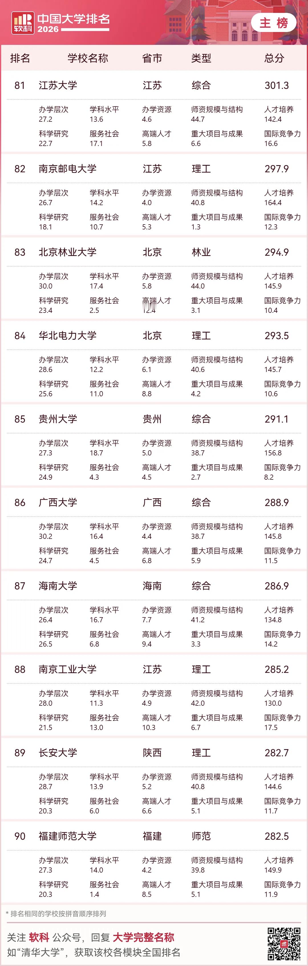 2026中国大学排名科软新出的2026国内大学排名,看看有没有自己的母校。不知道他们这些打分标准、数据怎么来的,好像有很多人质疑中间的部分排名