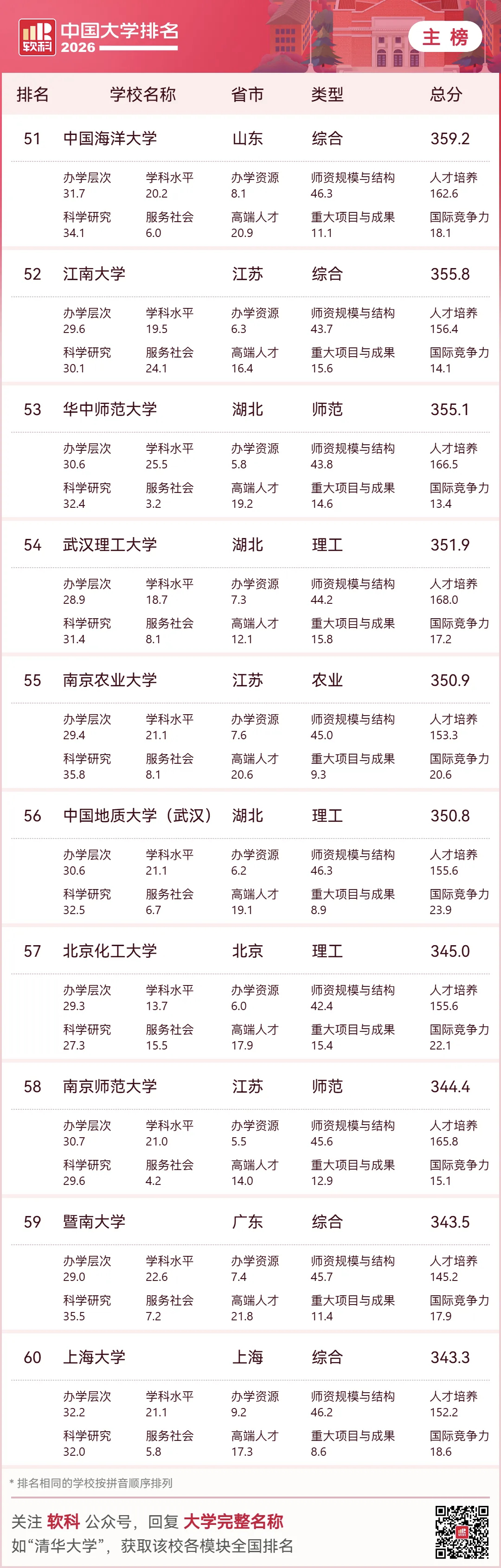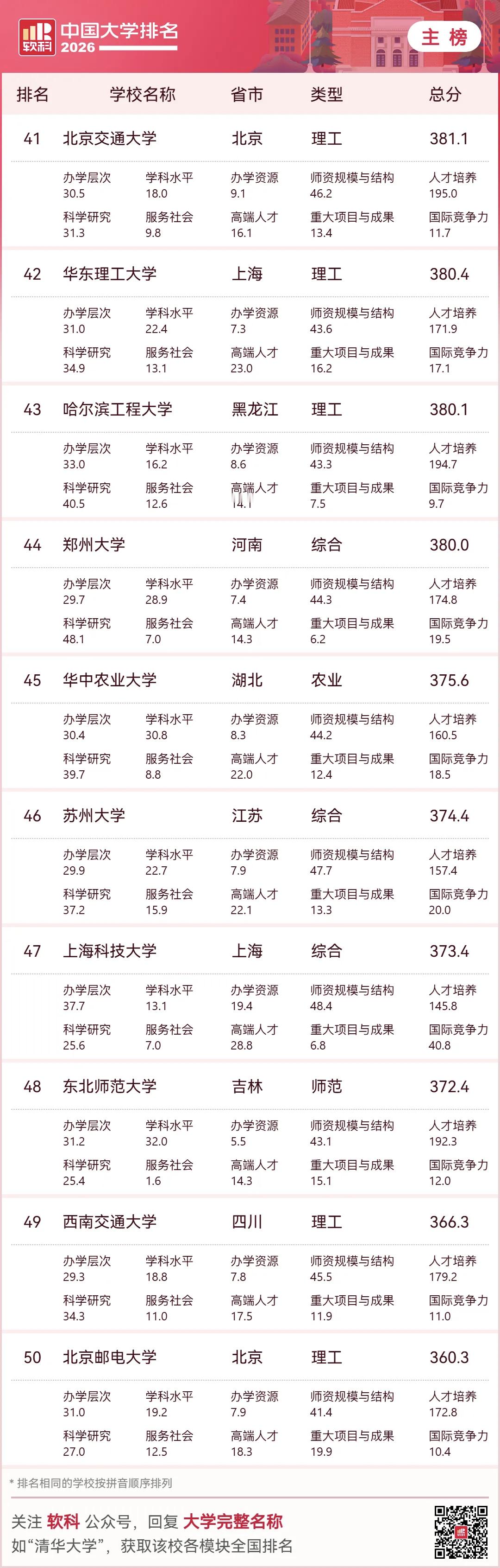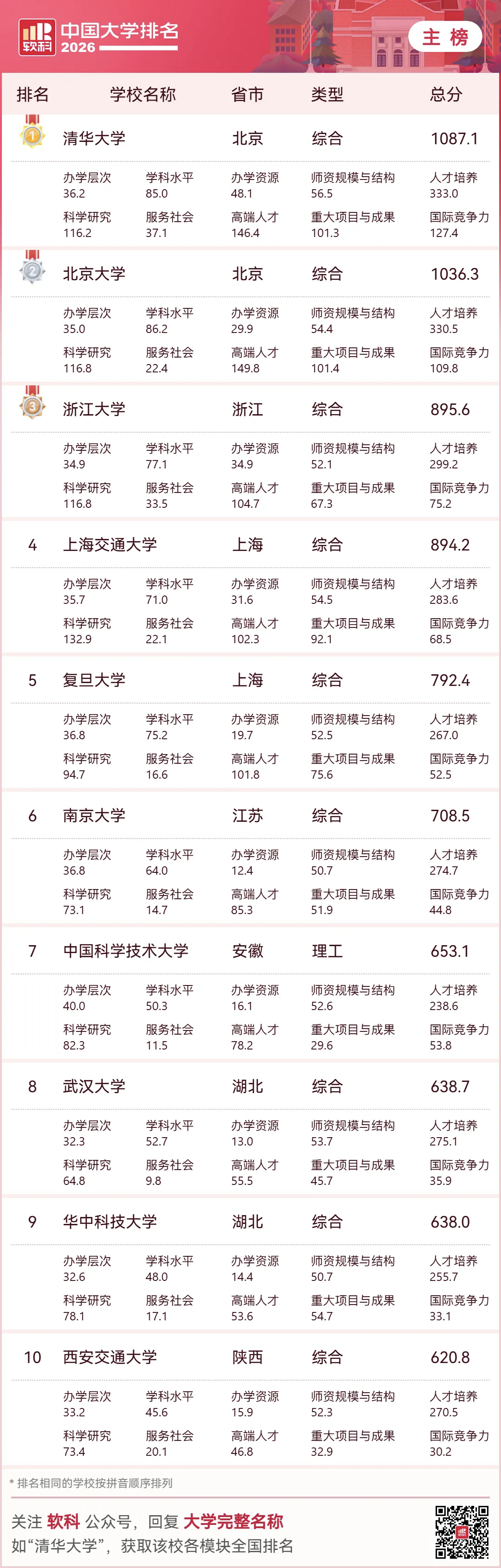 2026中国大学排名科软新出的2026国内大学排名,看看有没有自己的母校。不知道他们这些打分标准、数据怎么来的,好像有很多人质疑中间的部分排名