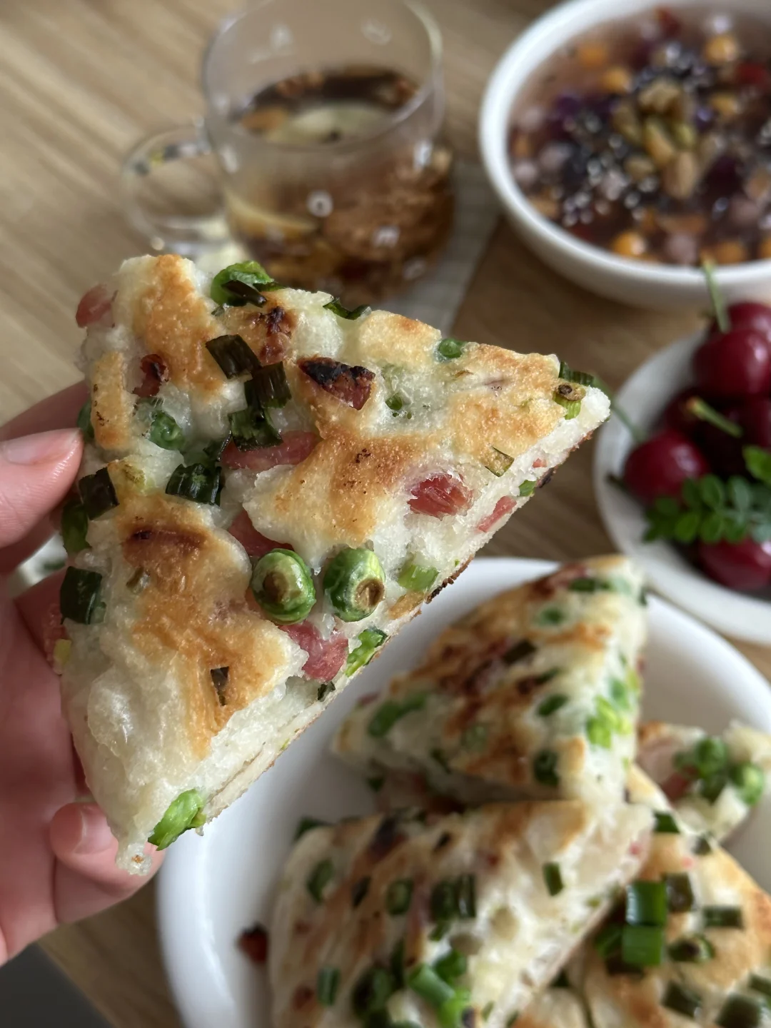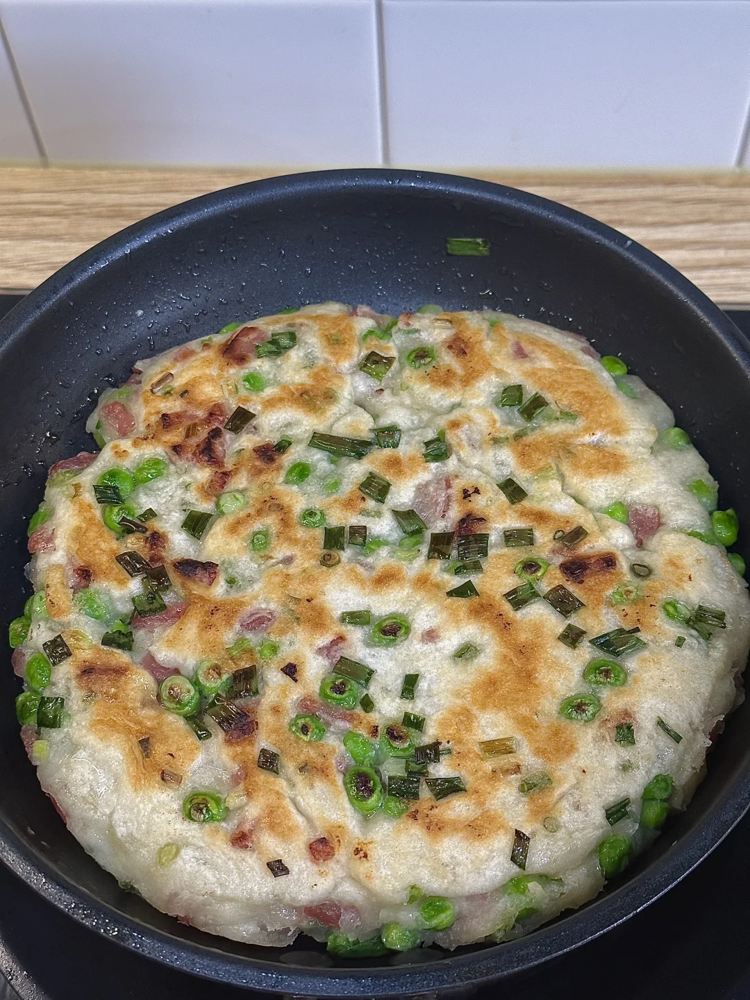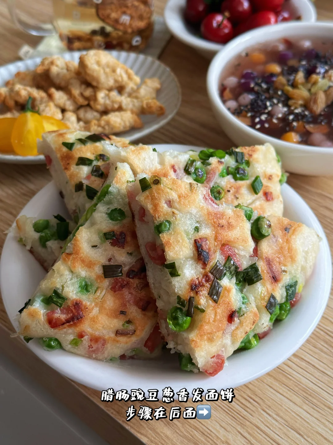 吃起来香极了,外面松脆,里面软软的,有腊肠的咸香和碗豆的清甜,忍不住多吃几块!