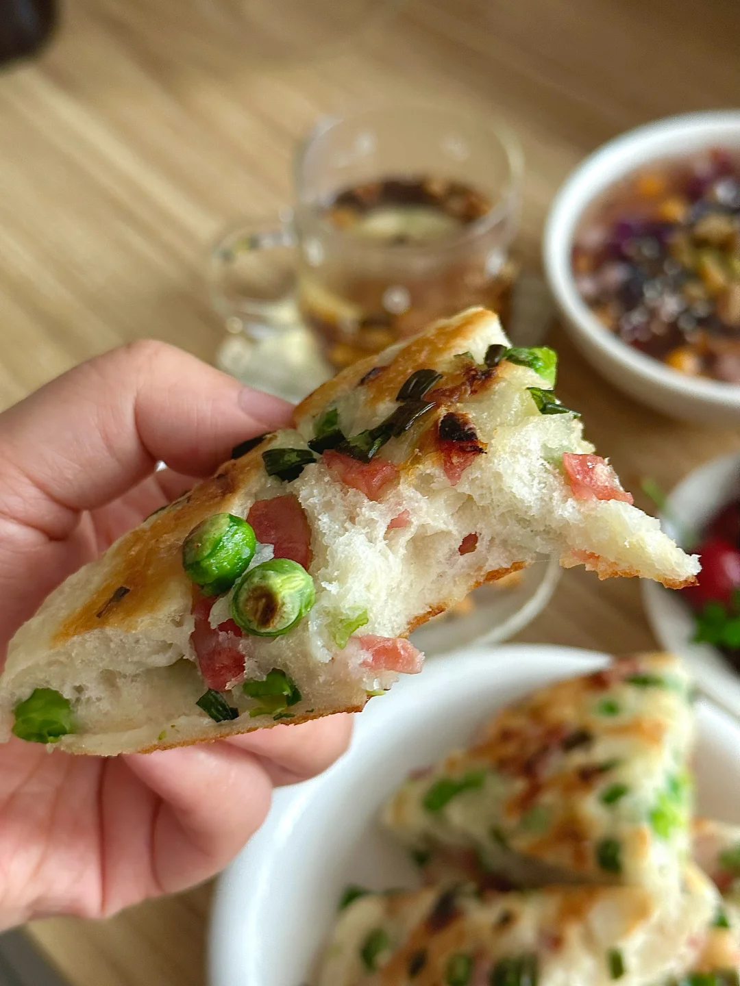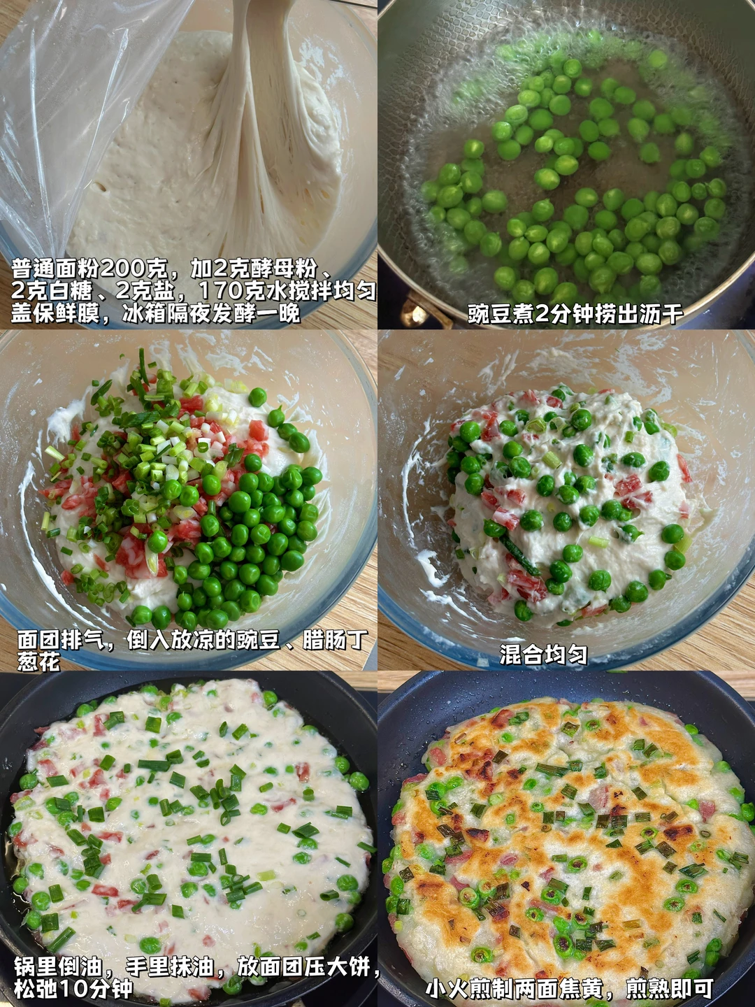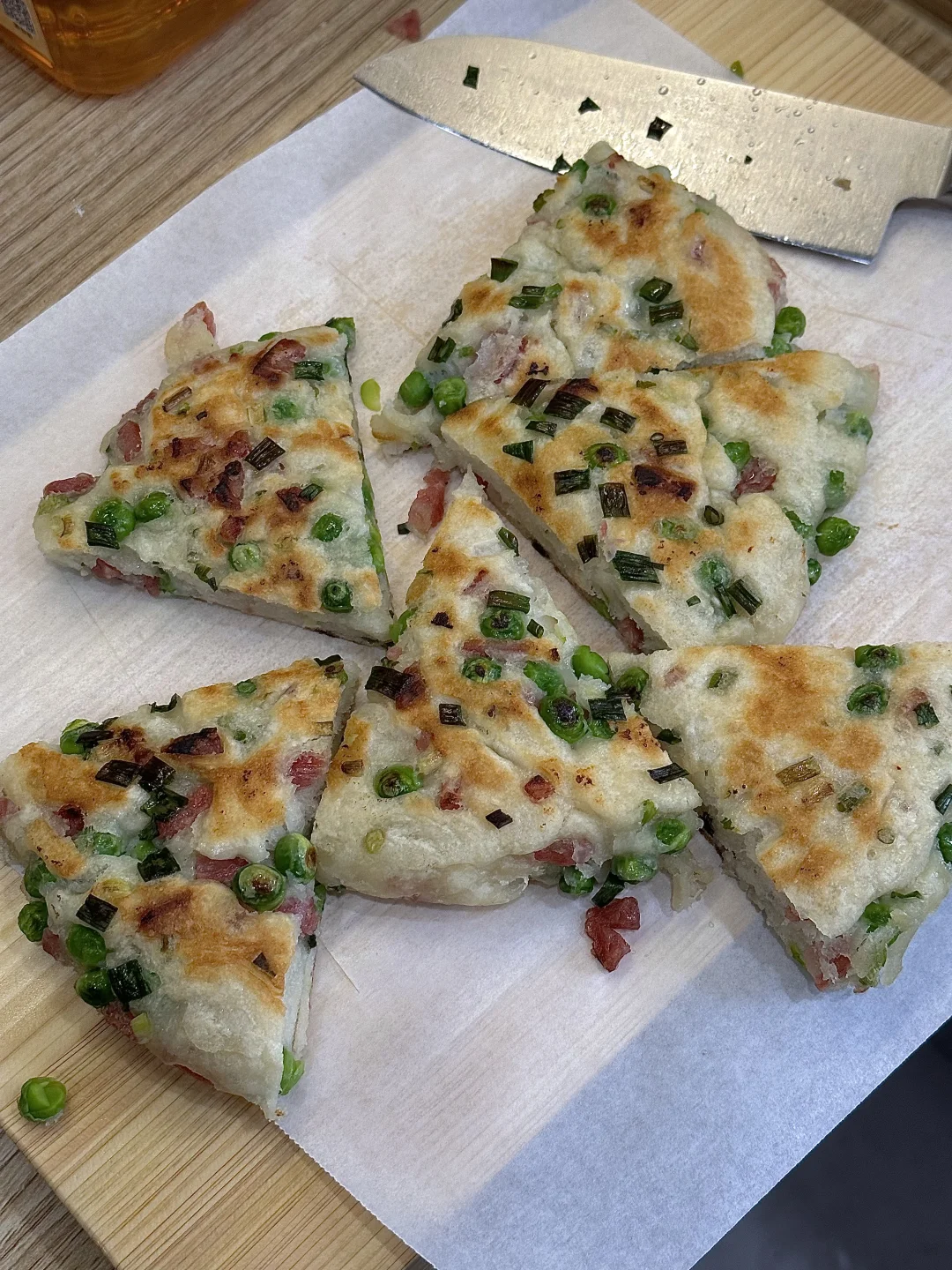 吃起来香极了,外面松脆,里面软软的,有腊肠的咸香和碗豆的清甜,忍不住多吃几块!