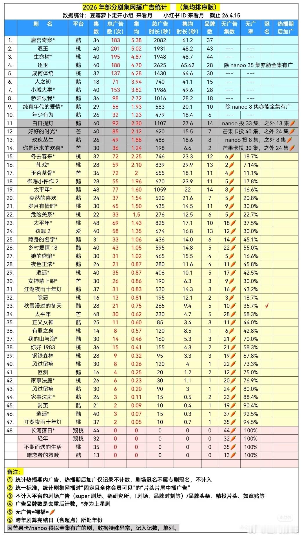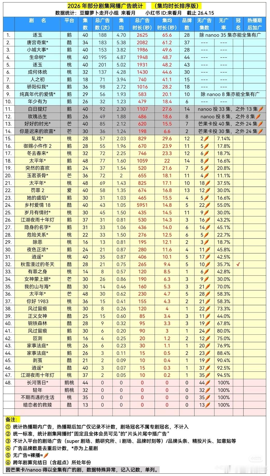 截至今日4月15号,2026年剧集招商广告统计有集均时长排序版+集均排序版+各平台版