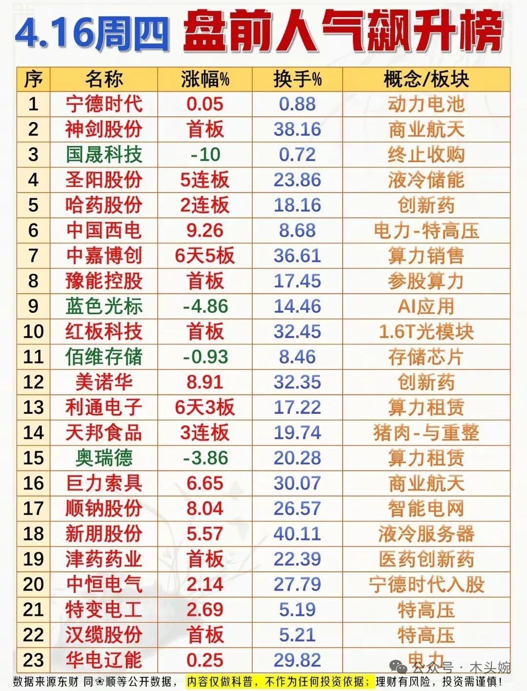 盘前人气榜出炉,商业航天、算力、医药、电力方向个股霸榜,神剑股份、中嘉博创、圣阳股份等连板高标热度居高不下,明日主线博弈值得重点跟踪。