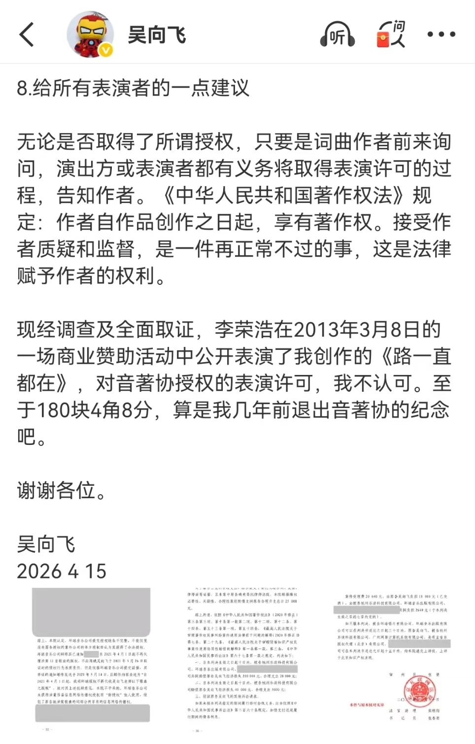 吴向飞再发长文李荣浩方曾支付180.48元版权费 吴向飞再发长文说明