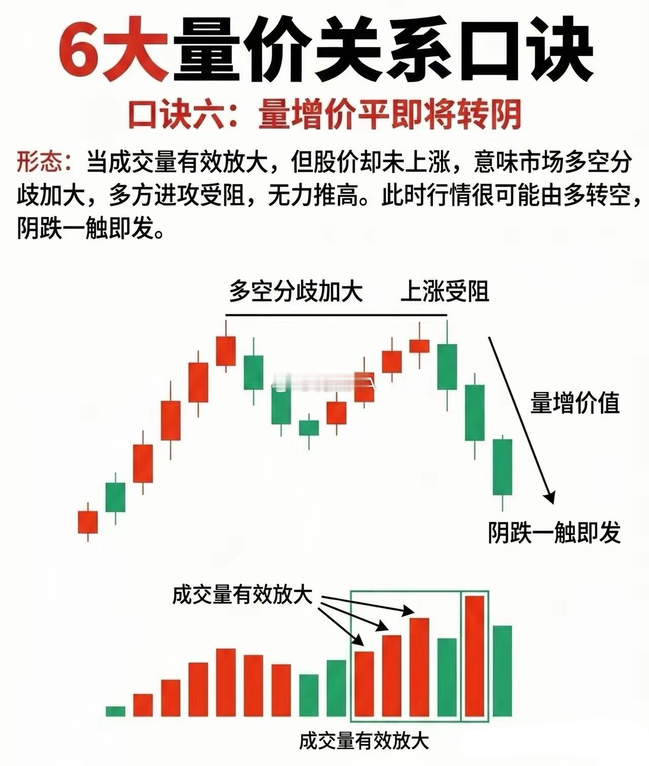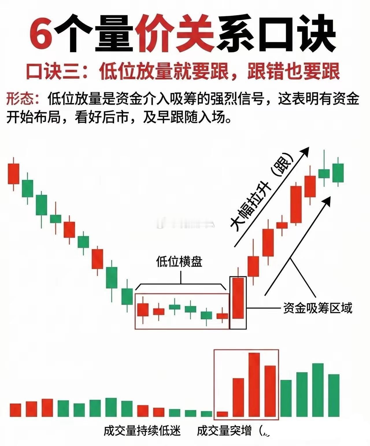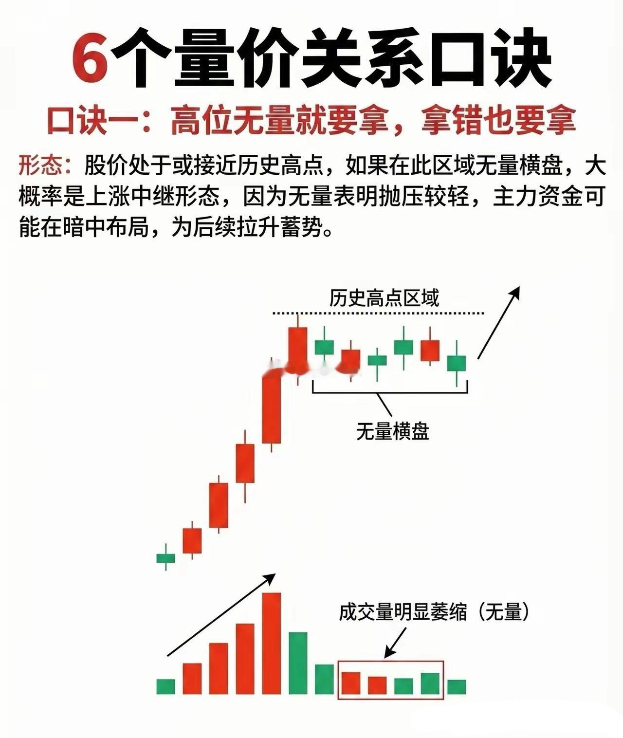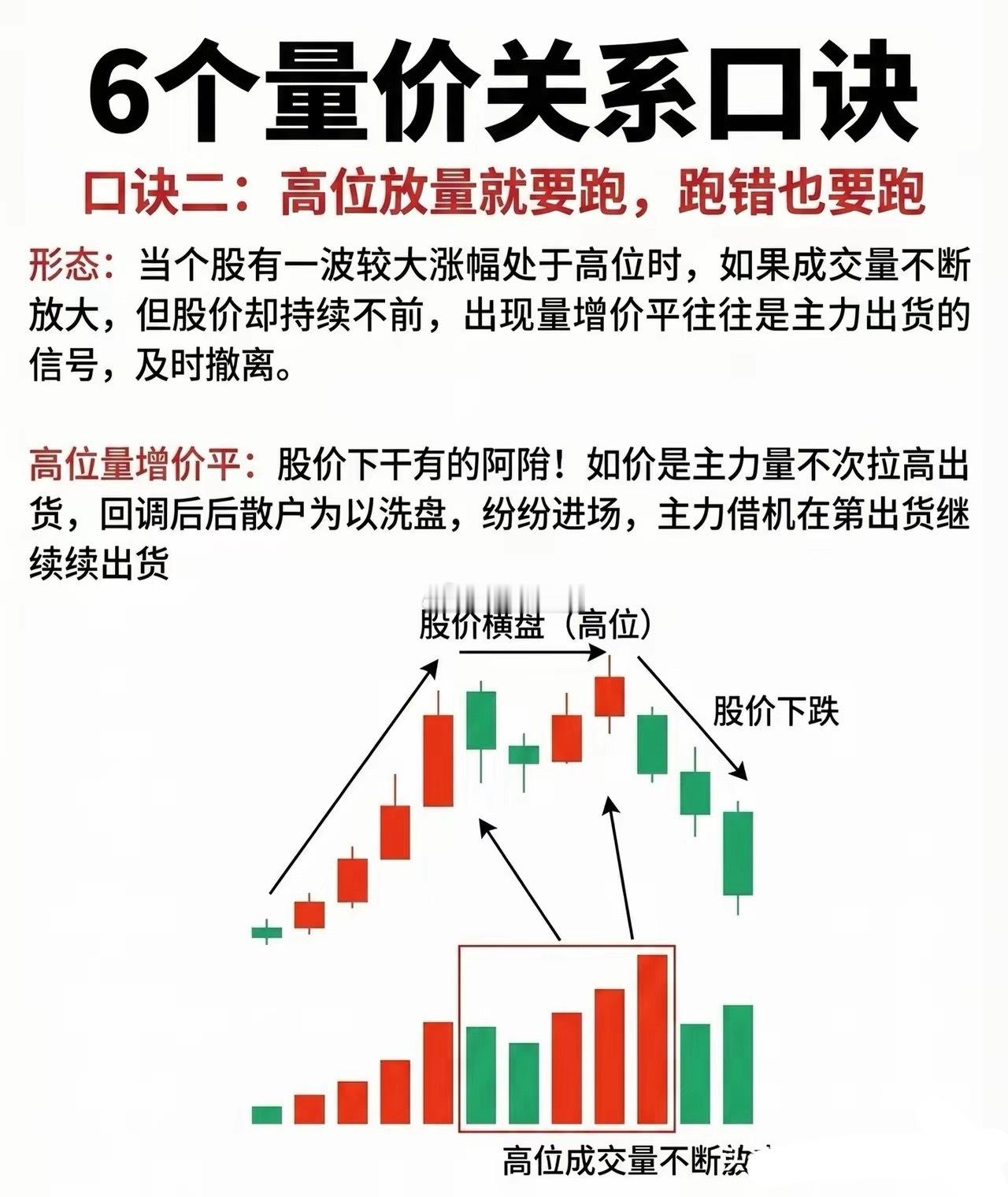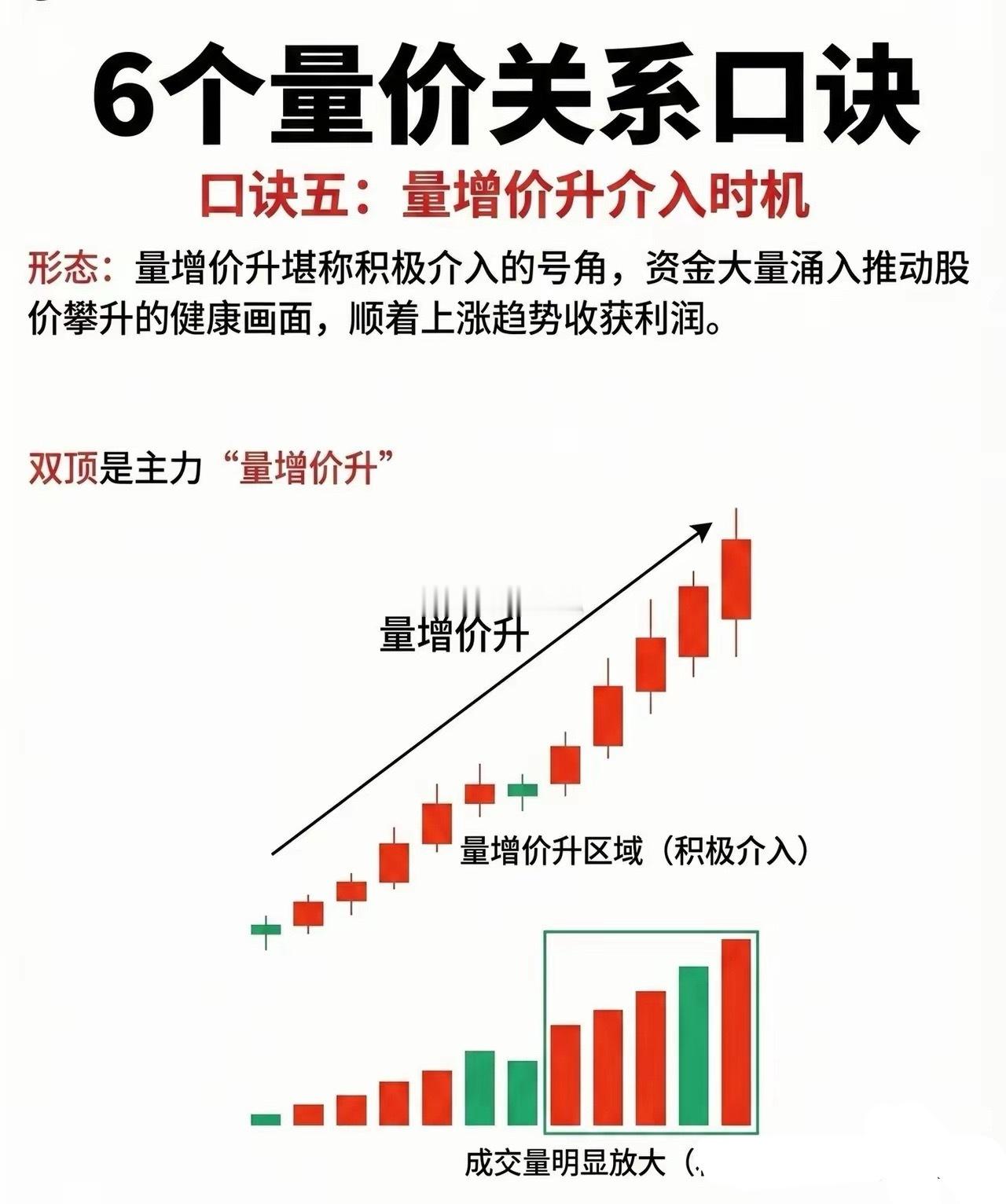 6大口诀吃透量价关系!散户也能靠概率赢过主力做交易的人都懂,技术分析的本质,就是在无数次复盘里,把偶然的涨跌变成可复制的概率。而量价,就是所有技术指标里最不会骗人的“市场心电图”——价格是果,成交量是因,看懂了量价的底层逻辑,就等于拿到了主力资金的“行动密码”。很多人总觉得技术面千头万绪,K线、均线、MACD绕得人头晕,其实核心就6句大白话,把高低位、量能、涨跌的关系拆解得明明白白,每一句都是无数次实战验证的高概率规律。先看高位的生存法则:高位无量就要拿,拿错也要拿;高位放量就要跑,跑错也要跑。股价摸到历史高点,最怕的不是横盘,而是放量。如果高位无量横盘,说明抛压已经彻底释放,主力根本没走,只是在洗盘蓄势,这时候拿住,大概率能吃到主升浪;可一旦高位放量滞涨,就是主力在借人气出货,哪怕卖飞也要跑,晚一步就是深套。再看低位的布局逻辑:低位放量就要跟,跟错也要跟;低位无量就要等,错也要等。股价在底部趴了很久,突然一根大阳线带量突破,就是资金进场吸筹的信号,哪怕短期有回调,也要果断跟,这是趋势反转的起点;但如果低位一直无量横盘,说明主力还没准备好拉升,市场没有赚钱效应,这时候千万别瞎抄底,耐心等放量信号,等风来比瞎折腾靠谱100倍。最后是趋势的判断核心:量增价升介入时机,量增价平即将转阴。上涨过程中,成交量跟着股价一路放大,是资金持续进场的健康走势,这时候大胆介入,顺着趋势吃肉;可一旦成交量放大,股价却涨不动了,就是多空分歧加大、主力偷偷出货的信号,阴跌马上就来,必须立刻离场。技术分析从来不是玄学,而是概率的游戏。你复盘100次,就会发现这6种量价形态的胜率远超随机操作;你实战100次,就会明白“不追高、不抄底、看量能”的铁律有多重要。散户最大的优势,从来不是资金和信息,而是看懂主力的行为逻辑,用高概率的规则,把市场的波动变成自己的利润。记住,市场永远不缺机会,缺的是能管住手、看懂信号的人。把这6句量价口诀刻进脑子里,用无数次复盘打磨自己的交易体系,你就能在涨跌无常的市场里,靠概率稳稳立足。