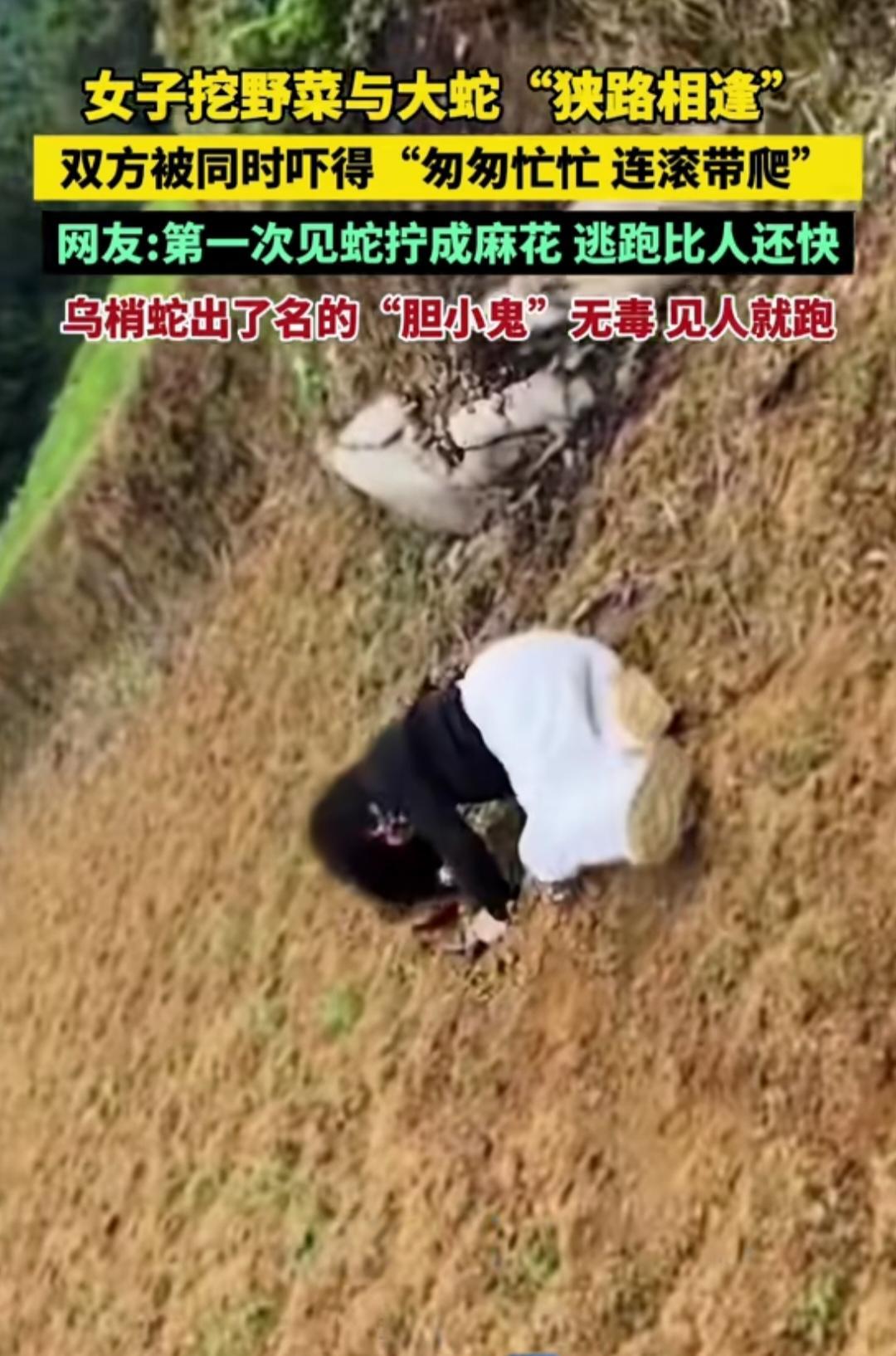 “笑不活了!”四川,女子去挖野菜,突然看到一条大蛇。没想到,她和大蛇同时吓得连滚带爬,更没想到,大蛇逃得比她还快。