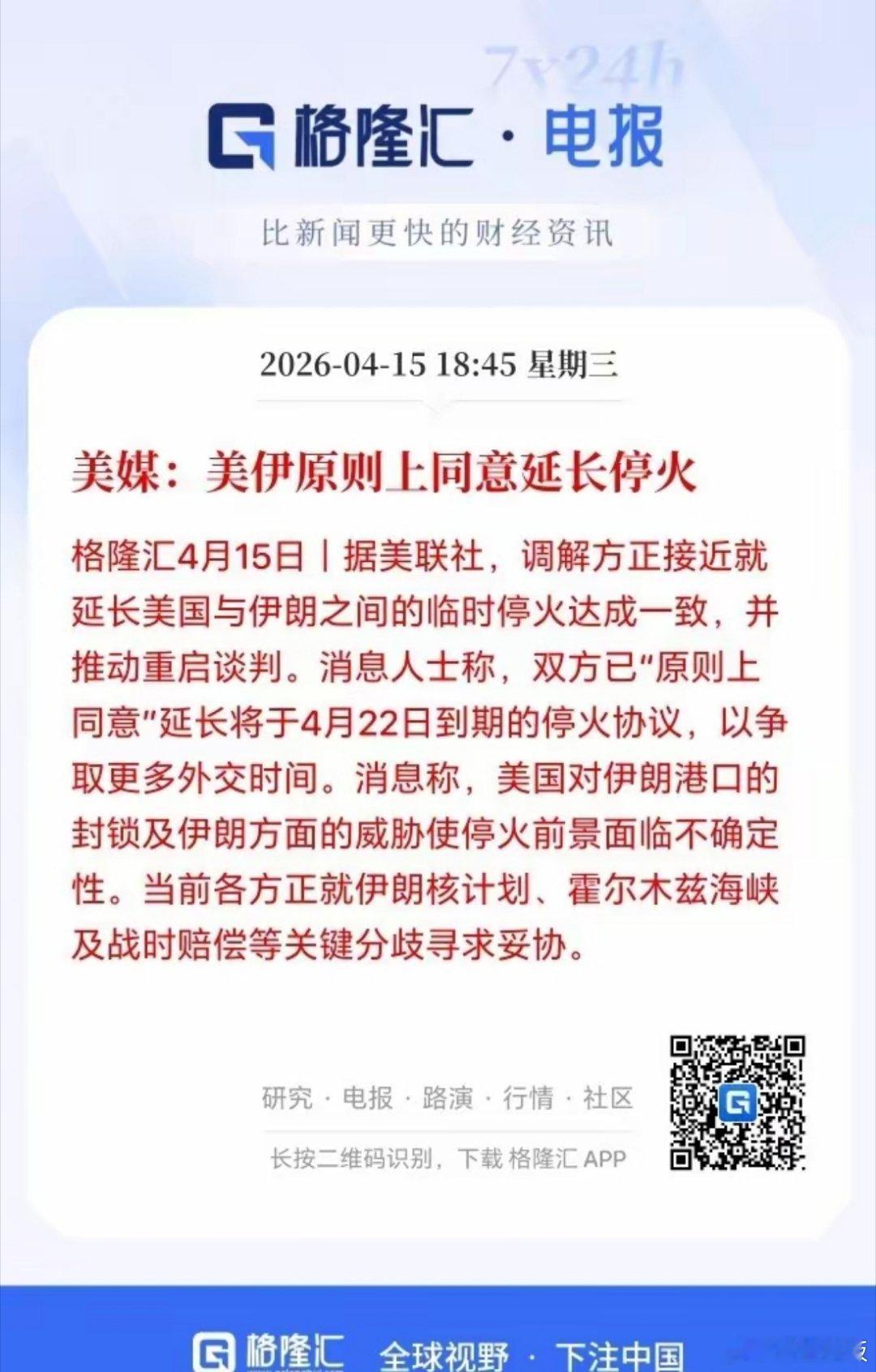 重大利好!美伊停火有望延长了,4月份的股市应该问题不大了?据格隆汇引述美联社的消息,美伊双方已“原则上同意“延长将于4月22日到期的停火协议,以争取更多外交时间。川子也表示伊朗战事的最终结果可能很快就会取得。这个最终结果是什么?客观而言,美伊双方基本已都不想恋战。当然除了以色列之外。再打,最获利的就是以色列。美国又能得到什么?所以美伊谈判再次启动应该就是大概率事件!