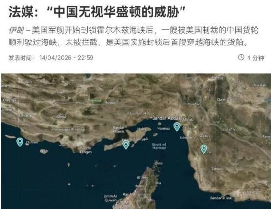 法媒表示,毫无疑问,中国无视了华盛顿的威胁!在中国油轮“富星”号通过霍尔木兹海峡之后,4月15日,法新社刊文表示,美国军舰开始封锁霍尔木兹海峡后,一艘被美国制裁的中国货轮顺利驶过海峡,未被拦截,这是美国实施封锁后首艘穿越海峡的货船。