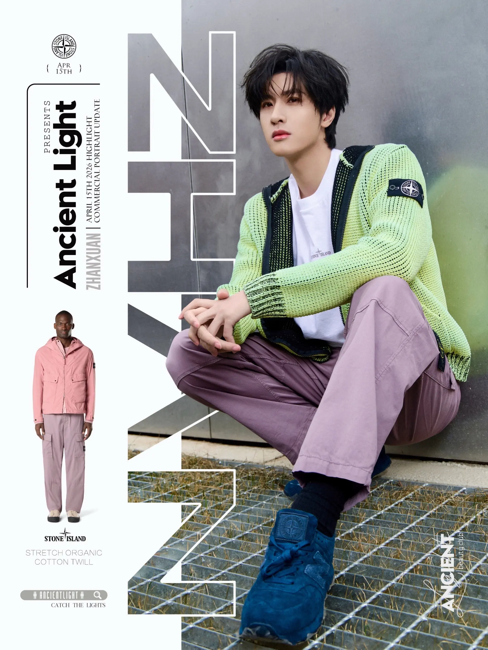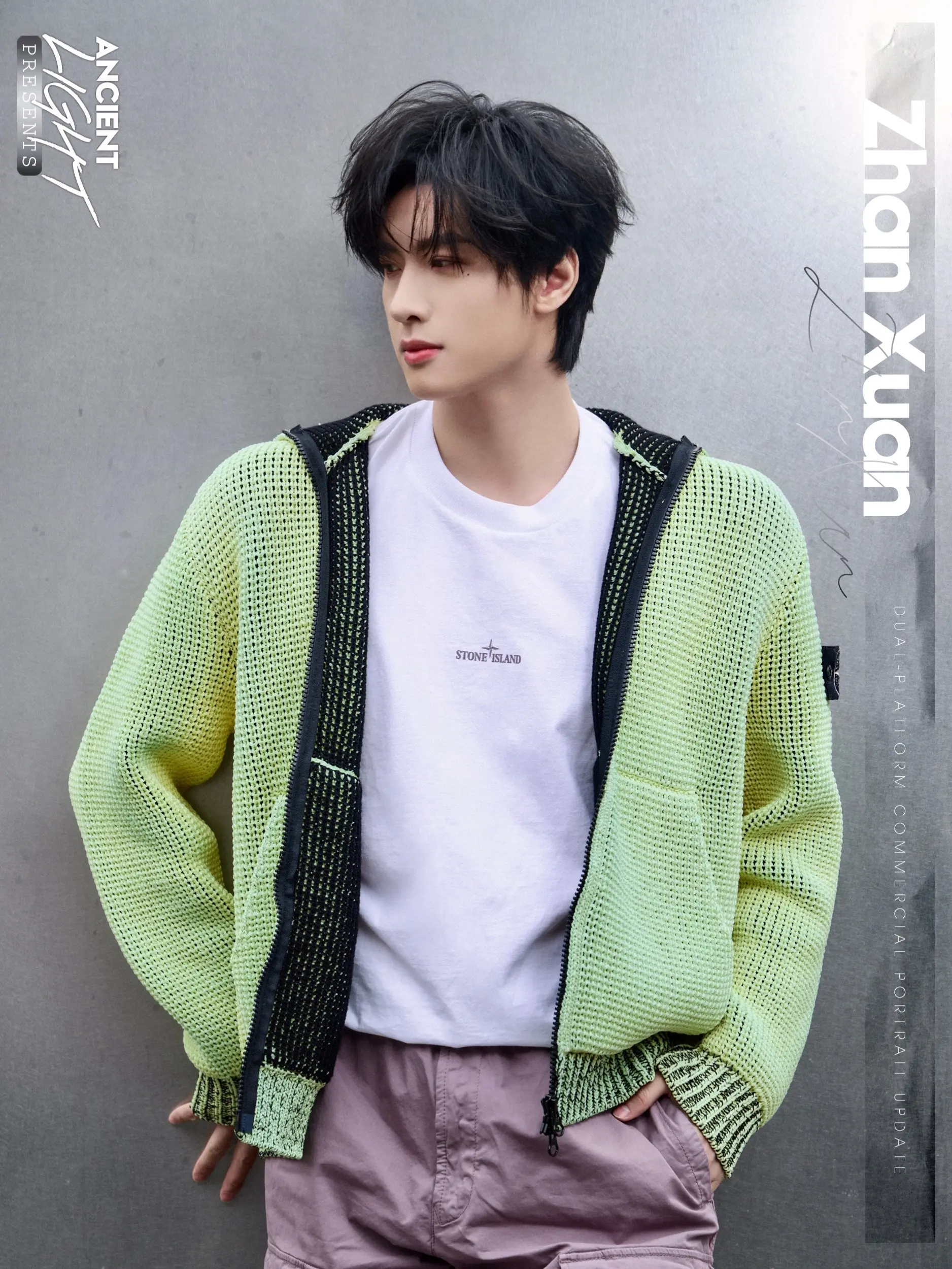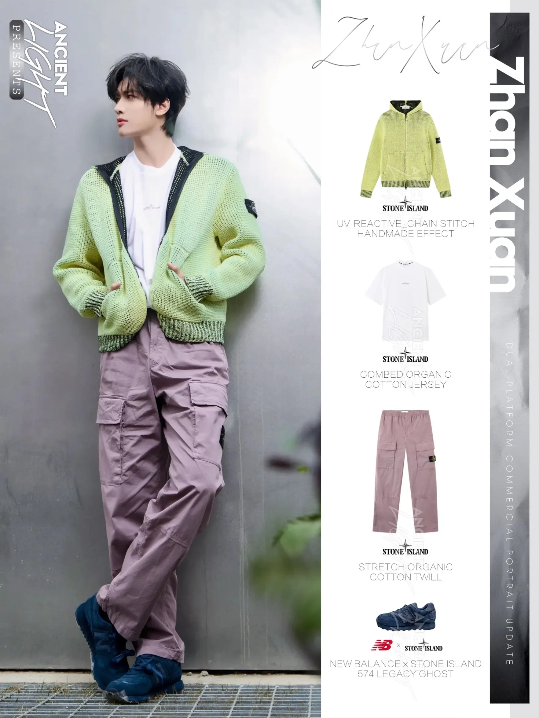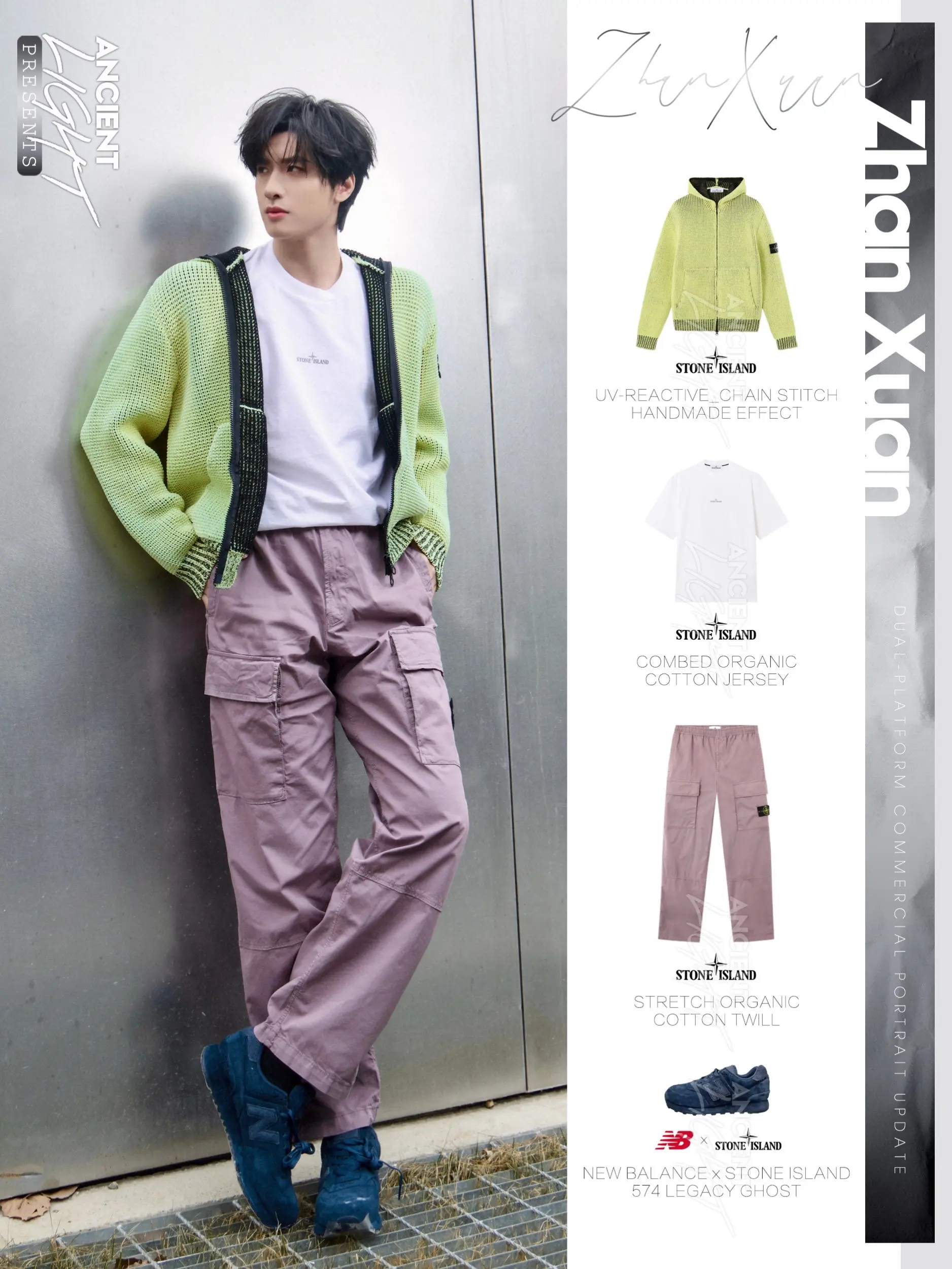 展轩· 不必费力打扮,春日漫游般惬意。春日序章,不必用力打扮。荧光绿镂空针织开衫,像把清晨的柔光穿在身上,UV链状绣让微风自由穿过。搭一条香芋紫工装裤,冷与暖在色彩里轻盈对谈。罗盘徽章安静点缀,机能感也有了诗意。走在草地或街角,每一步都是春天的漫游。