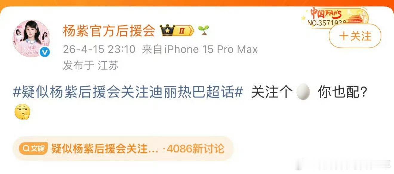疑似杨紫后援会关注迪丽热巴超话杨紫官方后援会回应了:关注个🥚你也配!啊这……两