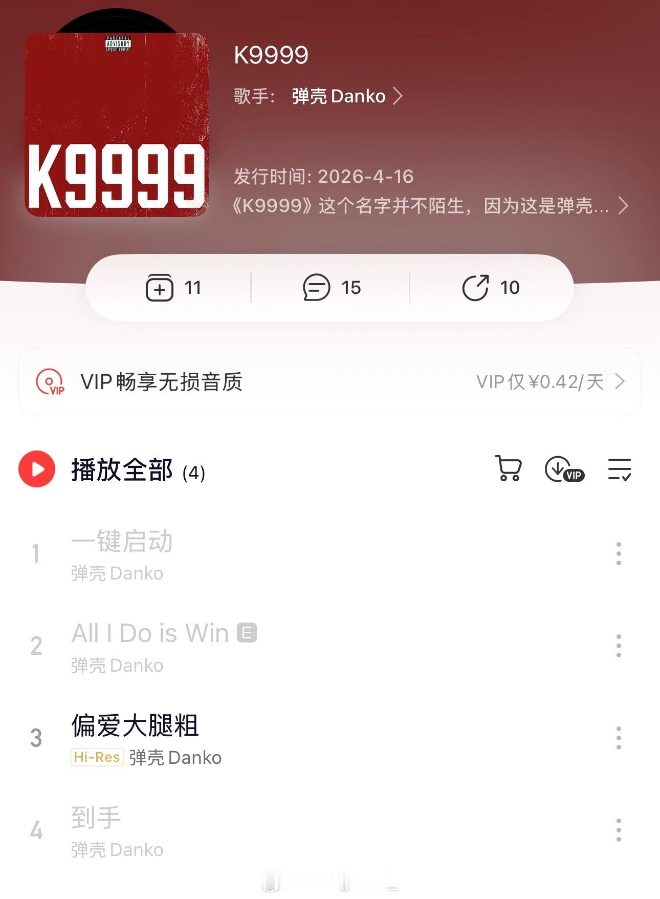 来了!弹壳新专辑《K9999》上线,不过目前只有《偏爱大腿粗》一首能听,其余还有
