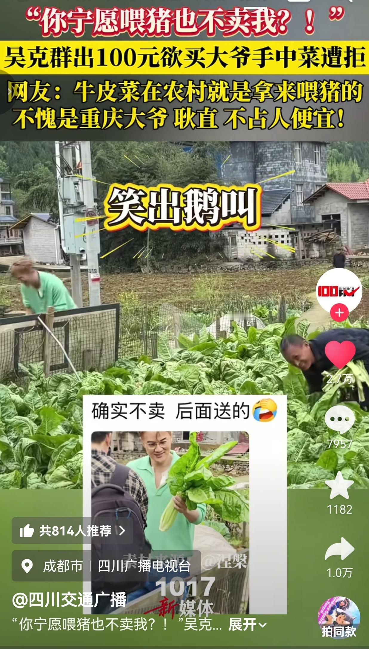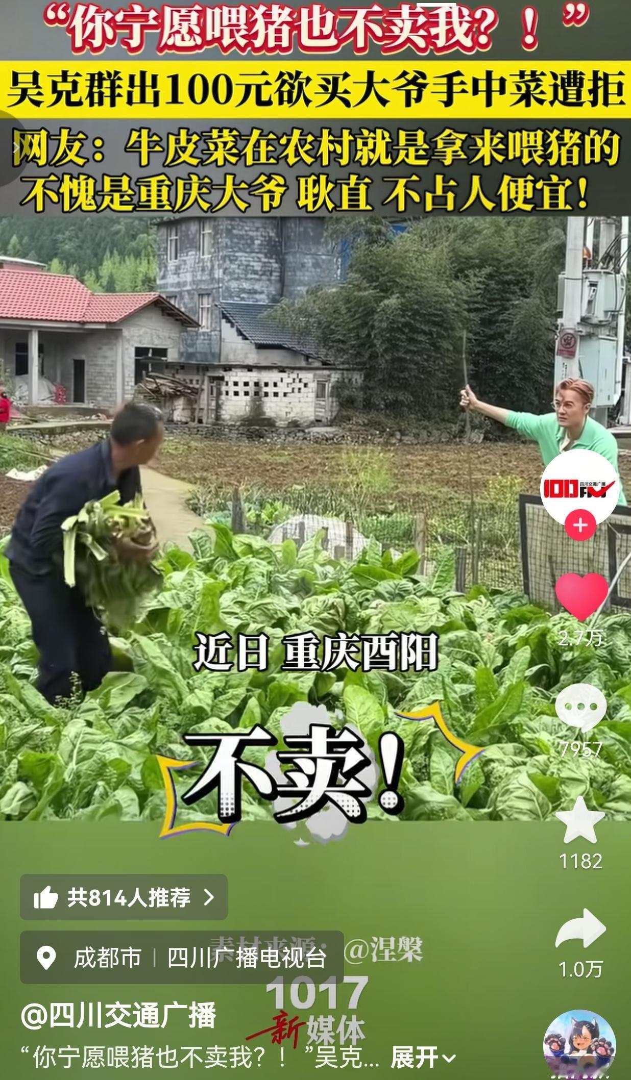 可这位重庆大爷呢?人家明星主动掏100块,就买几根喂猪的破菜,他说啥都不卖!