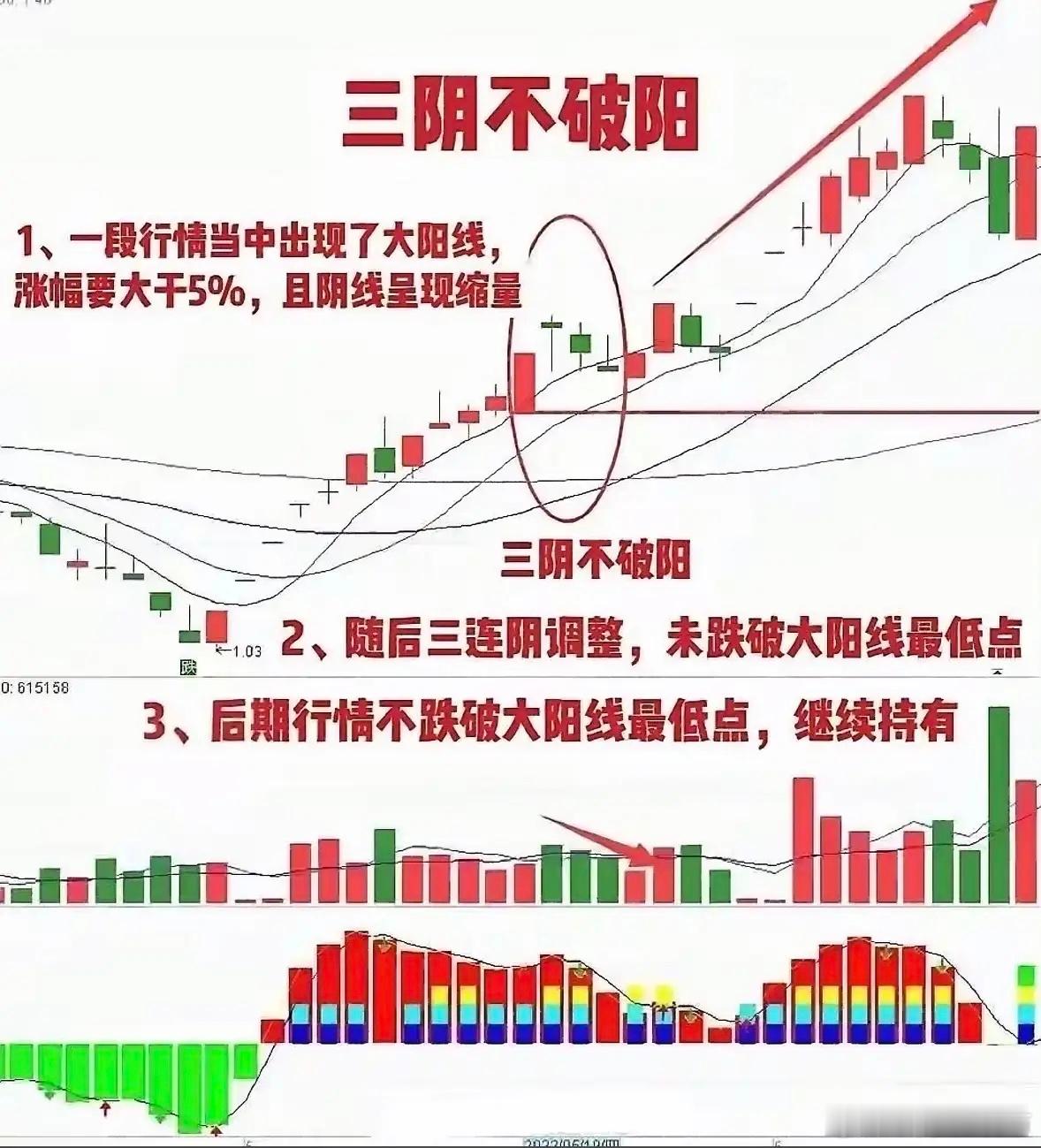 “三阴不破阳,后市看涨”,这可是经典的K线看涨信号。