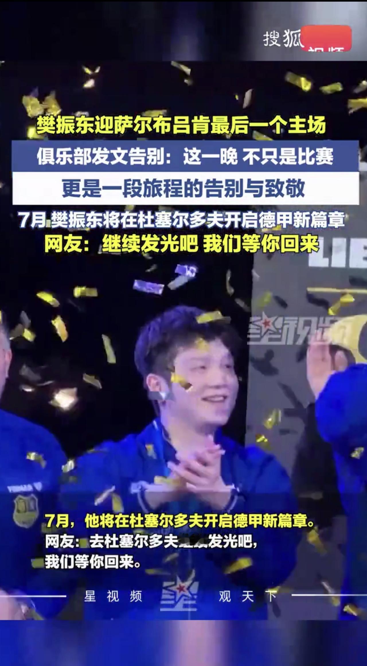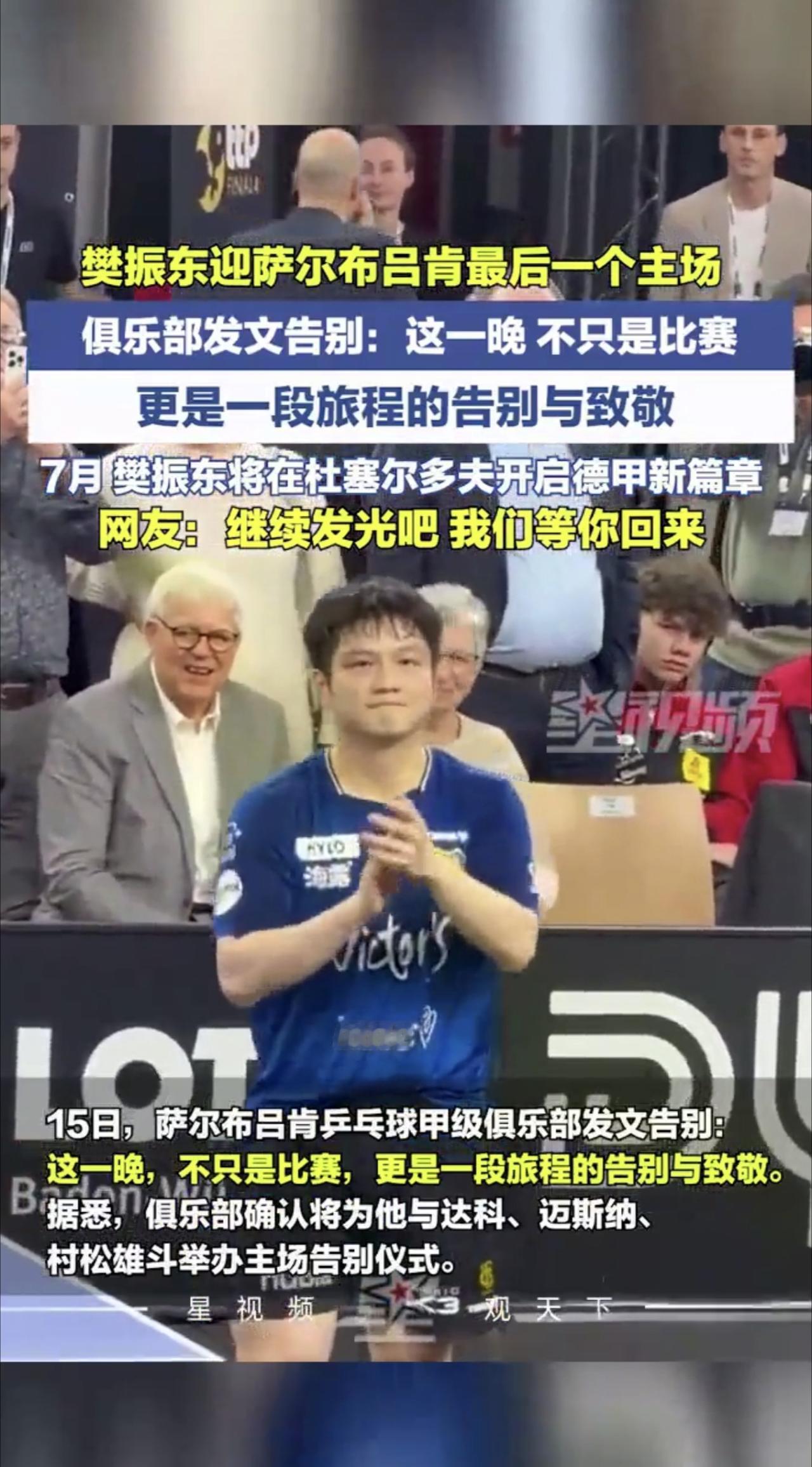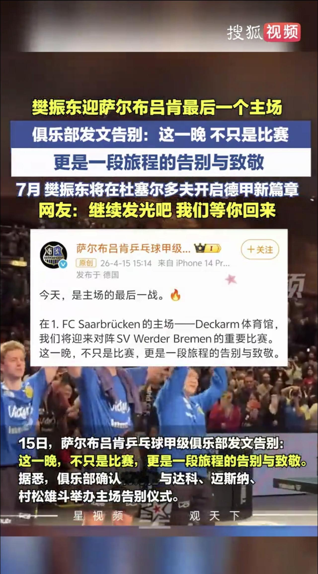 4月15日,萨尔布吕肯乒乓球甲级俱乐部发文,宣布在北京时间4月16日凌晨主场收官战中,为樊振东举办最高规格告别仪式。俱乐部以城市命名道路、文化共鸣、数据致敬三重形式致敬,发文称“这一晚,不只是比赛,更是一段旅程的告别与致敬“。樊振东