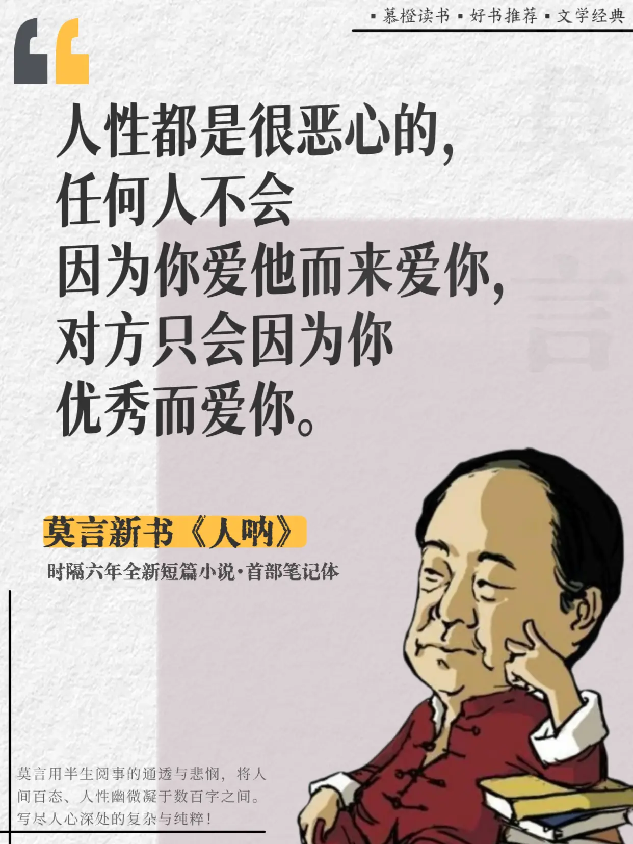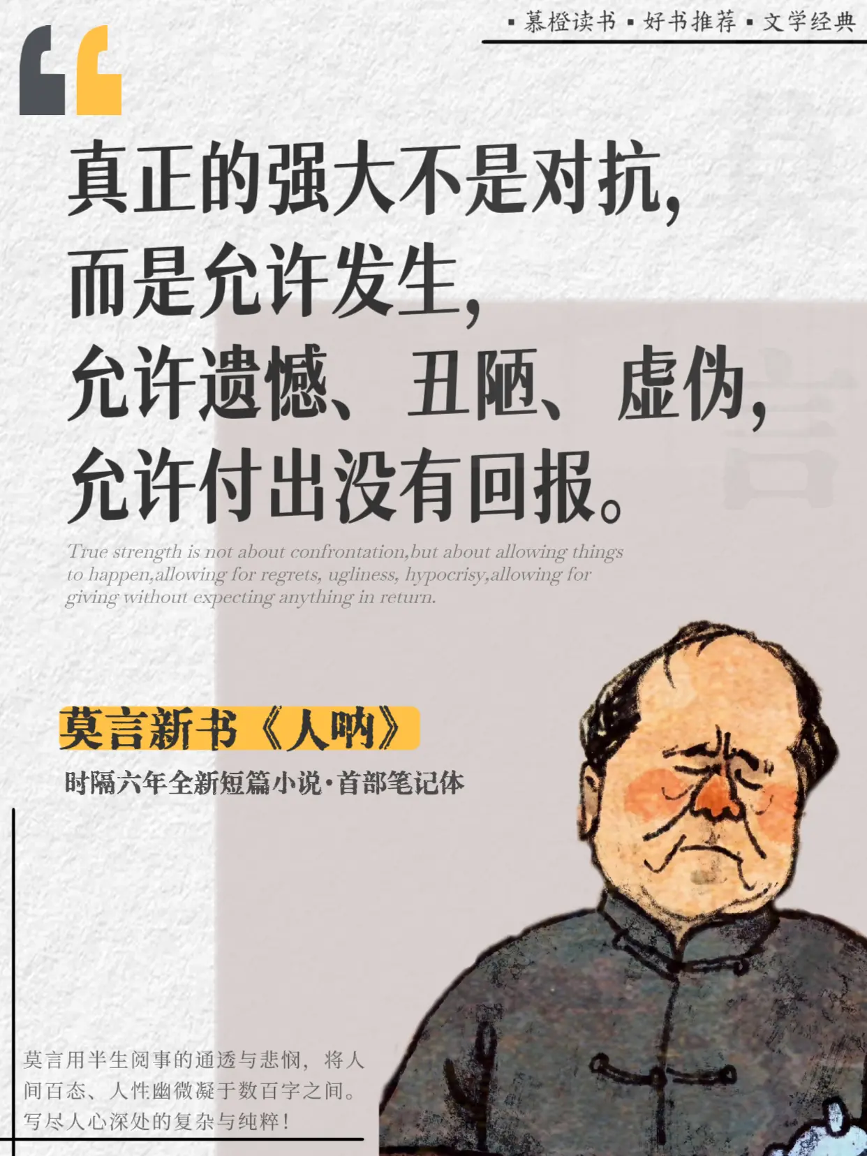 莫言新书,读完整个人都通透了!终于熬夜读完莫言的《人呐》,合上书久久不能平静。写人性,还得是莫言老师!七十多岁了还这么敢写,每一篇都太有后劲!他从人情冷暖、人性善恶、生活百态里,写尽了普通人的委屈与坚强,写透了成年人的心酸与无奈。