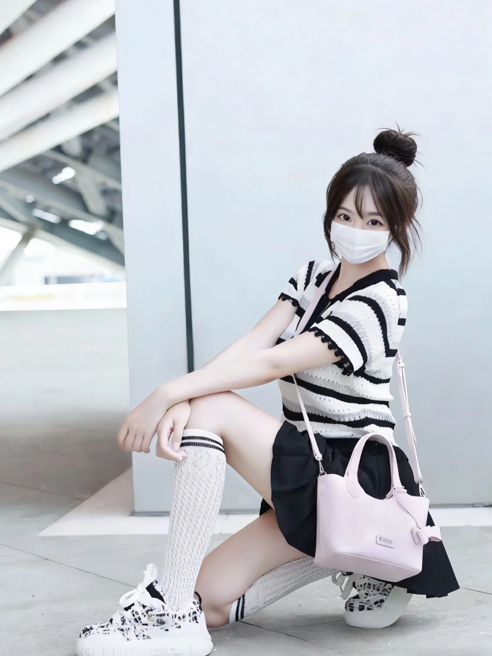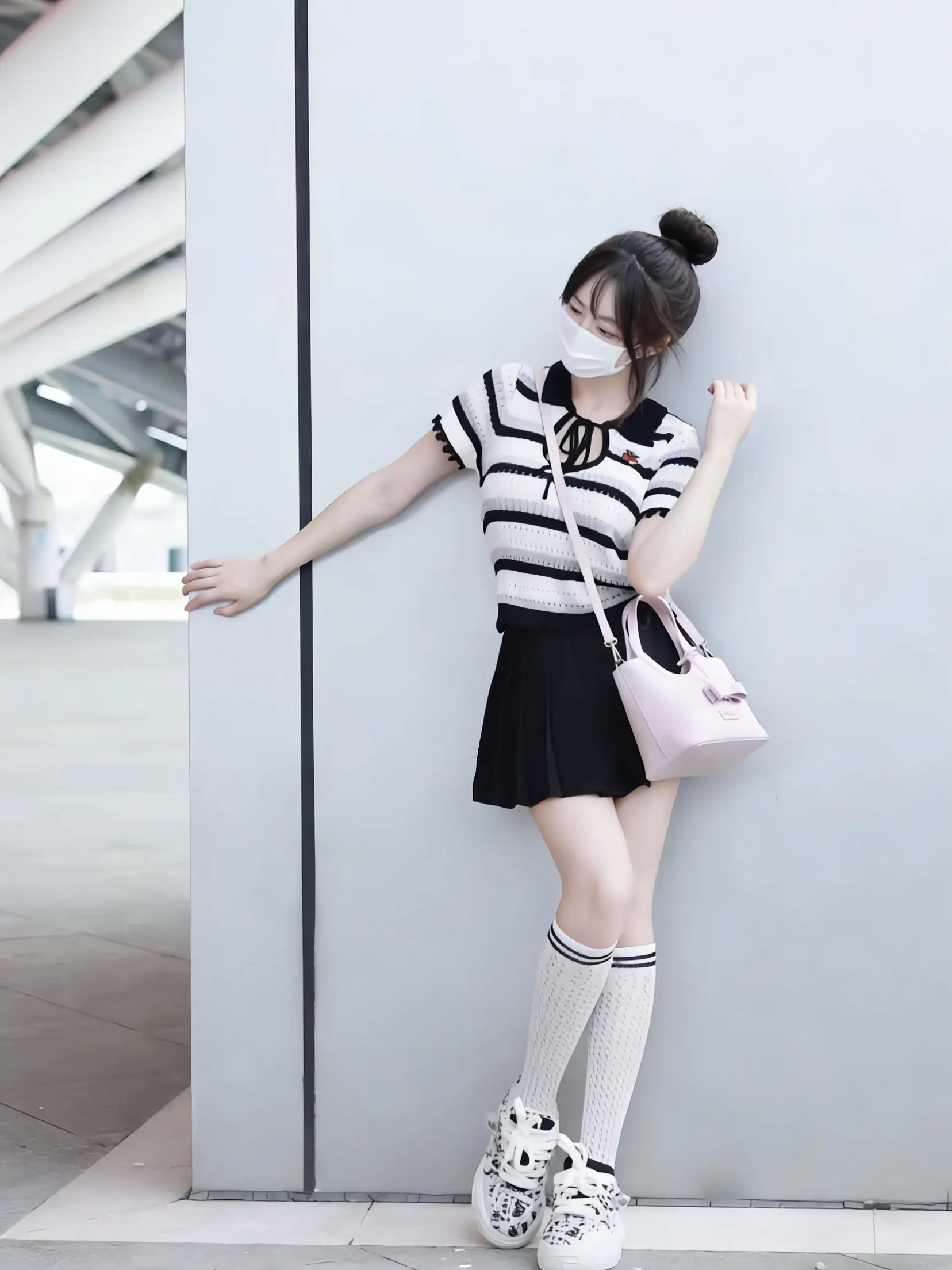 甜妹穿搭天花板|粉包+条纹衫也太温柔了。学院风穿搭真的永远看不腻!🎀