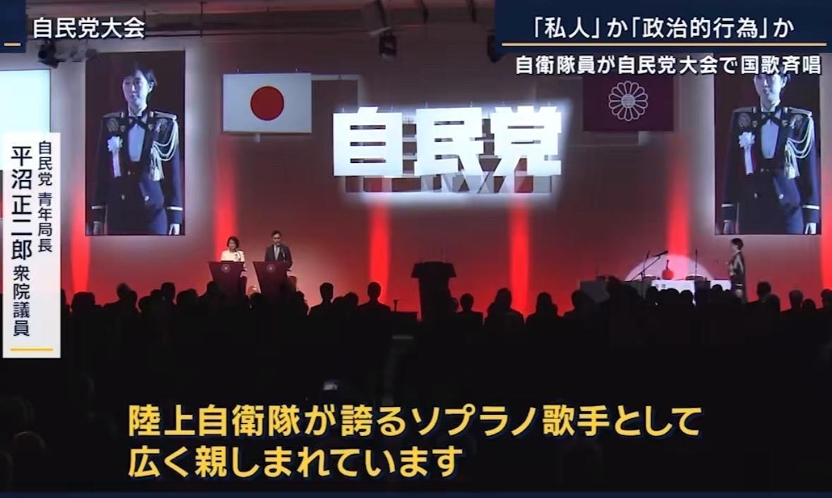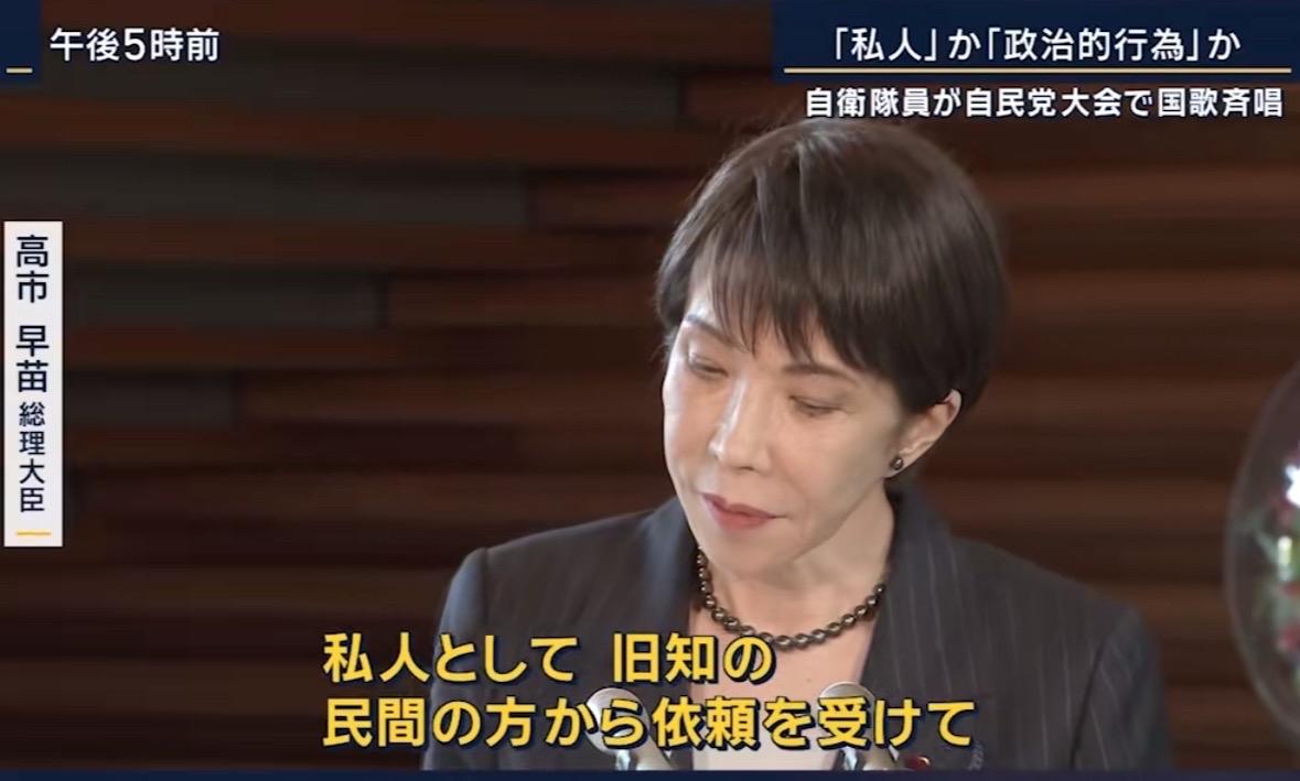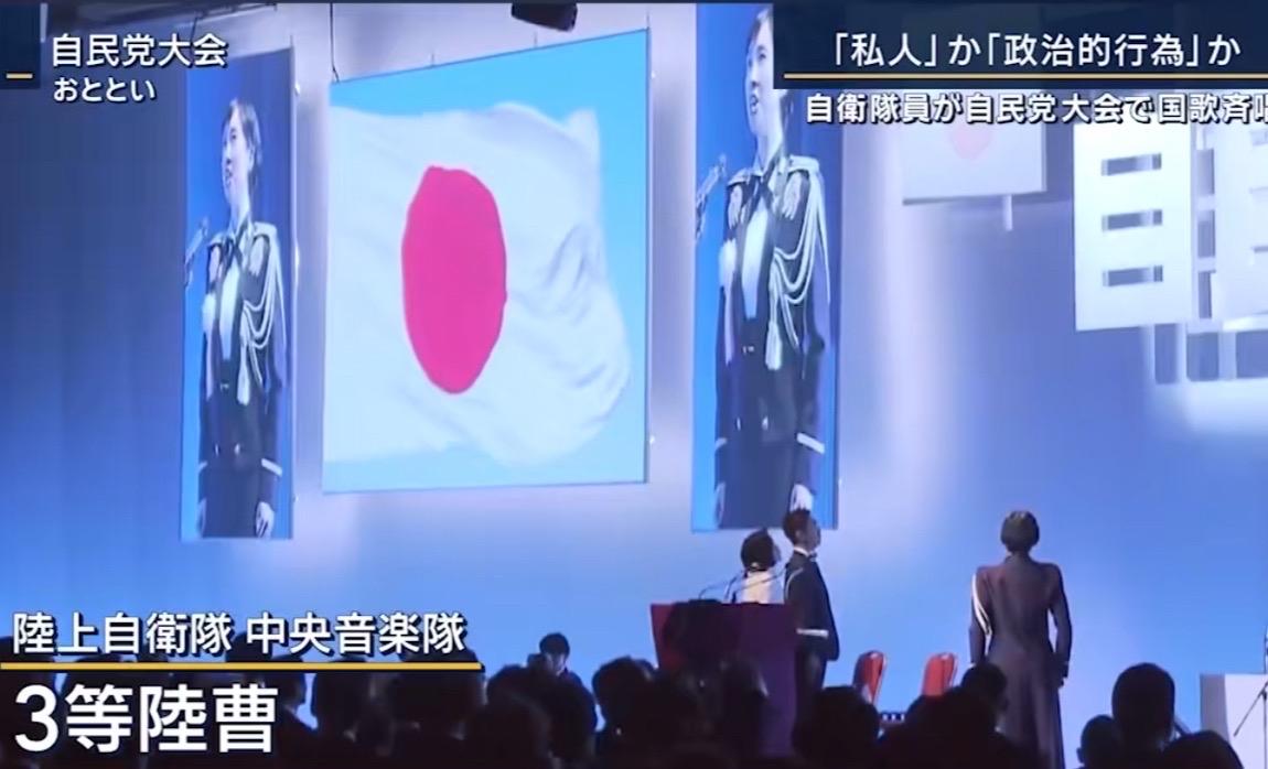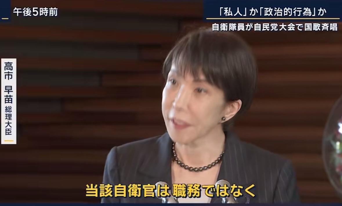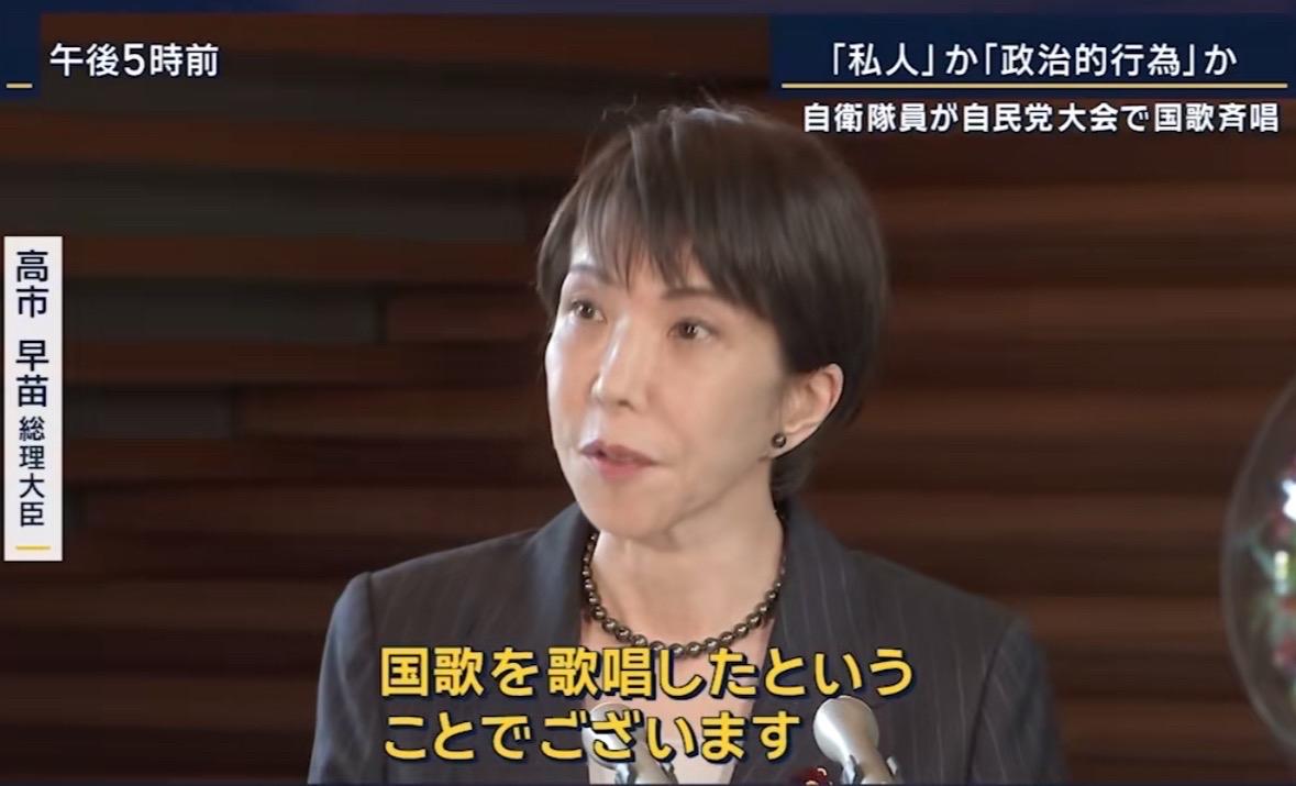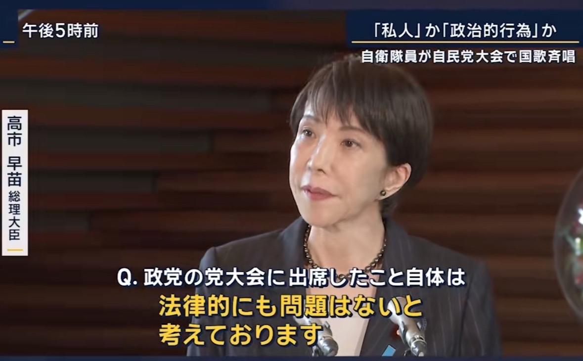 陆上自卫队中央音乐队1等陆曹穿着制服在自民党大会带头齐唱日本国歌,此举违反自卫队法61条“限制政治性行为”。面对在野党的批评,高市狡辩这是私人行为,没有法律问题,小泉明知触法也只能说应该报告。